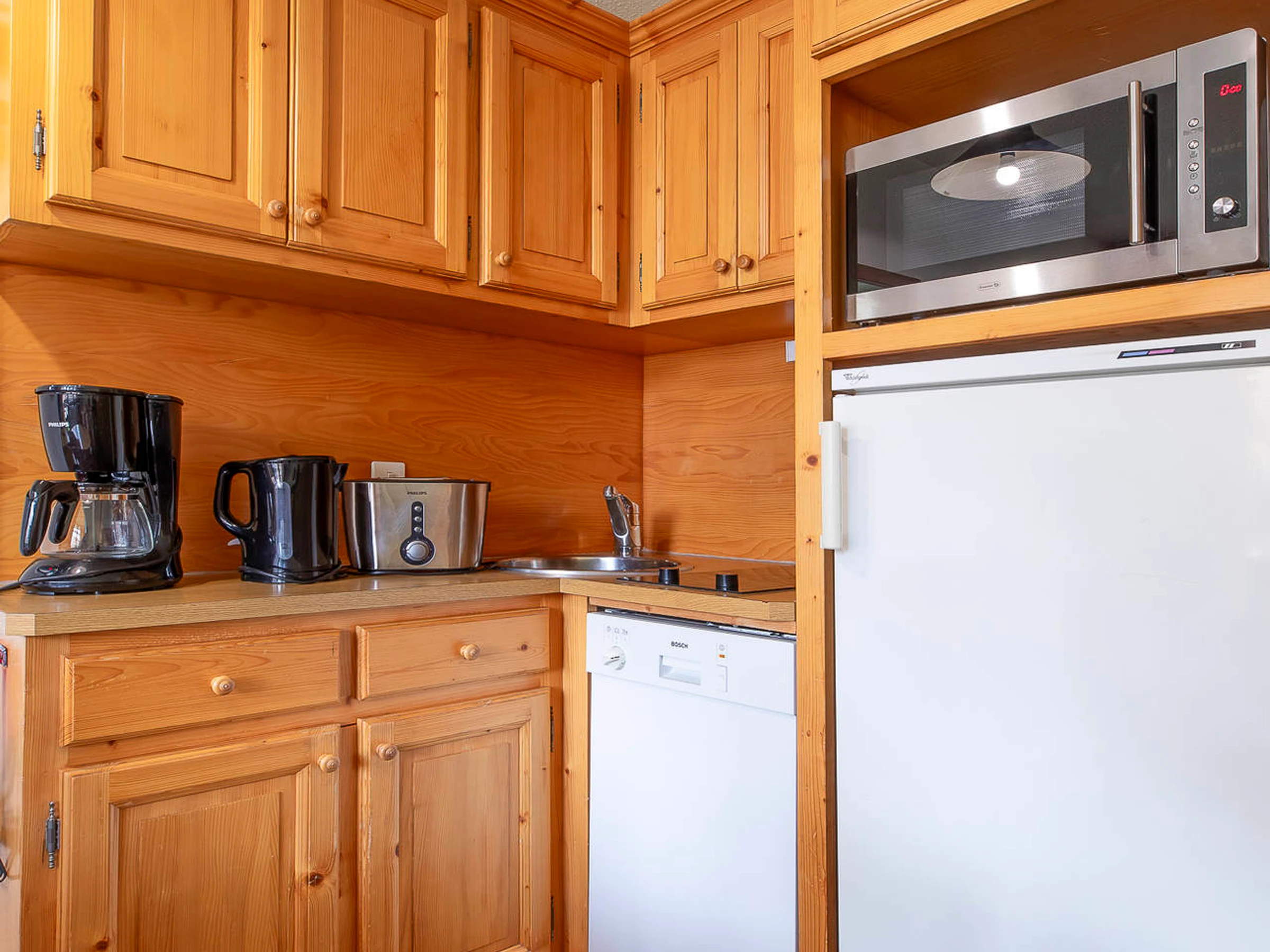 Wohnzimmer: Küche (Mikrowelle, Kochplatten, Kühlschrank, Geschirrspüler) -