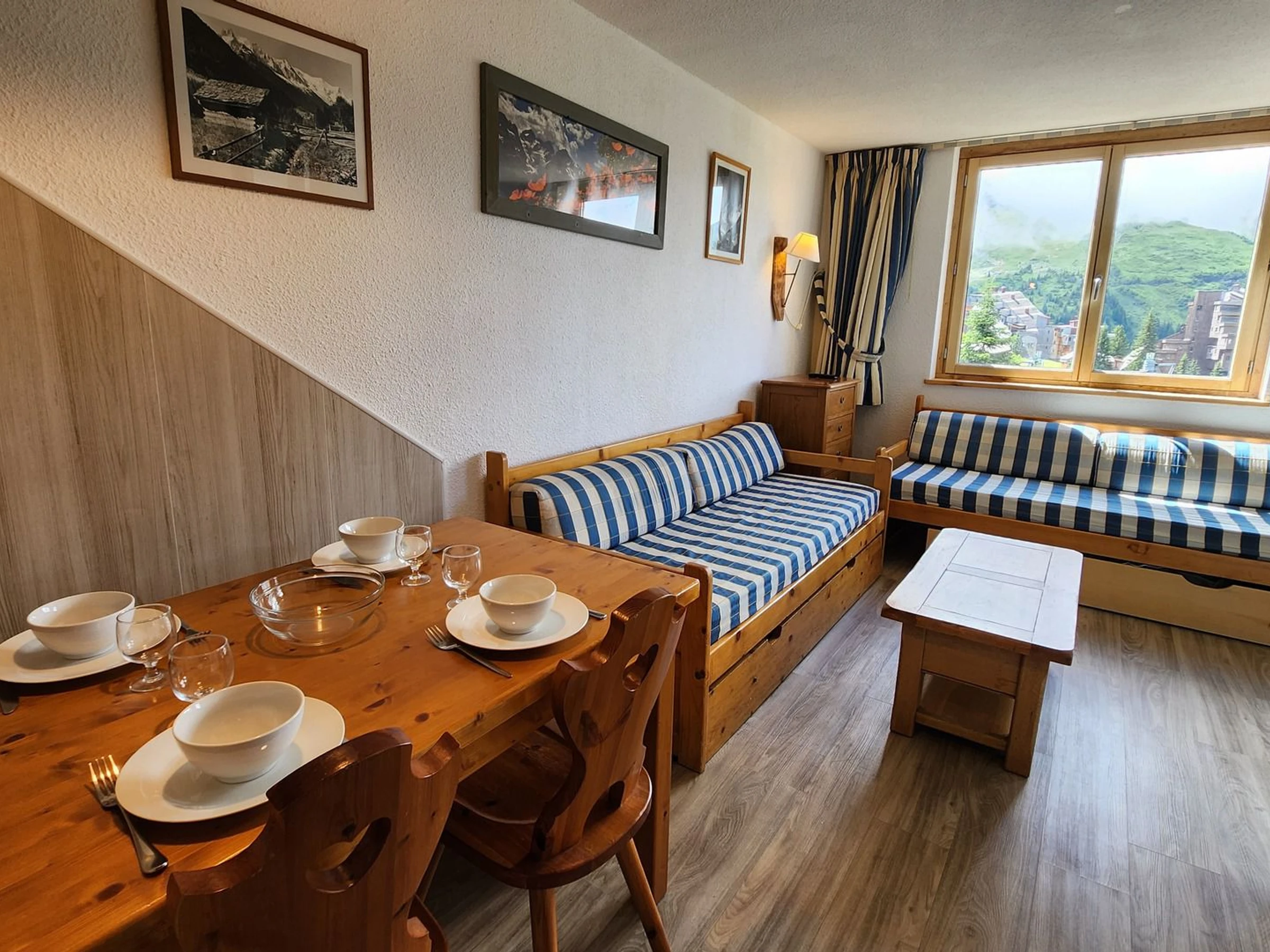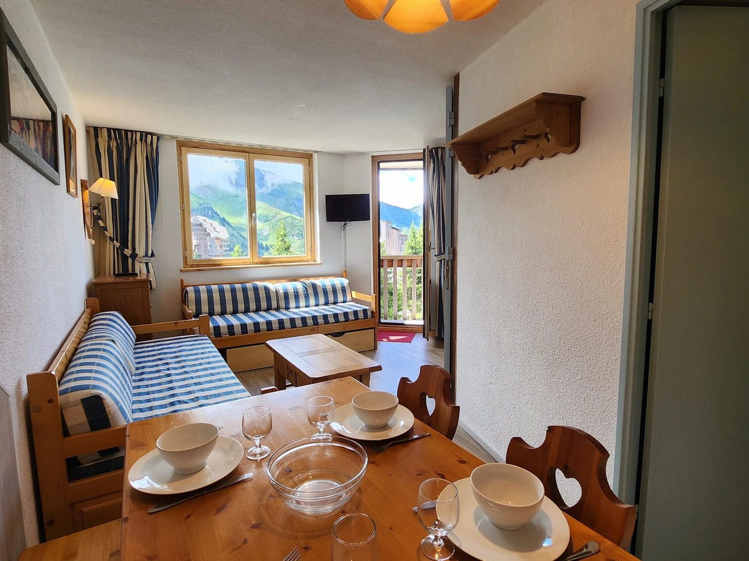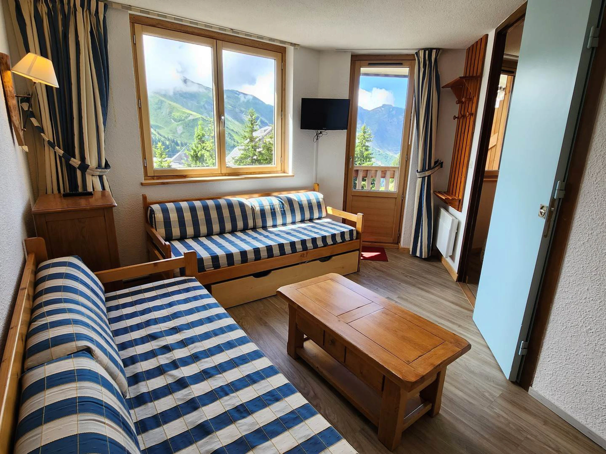 - Wohnzimmer mit Schlafcouch (2 x 90 x 190 cm) und Blick auf den Balkon