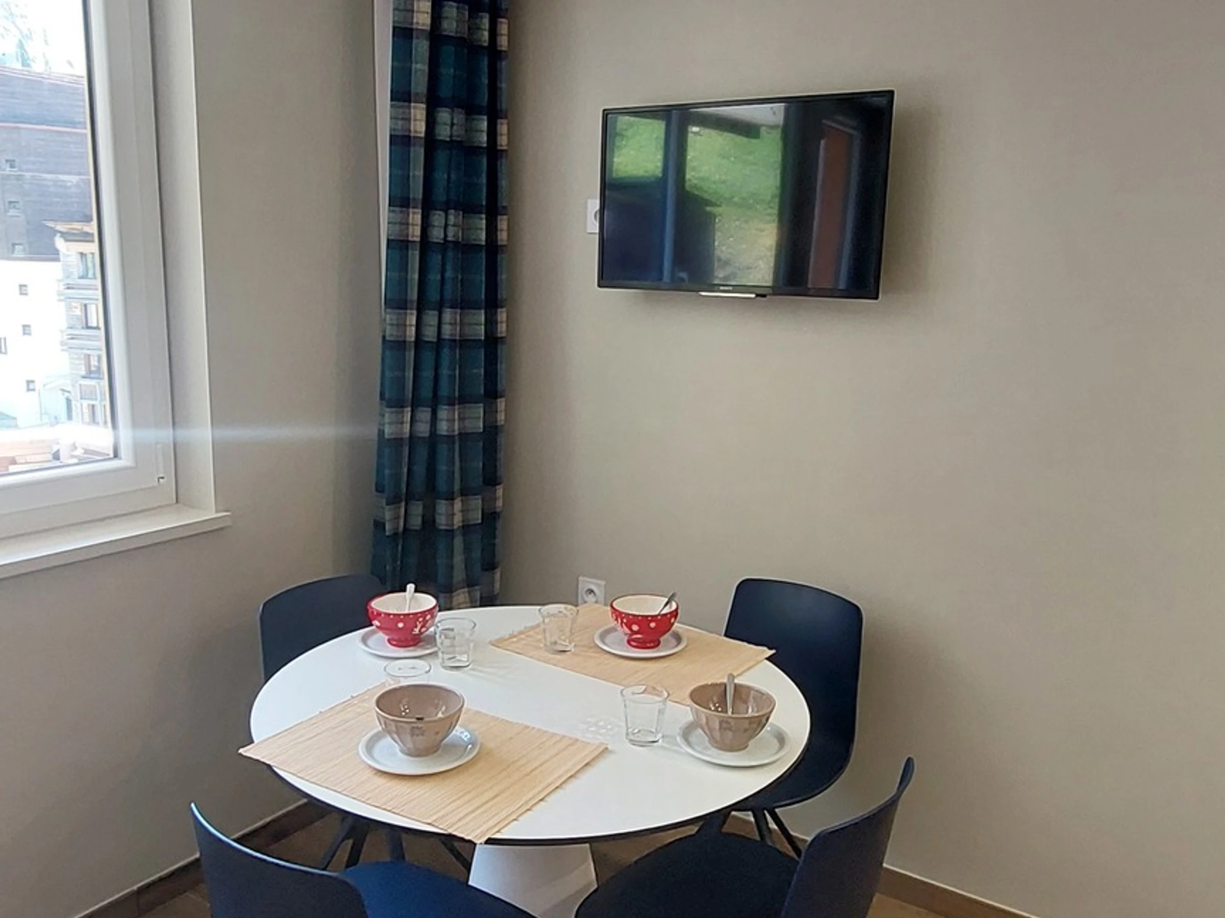 Wohnzimmer: mit Tisch und Stühlen für 4 Personen, einem 160 cm breiten Doppelschlafsofa, einem Fernseher und Zugang zum Ostbalkon