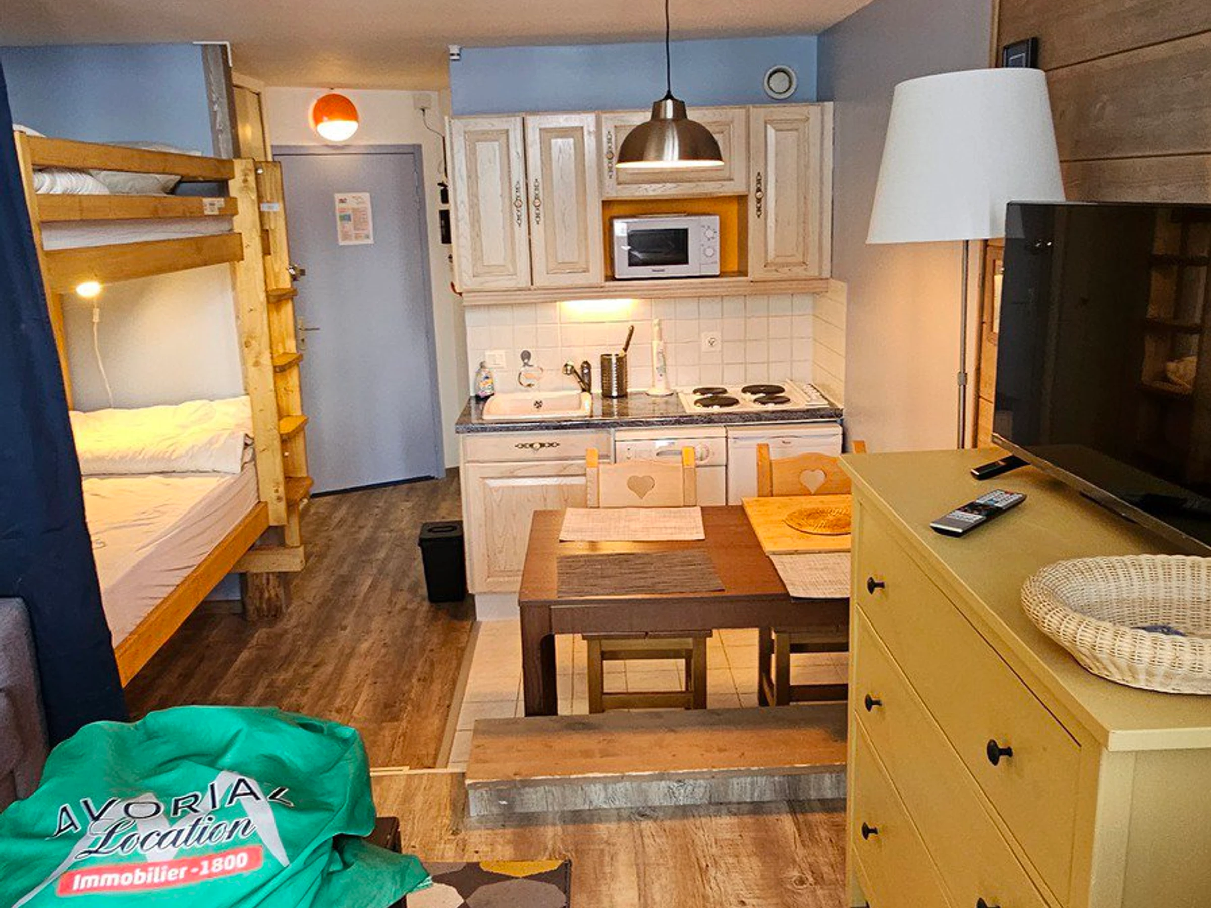 Schlafecke: mit einem Etagenbett für 2 Personen (80 cm) und Bettdecken.