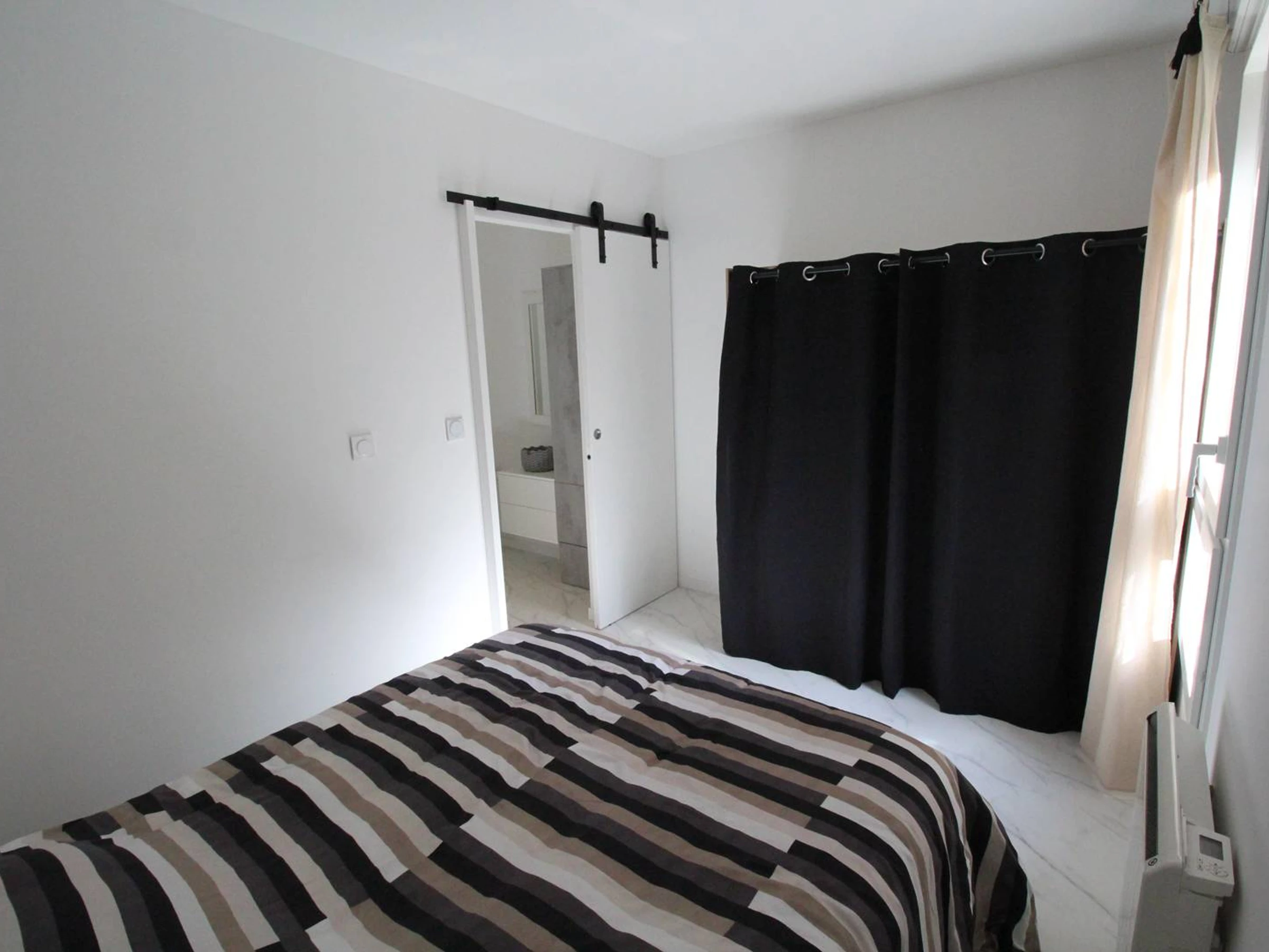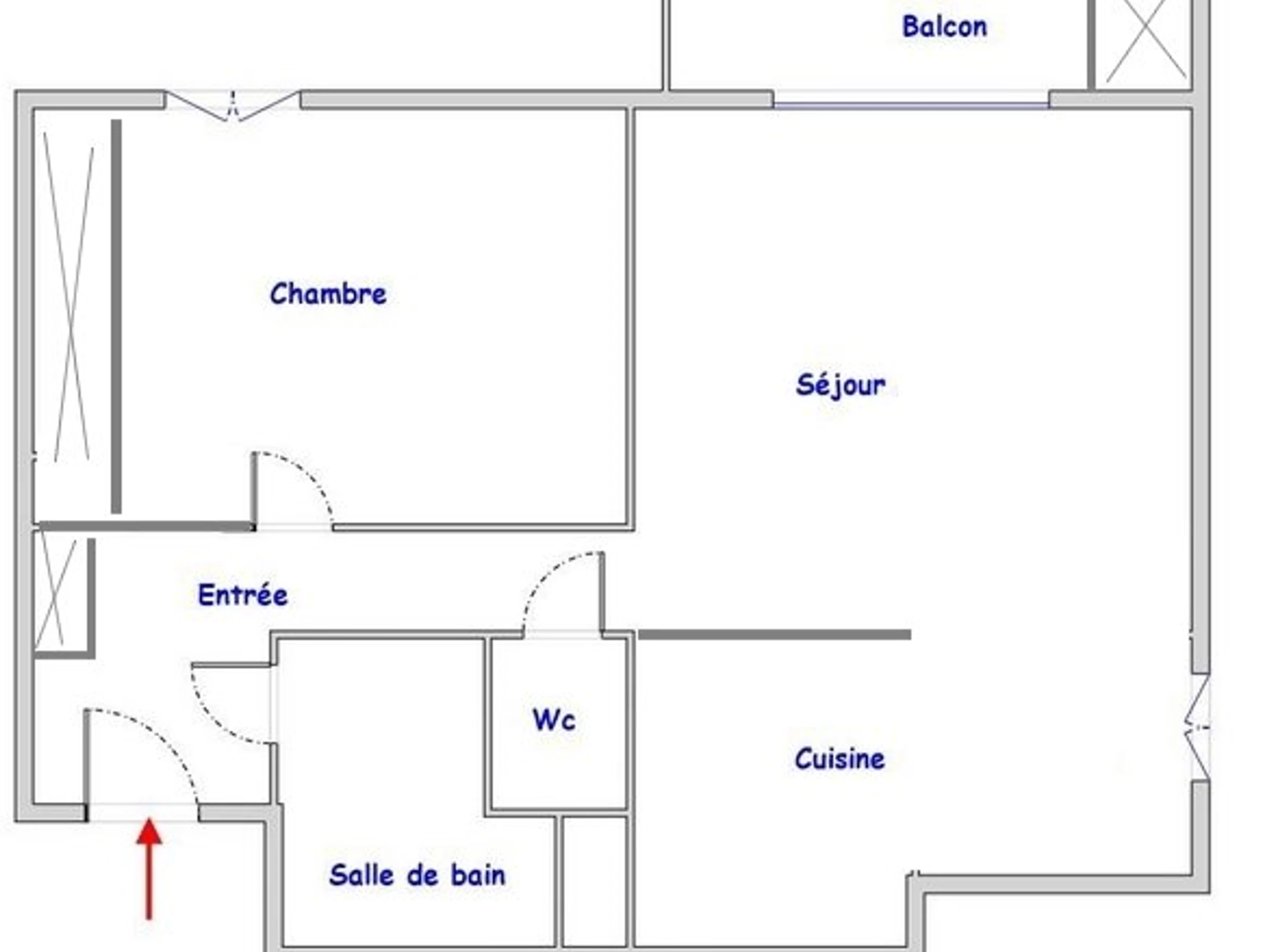 Eingangsbereich mit Abstellraum, Badezimmer mit Dusche und Waschmaschine, separates WC. Ein Schlafzimmer mit Doppelbett (140 cm) und Kleiderschrank.