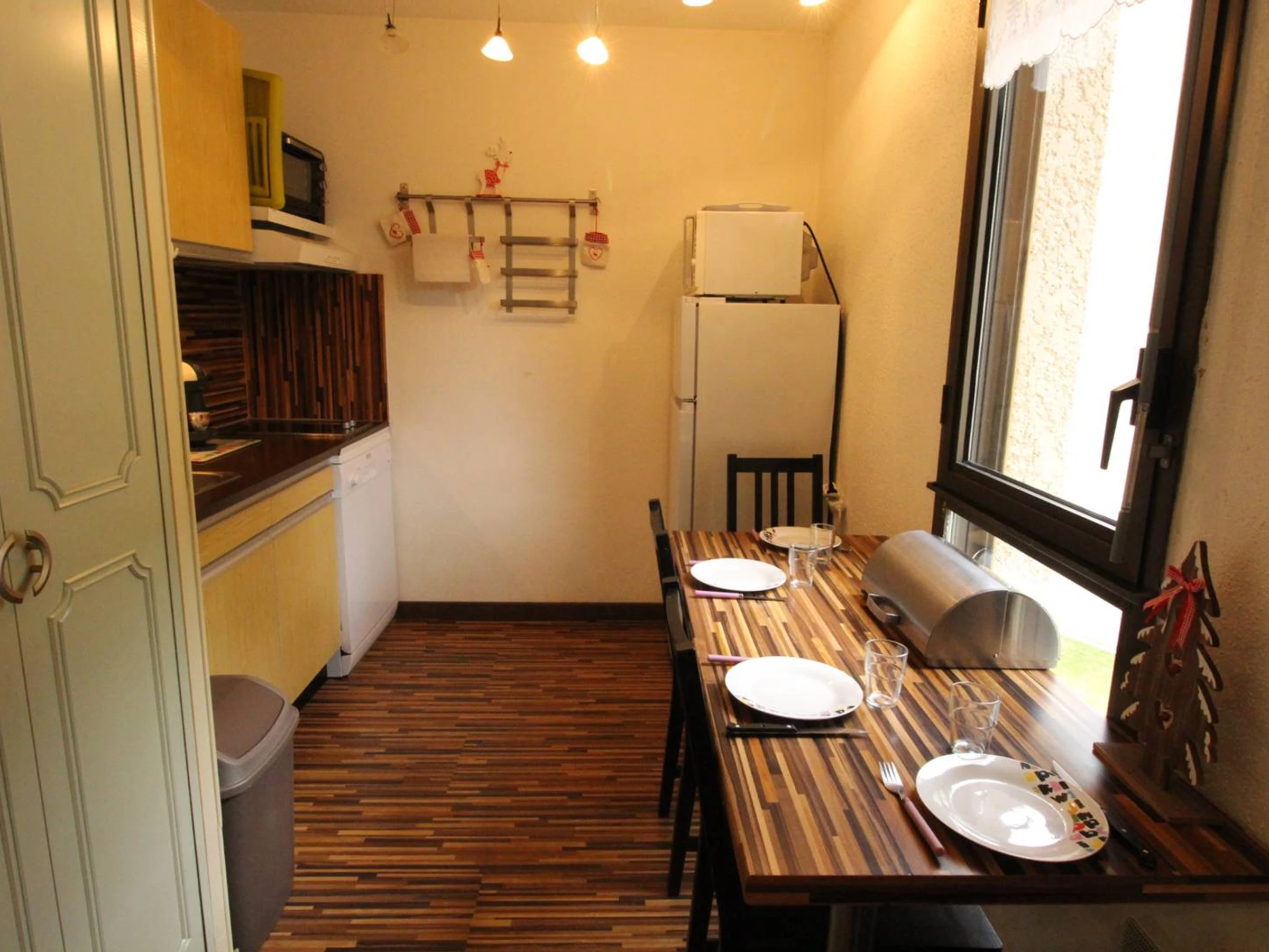 Dieses Studio verfügt über einen Eingang mit zwei Etagenbetten, ein Badezimmer mit Waschmaschine, separates WC, ein nach Westen ausgerichtetes Wohnzimmer mit einem 140 cm breiten Klappbett für zwei Personen, Fernseher, eine ausgestattete Küchenzeile mit Zugang zum Wohnzimmer (Dolce Gusto-Kaffeemaschine , Backofen, Mikrowelle, Geschirrspüler).