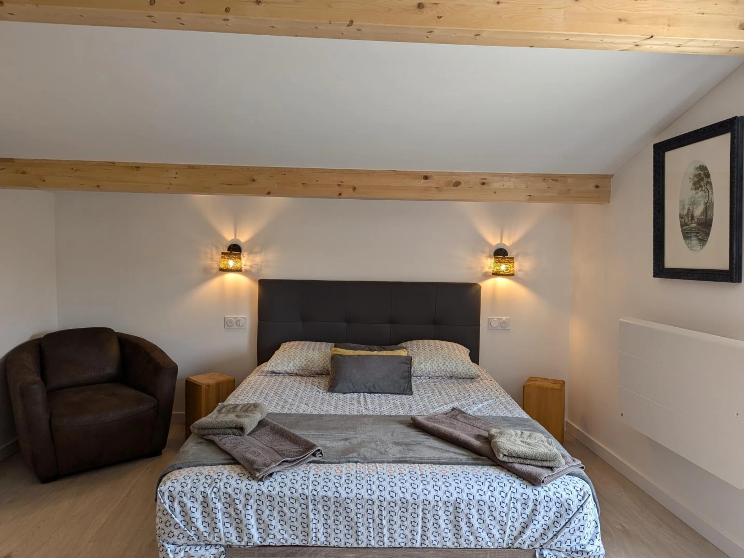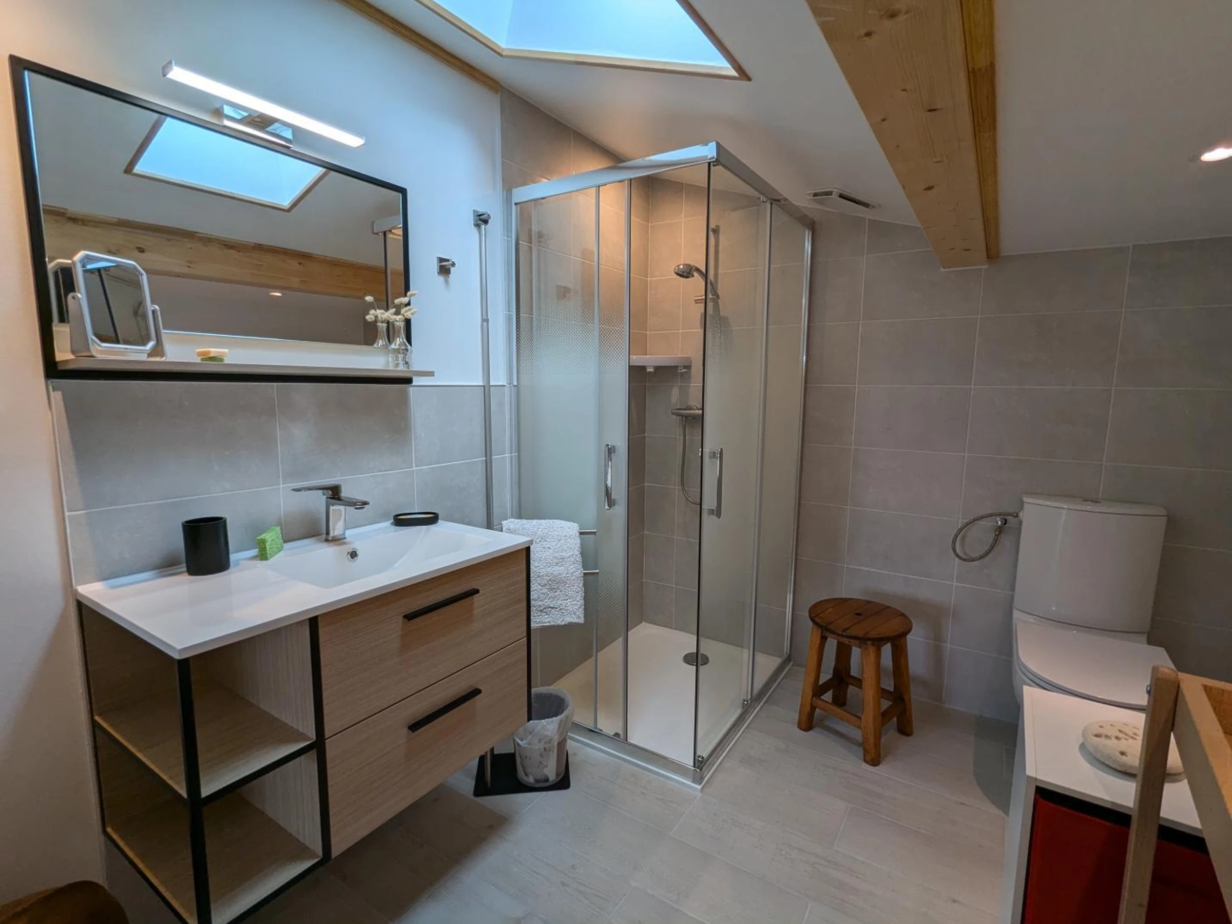Zugang zum Obergeschoss über eine relativ steile Treppe: ein Schlafzimmer mit einem 140 x 190 cm großen Doppelbett und eigenem Bad, ein zweites Schlafzimmer mit einem 160 x 200 cm großen Doppelbett und eigenem Bad und WC. Erfrischungen sind im Obergeschoss erhältlich.