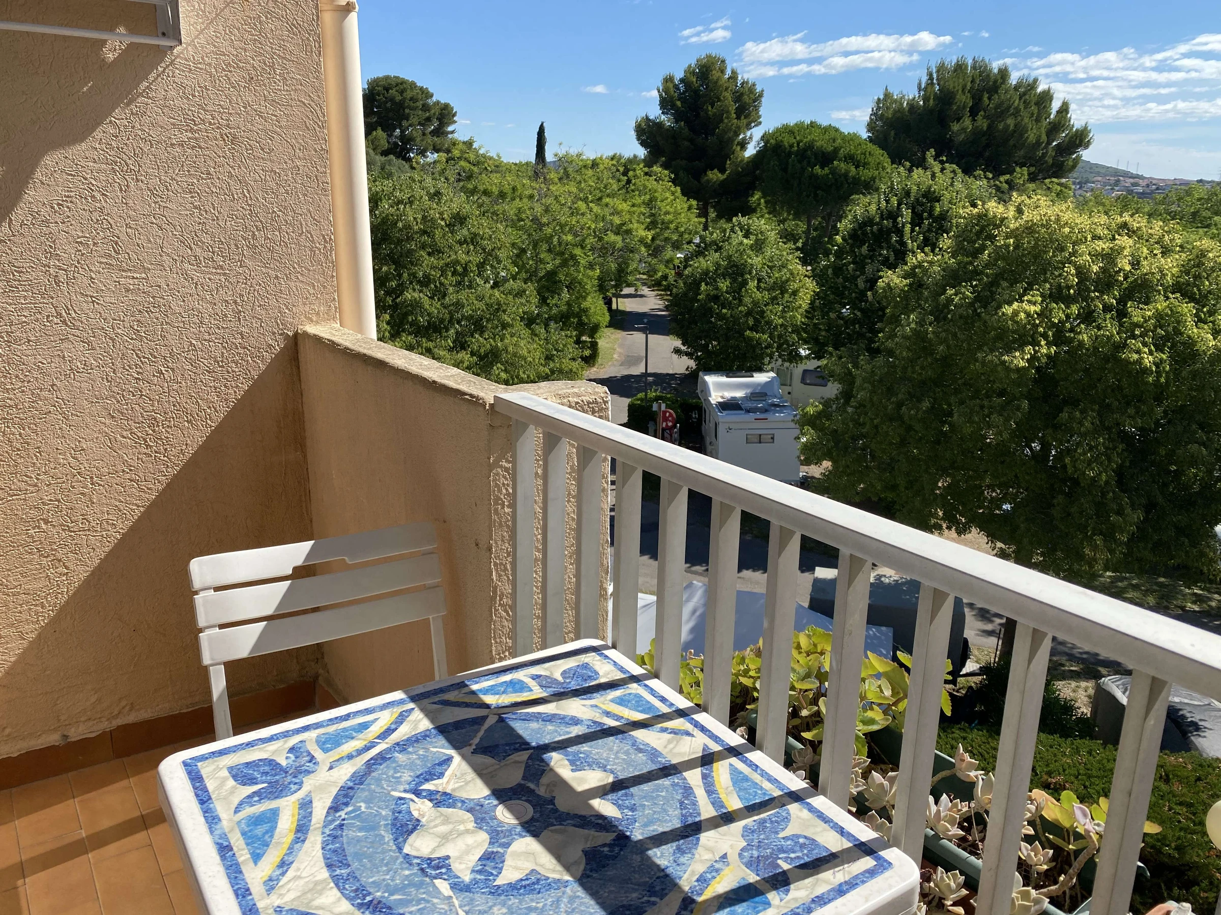 Die Wohnung besteht aus einem Wohnzimmer mit Küchenbereich, der auf einen Balkon mit freiem Blick auf die Lagune von Thau (mit Gartenmöbeln) führt, einem Zwischengeschoss mit Schlafbereich (1 Bett 140x190), einem Badezimmer mit elektrischem Handtuchtrockner, Duschkabine und WC .