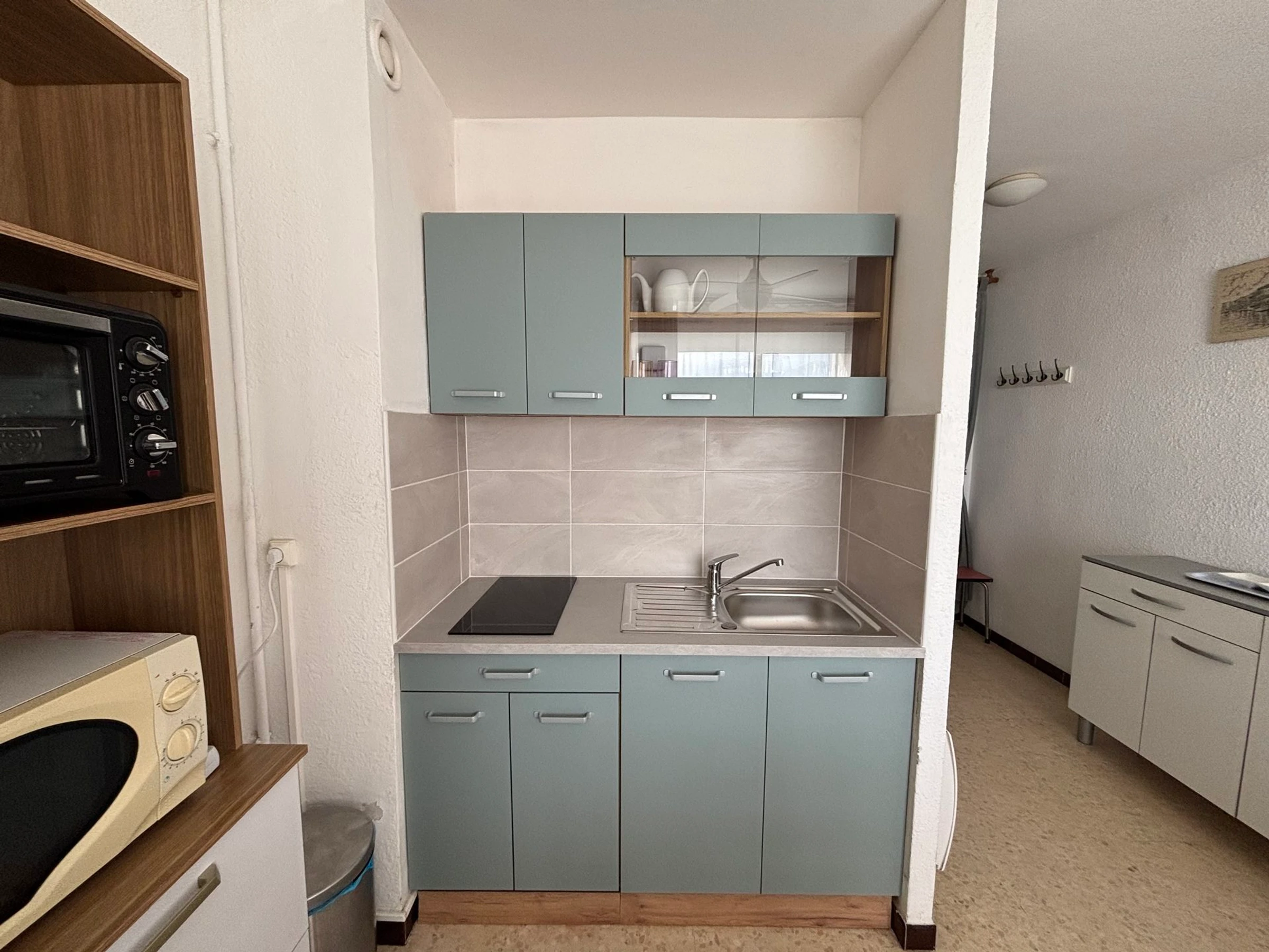 et balcon avec shop. Bestehend aus einem Aufenthalt mit Fernseher und einem Kanapee, einer ausgestatteten und gepflegten Küche mit Glaskeramikplatten, einem Kühlschrank, einem Kühlschrank, einem Mini-Four und einer Mikrowelle. Der Raum des Wassers ist mit Dusche und Toiletten ausgestattet. Die Münzzeit beträgt 1 Stunde und 140.