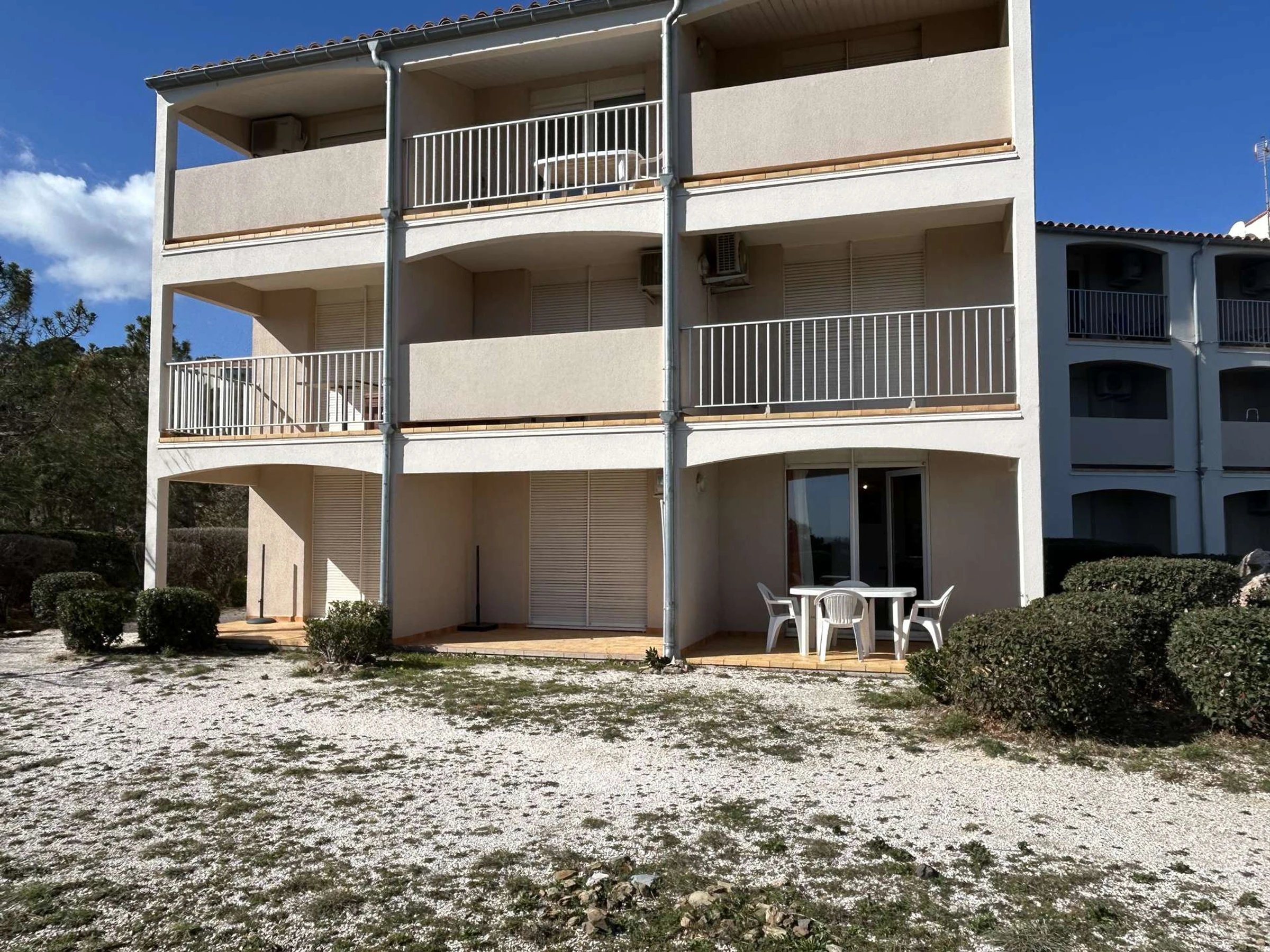 Diese Erdgeschosswohnung verfügt über ein Wohnzimmer, eine voll ausgestattete Küchenzeile, ein Schlafzimmer mit zwei Einzelbetten, ein Duschbad, ein separates WC und eine Terrasse mit Gartenmöbeln.