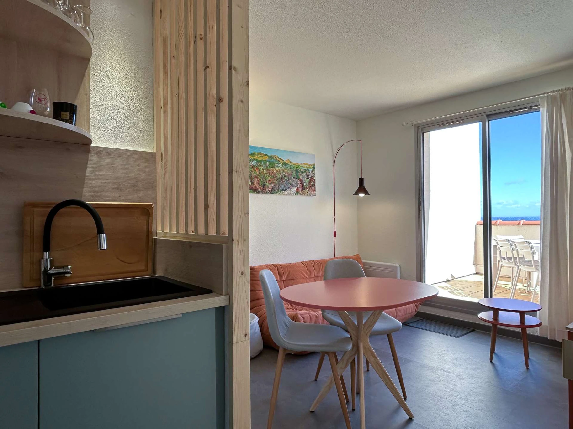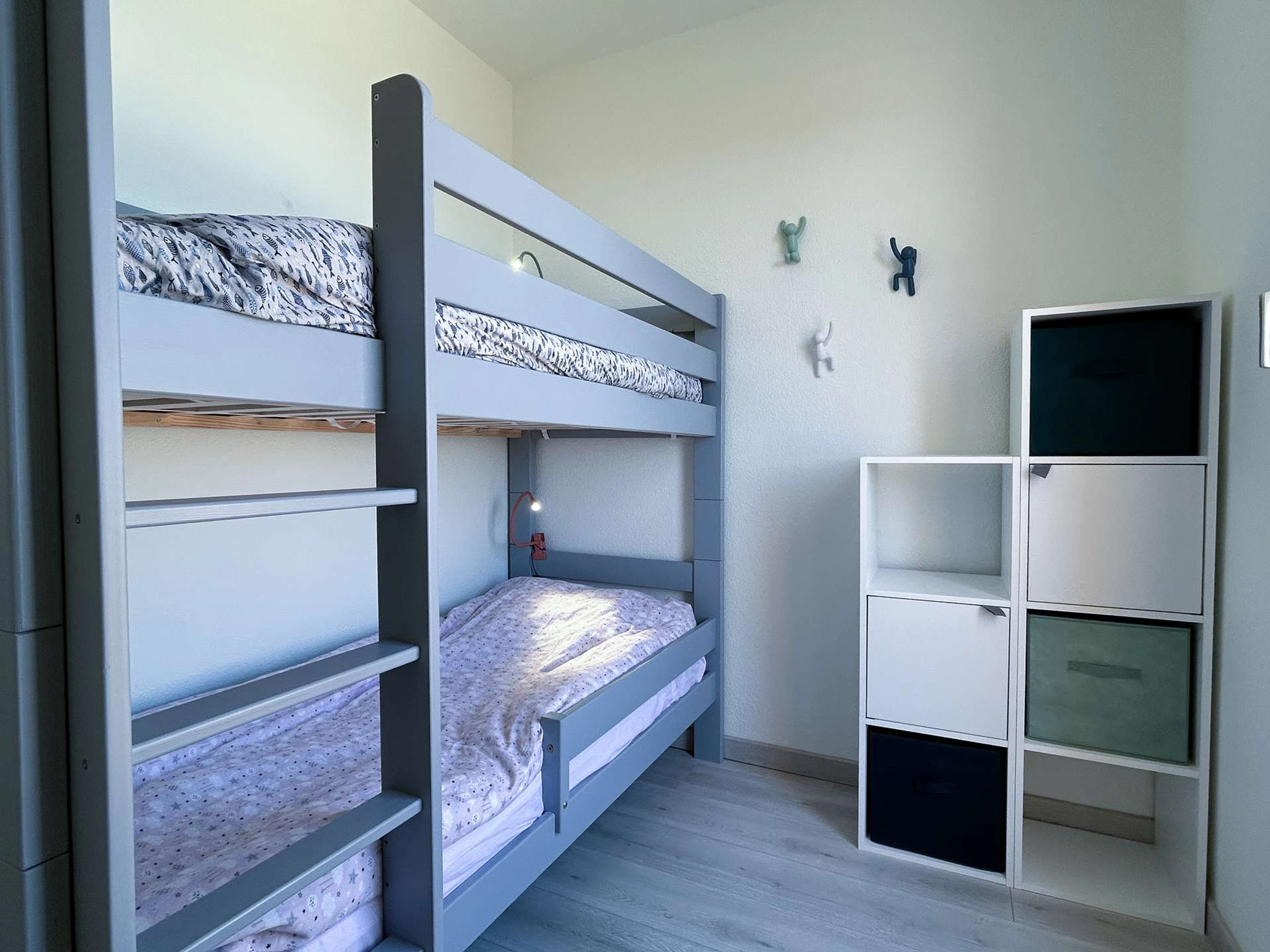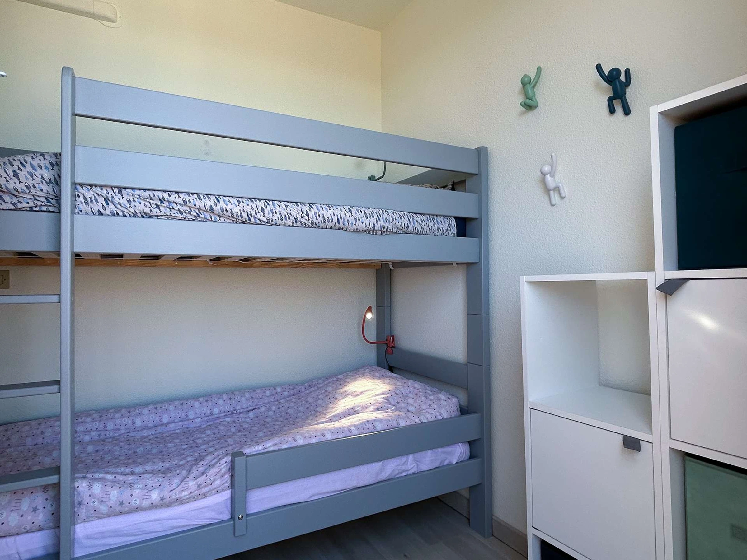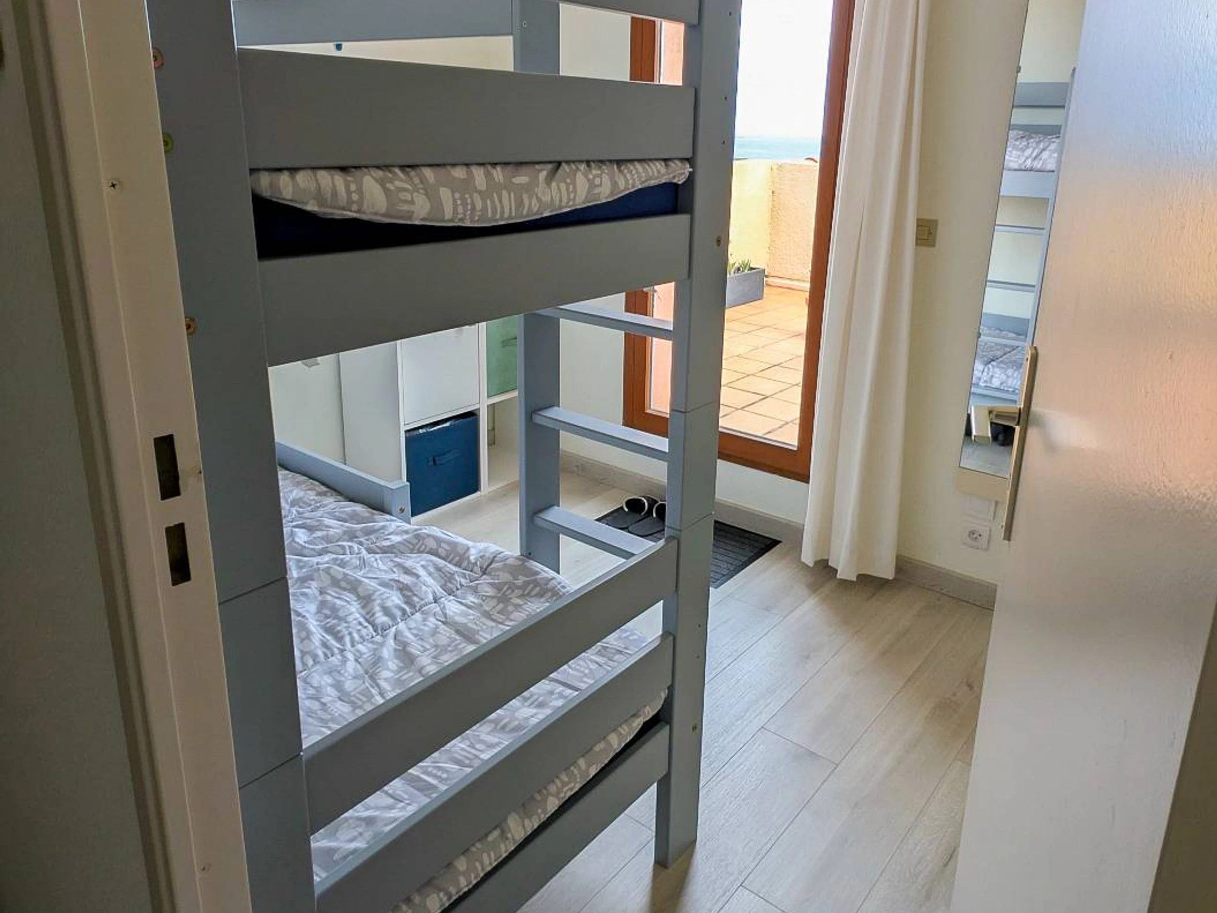 In ruhiger Lage, nur wenige Schritte vom Hafen und Stadtzentrum entfernt, bietet die Résidence Les Hauts du Fontaulé komfortable Apartments mit Terrassen und Meerblick. Dieses wunderschöne, 2025 komplett renovierte Maisonette-Apartment empfängt Sie in einem modernen und hellen Ambiente. Im Erdgeschoss befinden sich ein Wohnzimmer mit voll ausgestatteter Küchenzeile und Zugang zu einer schönen Terrasse mit Meerblick, ein Schlafzimmer mit zwei Einzelbetten (90 x 200 cm, die zu einem Kingsize-Bett zusammengestellt werden können) sowie ein Duschbad mit WC. Im Obergeschoss befindet sich ein Kinderzimmer mit Etagenbetten und Zugang zu einer zweiten Terrasse sowie ein weiteres Schlafzimmer mit zwei Einzelbetten (ebenfalls zu einem Kingsize-Bett zusammengestellt). Ein privater Parkplatz steht Ihnen zur Verfügung. Diese Unterkunft ist als möbliertes 3-Sterne-Ferienapartment klassifiziert.