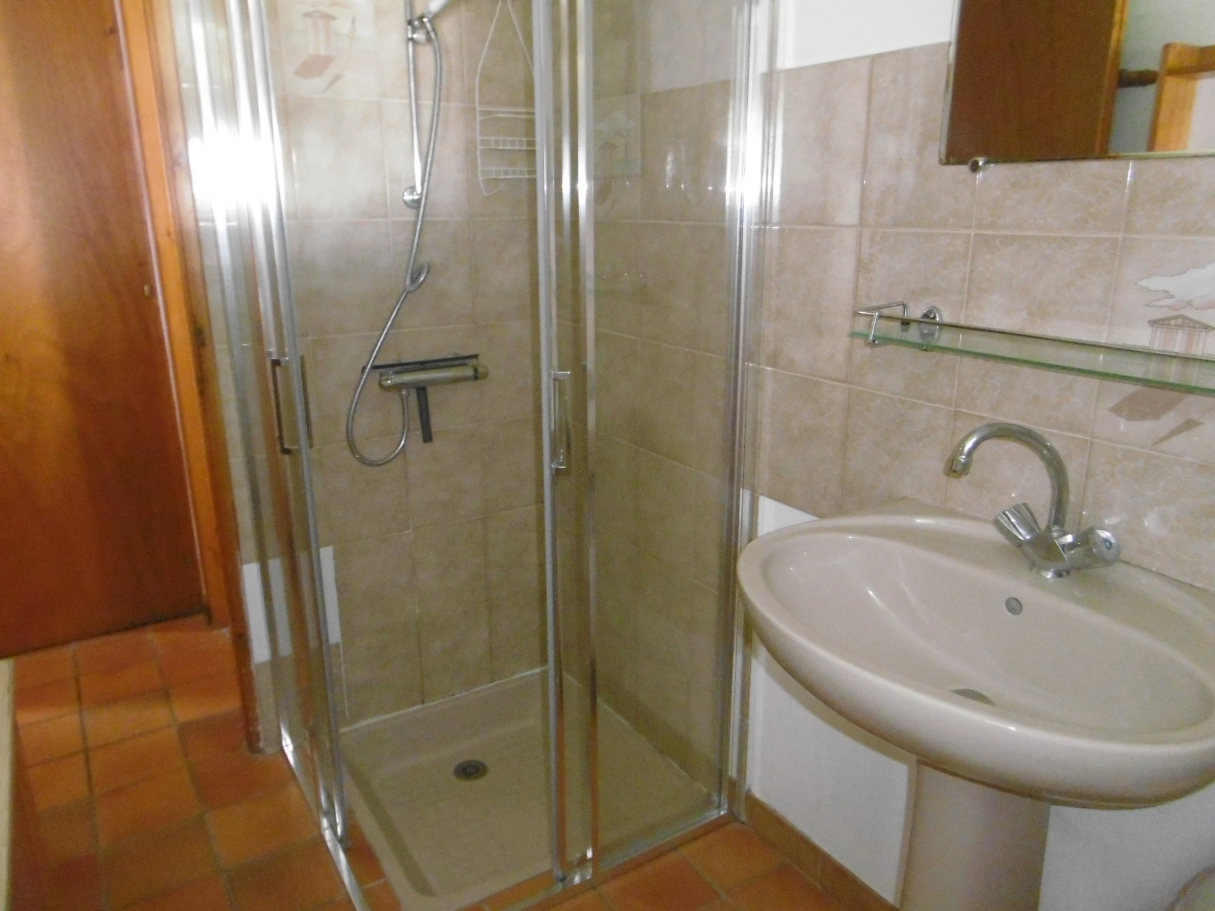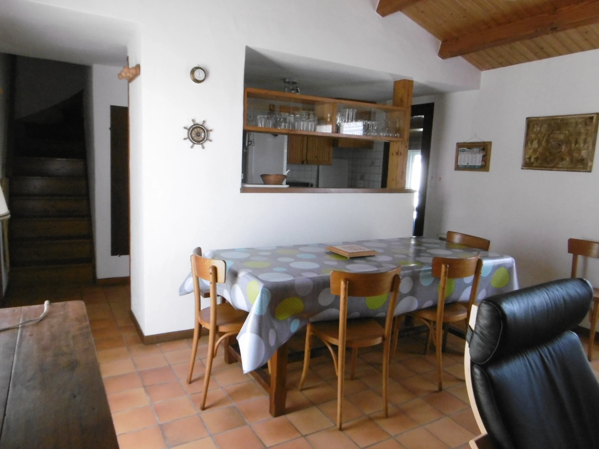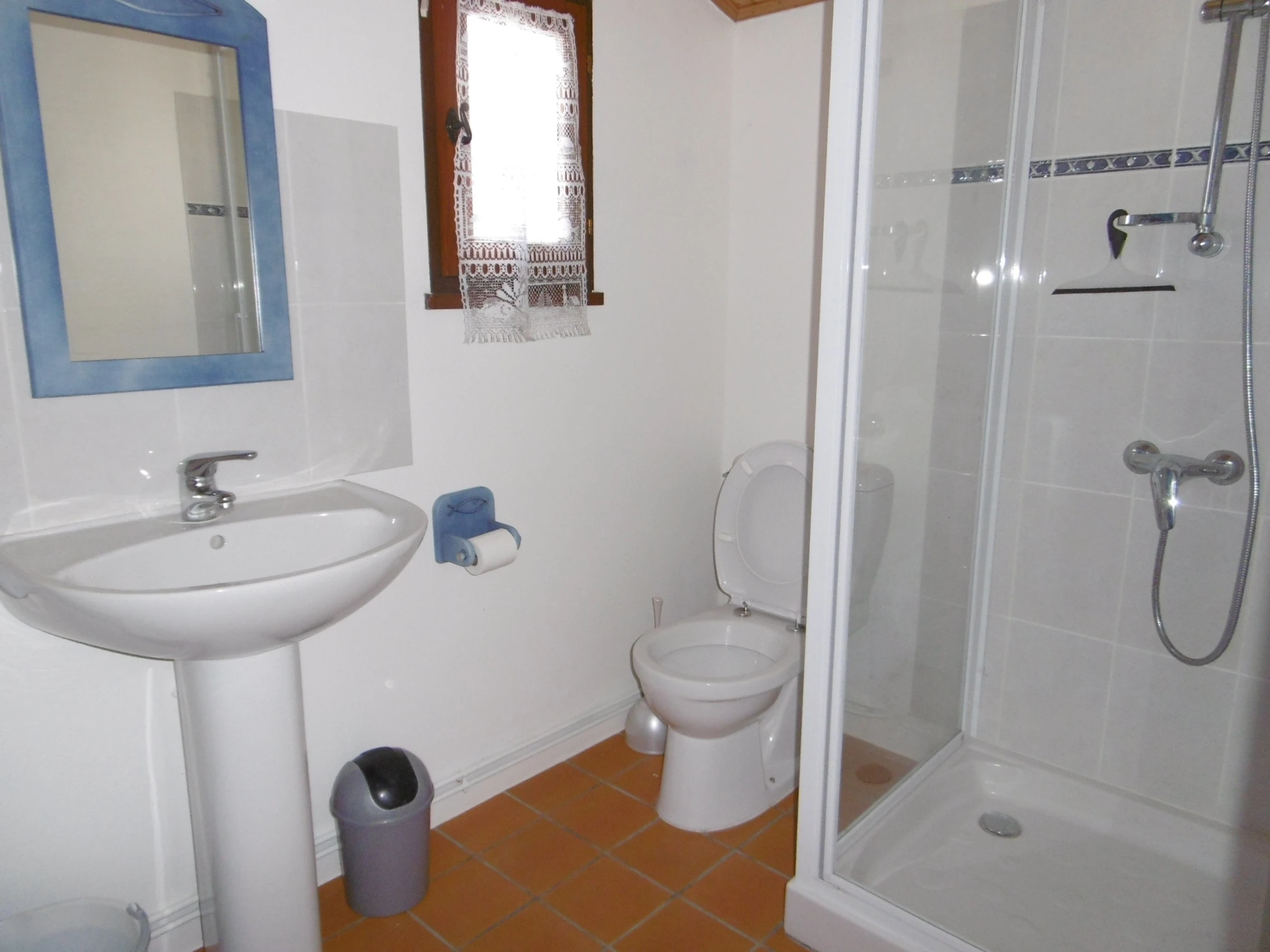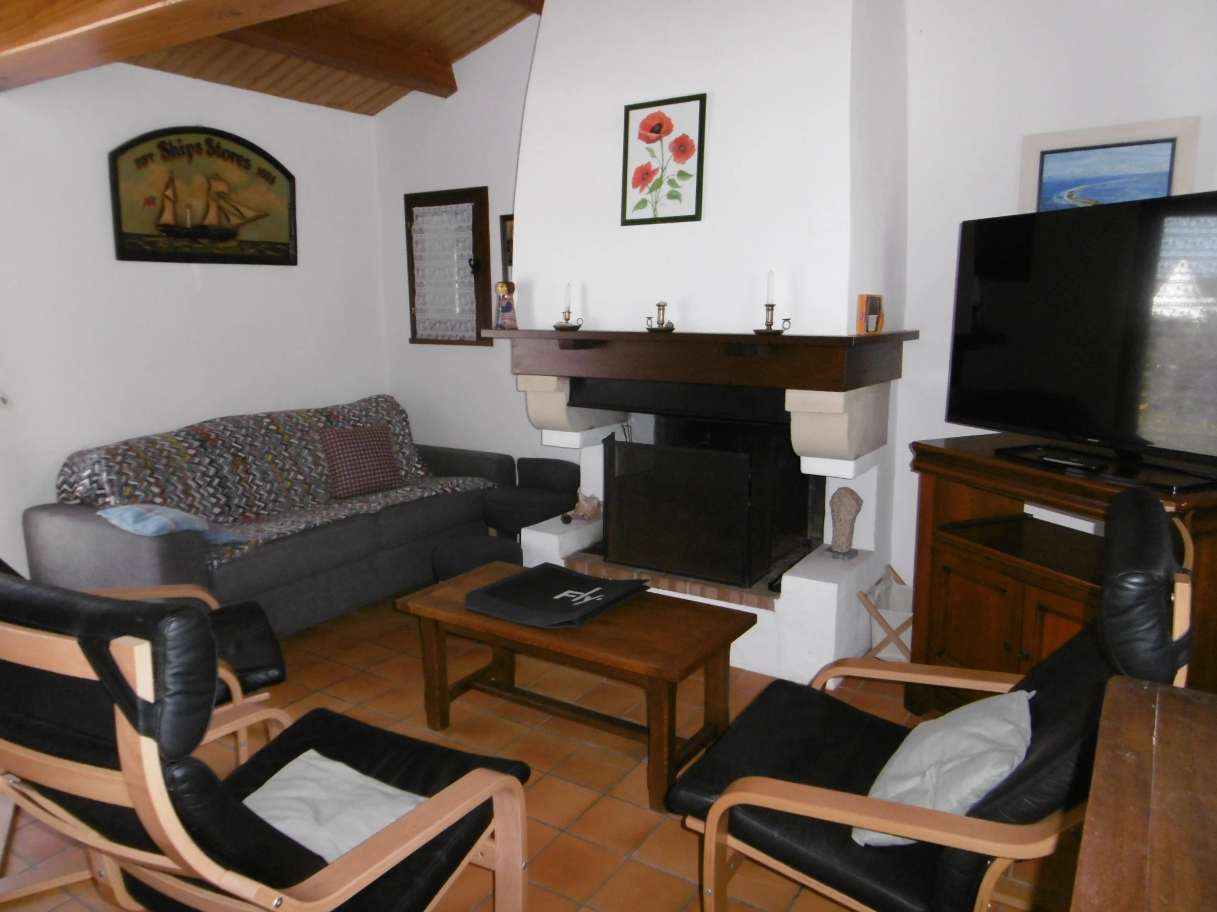Komfortables Haus 75 m² – 8/9 Personen – bestehend im Erdgeschoss: Wohnzimmer/eingebaute Küchenzeile, Sitzecke mit Kamin, zwei Schlafzimmer mit jeweils einem 140 cm breiten Bett, ein Schlafzimmer mit einem 80 cm breiten Ausziehbett, Duschraum, WC, Duschraum mit WC (Zugang über geschlossenen Innenhof). Obergeschoss: ein Schlafzimmer mit einem 140 cm breiten Bett und einem 90 cm breiten Bett, Badezimmer mit Waschbecken.