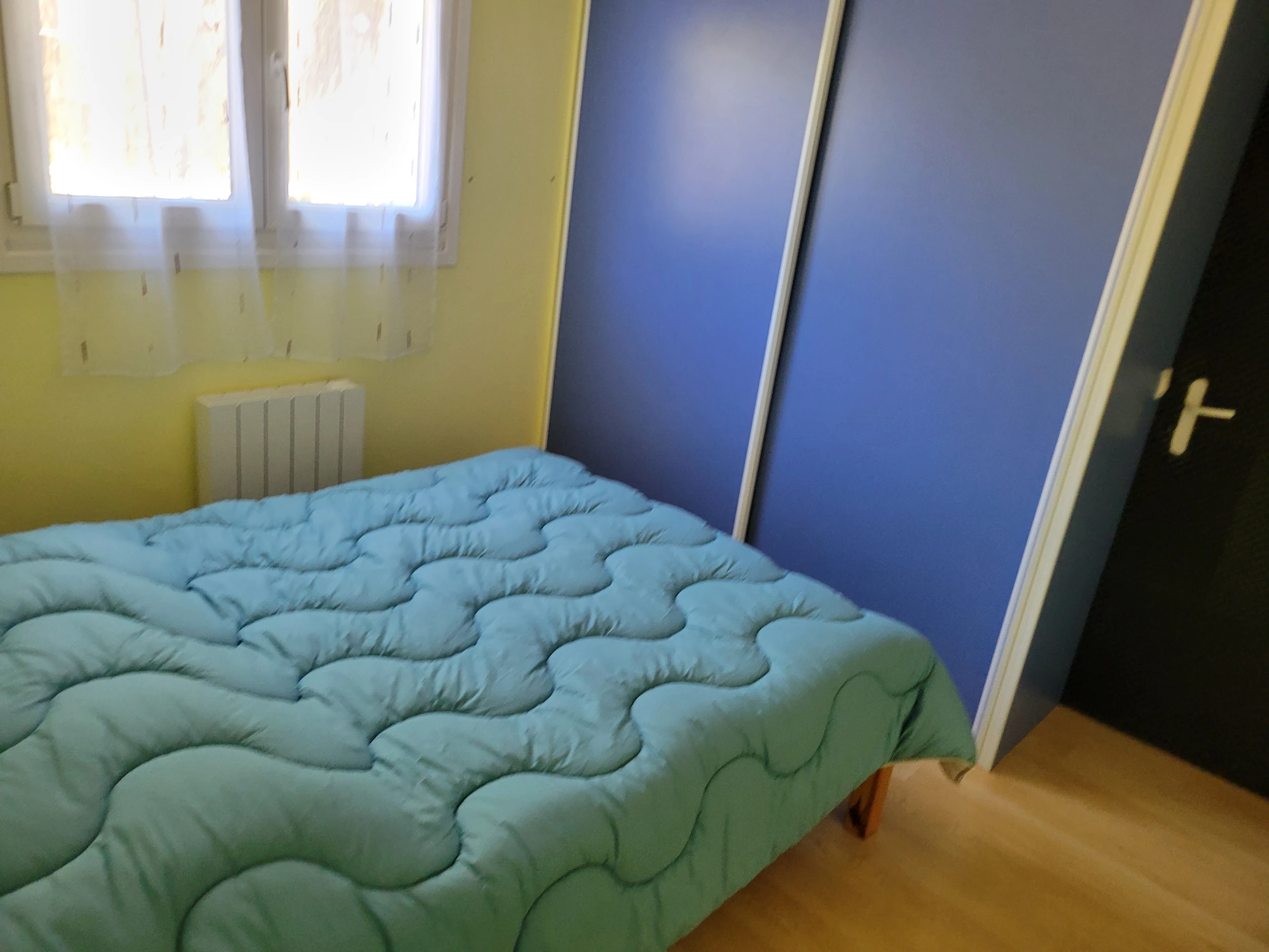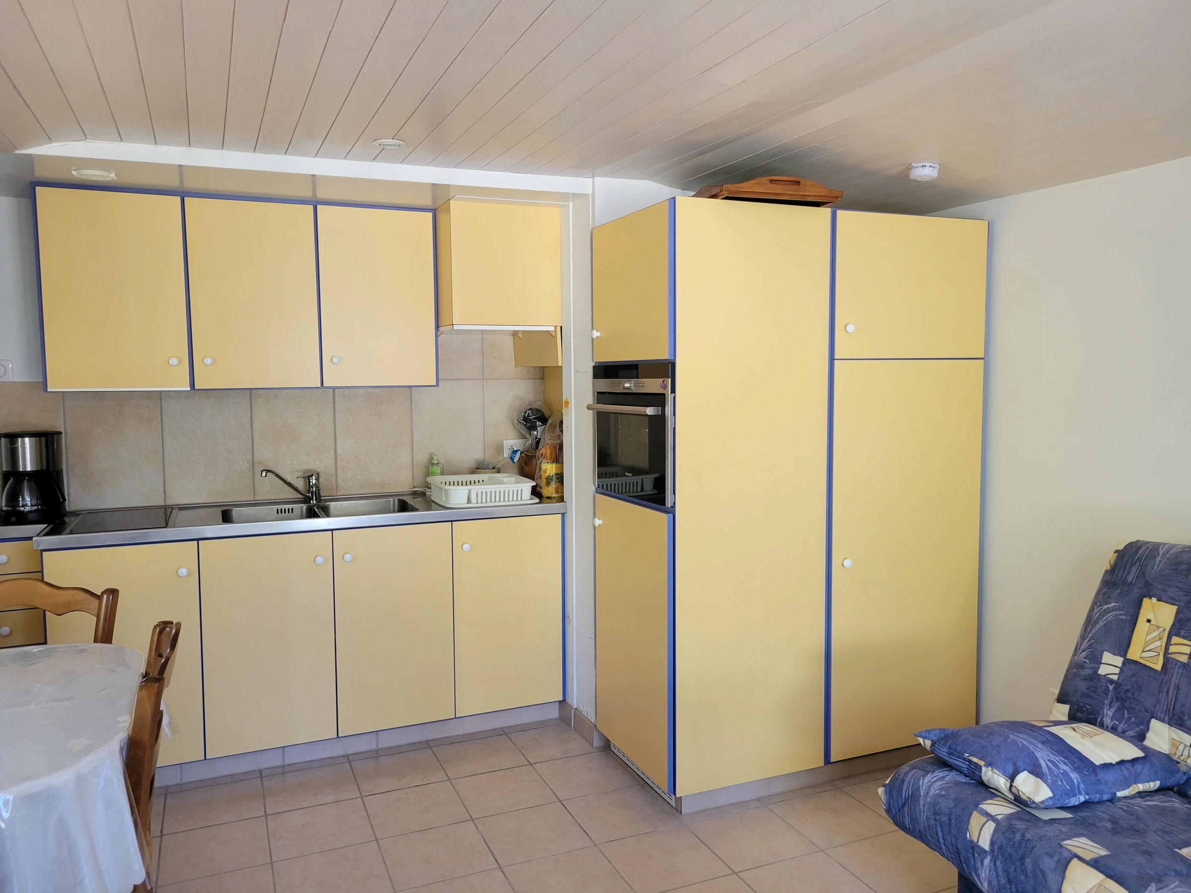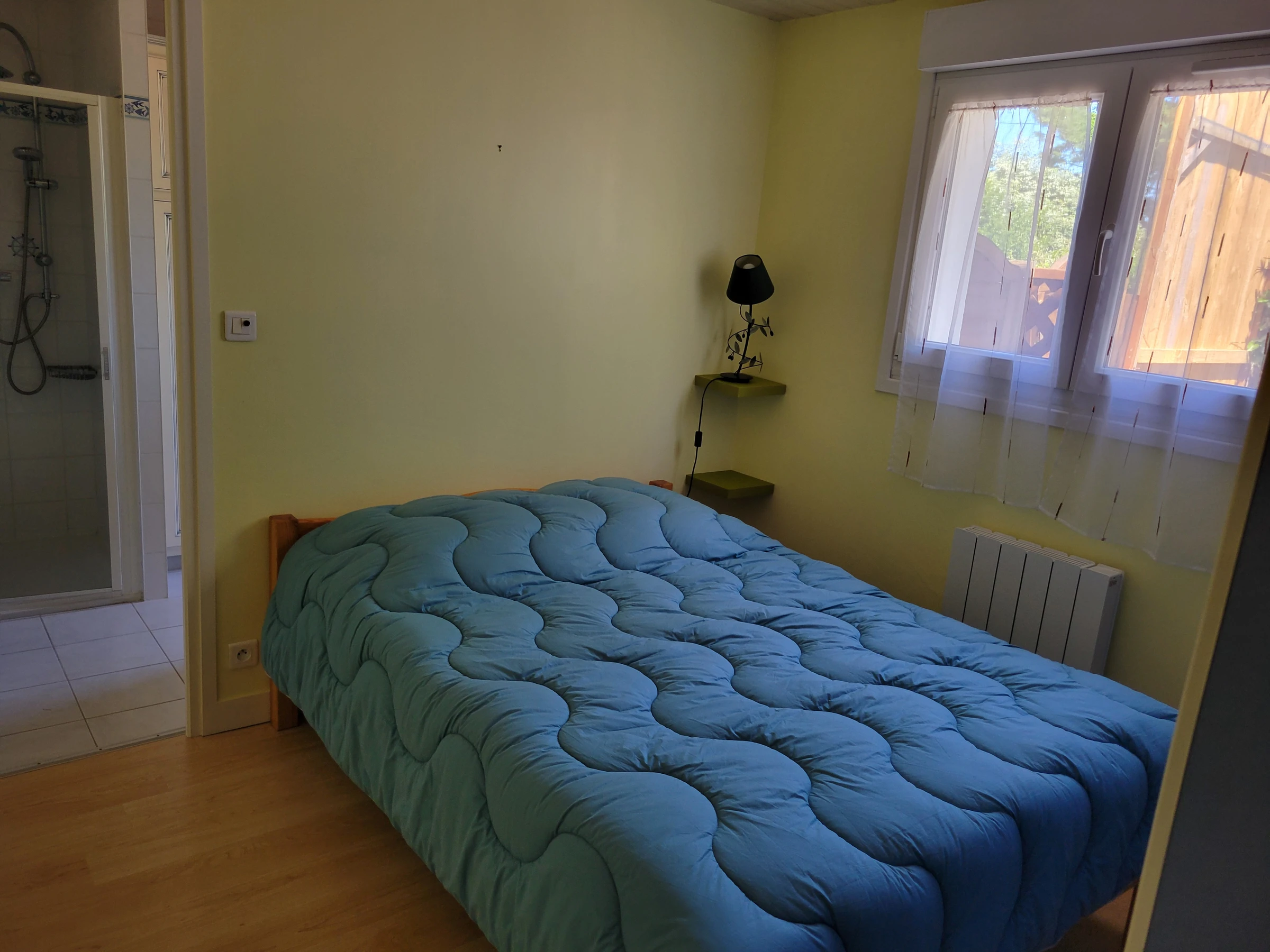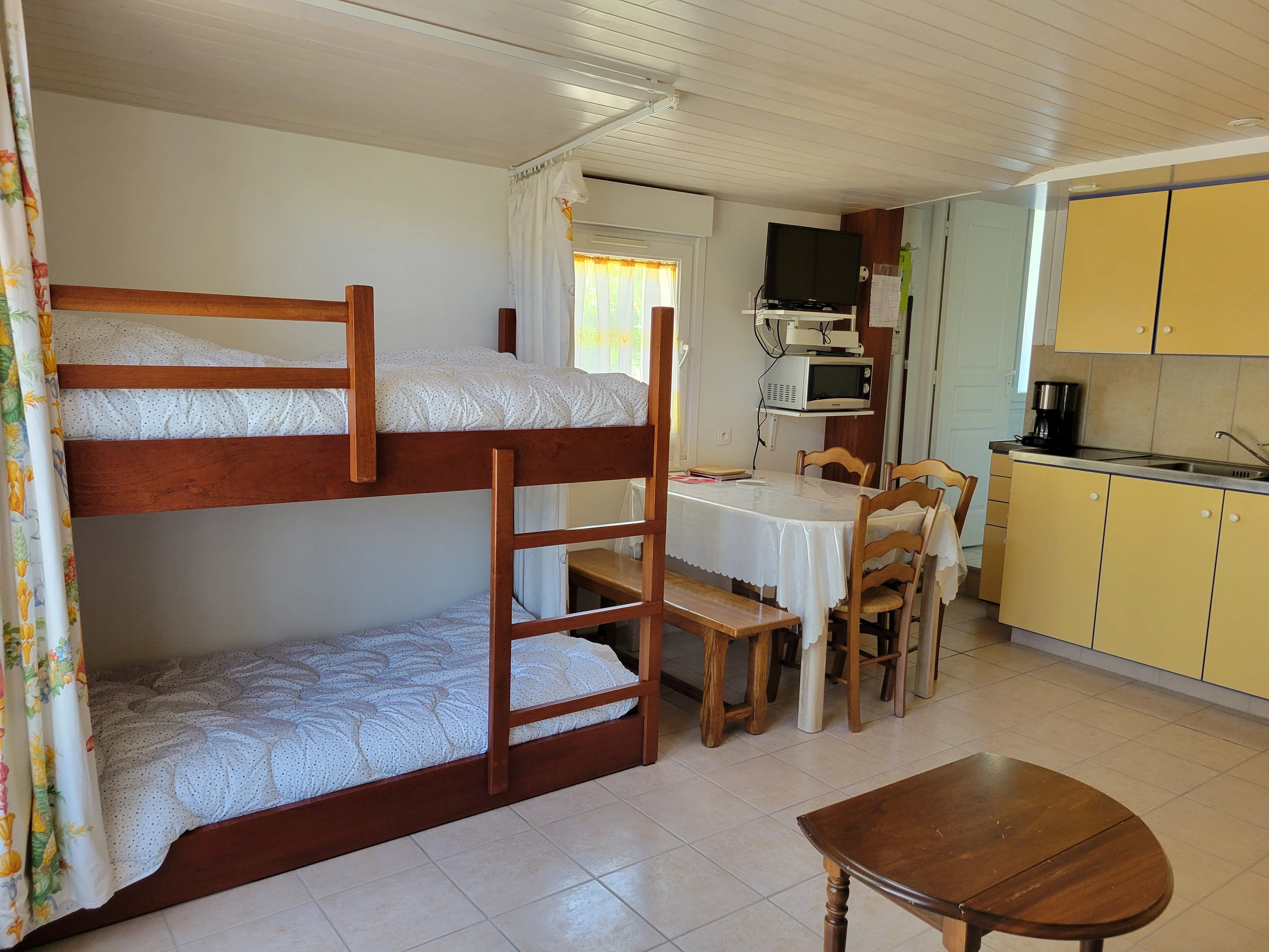 Einstöckiges Ferienhaus – ca. 40 m², für 4 Personen, bestehend aus einem Wohnzimmer mit Einbauküche und 2 Etagenbetten (90 cm) und einem Schlafsofa, einem Schlafzimmer mit einem 140 cm breiten Bett, einem Duschraum mit Toilette. Kühl-/Gefrierschrank, Mikrowelle, Backofen, Cerankochfeld, Fernseher. Umzäunter Garten mit Terrasse, Gartenmöbeln, Grill, 2 Liegestühlen. Parkplatz auf dem Grundstück. Haustiere nicht erlaubt. Auf dem Grundstück befindet sich das Zweitwohnsitz der Eigentümer. Möglichkeit eines Reinigungspakets von 65 €.