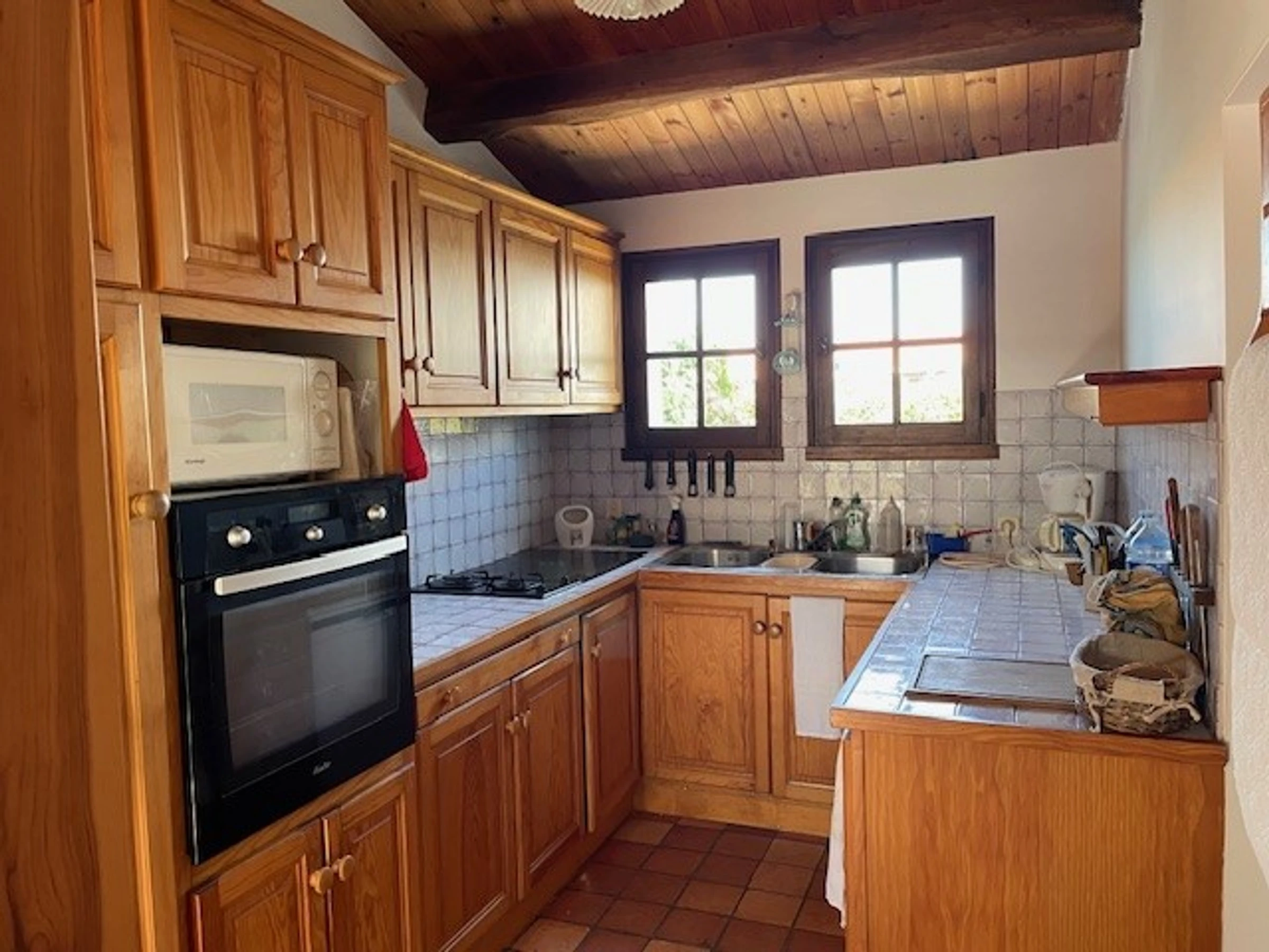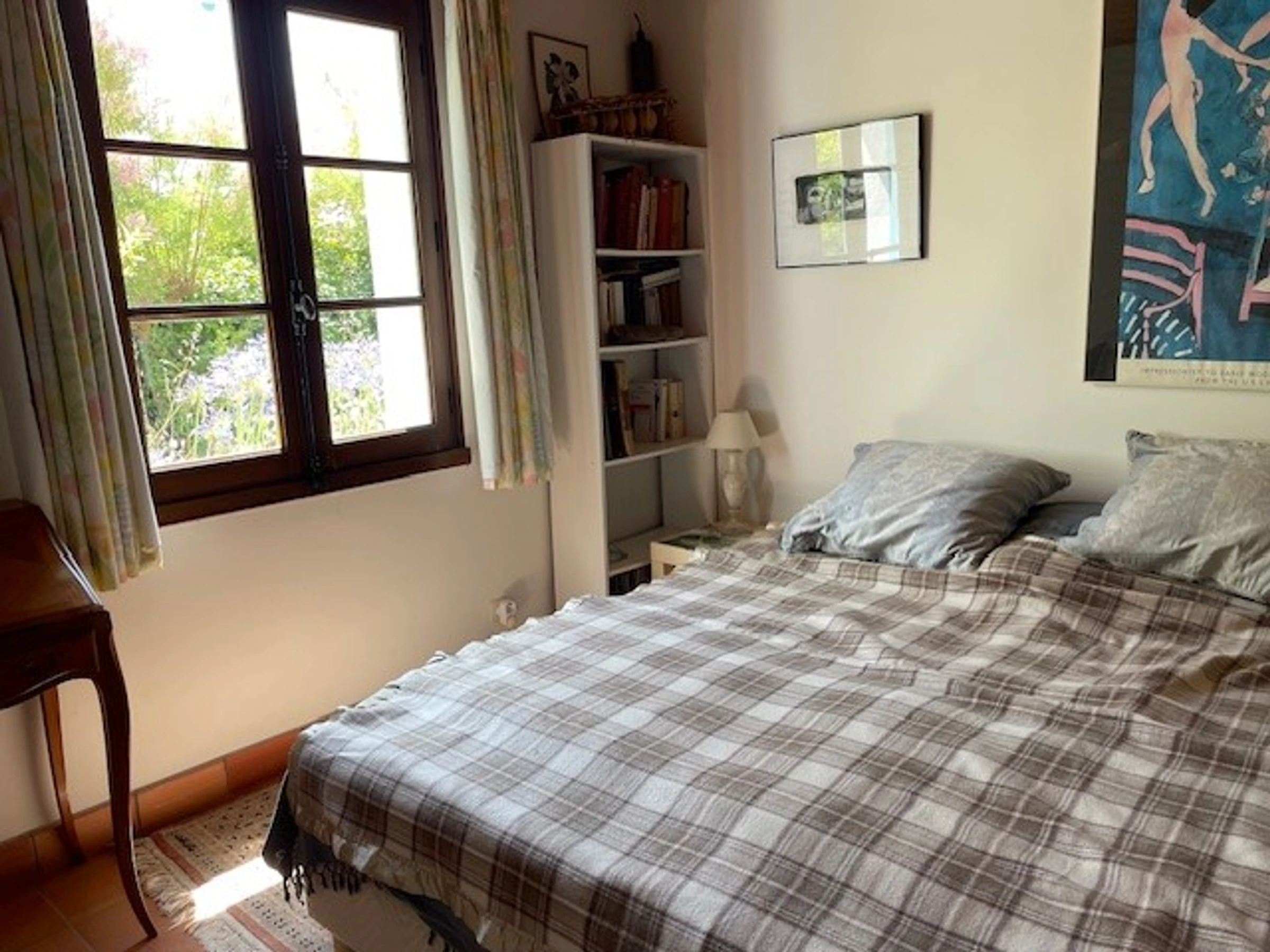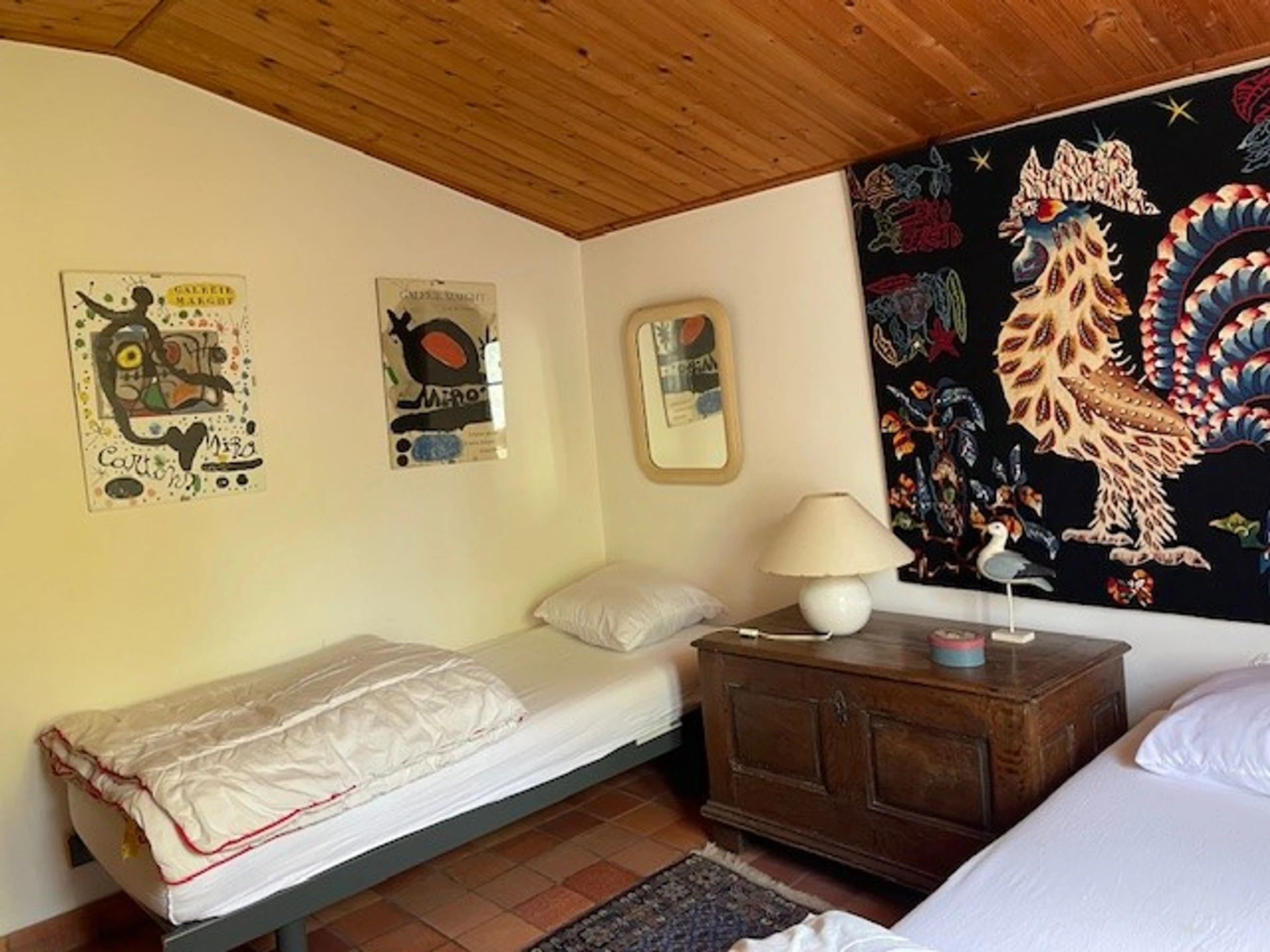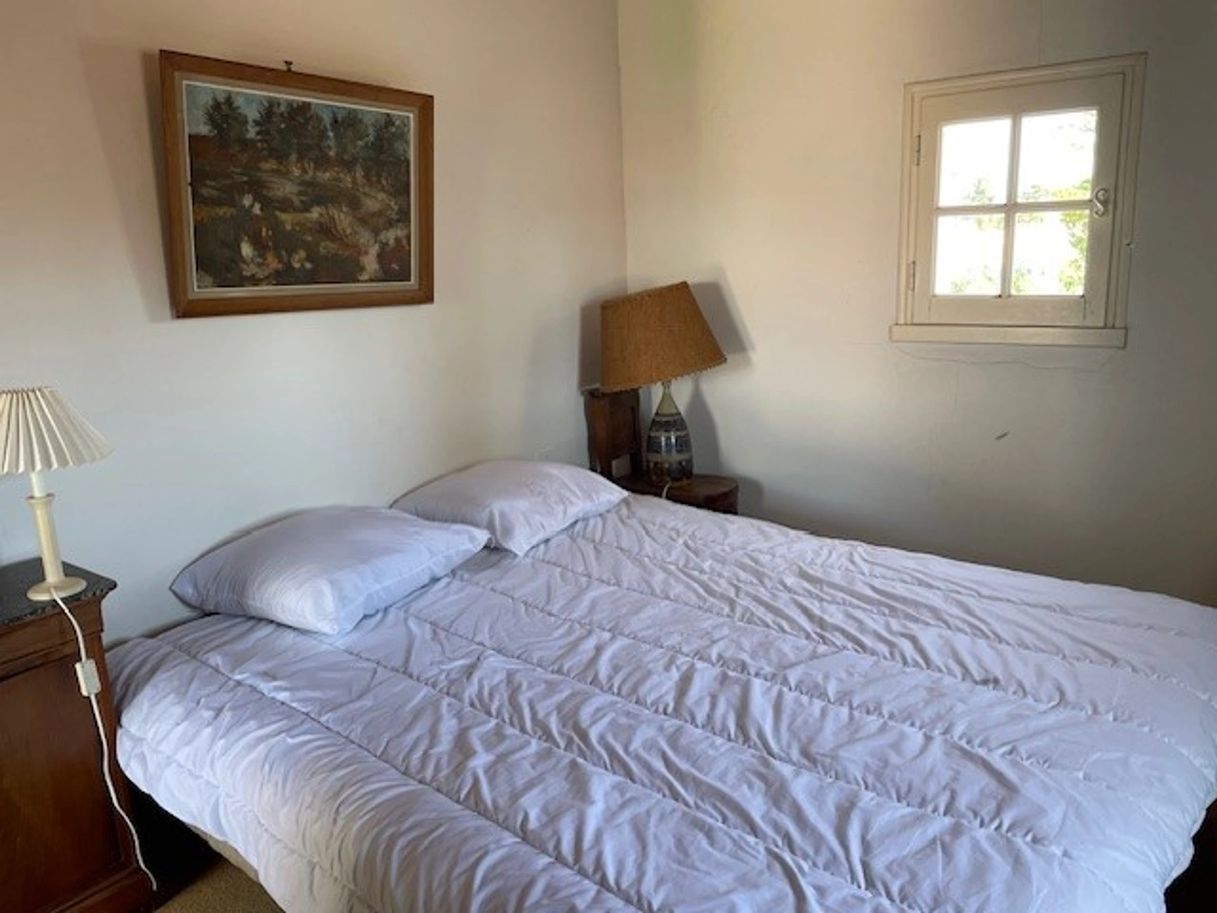 Ca. 110 m² großes Haus auf einem bewaldeten Grundstück für bis zu 8 Personen. Es besteht aus einem Wohn-/Esszimmer, einer voll ausgestatteten Küchenzeile, einem Schlafzimmer mit einem Doppelbett (2 x 70 cm), einem Schlafzimmer mit zwei Einzelbetten (80 cm), einem Badezimmer und einem WC. Im Obergeschoss, das nur über eine Außentreppe erreichbar ist, befinden sich ein Schlafzimmer mit einem Queensize-Bett (2 x 80 cm) und Teppichboden, ein Schlafzimmer mit drei Einzelbetten (80 cm) und Teppichboden sowie ein Duschbad mit WC. Zur Ausstattung gehören Fernseher, WLAN, Induktions- und Gaskochfeld, Backofen, Mikrowelle, Geschirrspüler, Kühl-/Gefrierschrank und Waschmaschine. Der umzäunte Garten ist mit Gartenmöbeln und Grill ausgestattet. Parkplätze sind vorhanden. Haustiere sind erlaubt. Eine Endreinigung von 150 € wird erhoben.