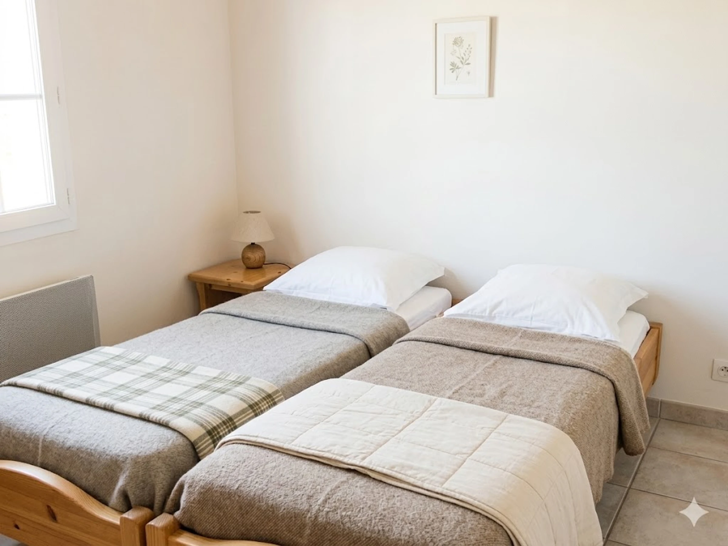 Komfortables Haus mit ca. 75 m² Wohnfläche für 6 Personen. Im Erdgeschoss befinden sich ein Wohn-/Esszimmer mit Kochnische, ein Schlafzimmer mit Doppelbett (140 cm), ein Duschbad und ein WC. Im Obergeschoss befinden sich zwei weitere Schlafzimmer mit je zwei ausziehbaren Einzelbetten (70 cm) und ein WC. Zur Ausstattung gehören Fernseher, Mikrowelle, Geschirrspüler, Backofen und Waschmaschine. Das Haus verfügt über einen umzäunten Garten/Innenhof, eine Terrasse, Gartenmöbel, zwei Sonnenliegen und einen Grill. Parkplätze stehen vor dem Haus in der ruhigen Sackgasse zur Verfügung. Haustiere sind nicht erlaubt. Die Endreinigung kostet 108 €.