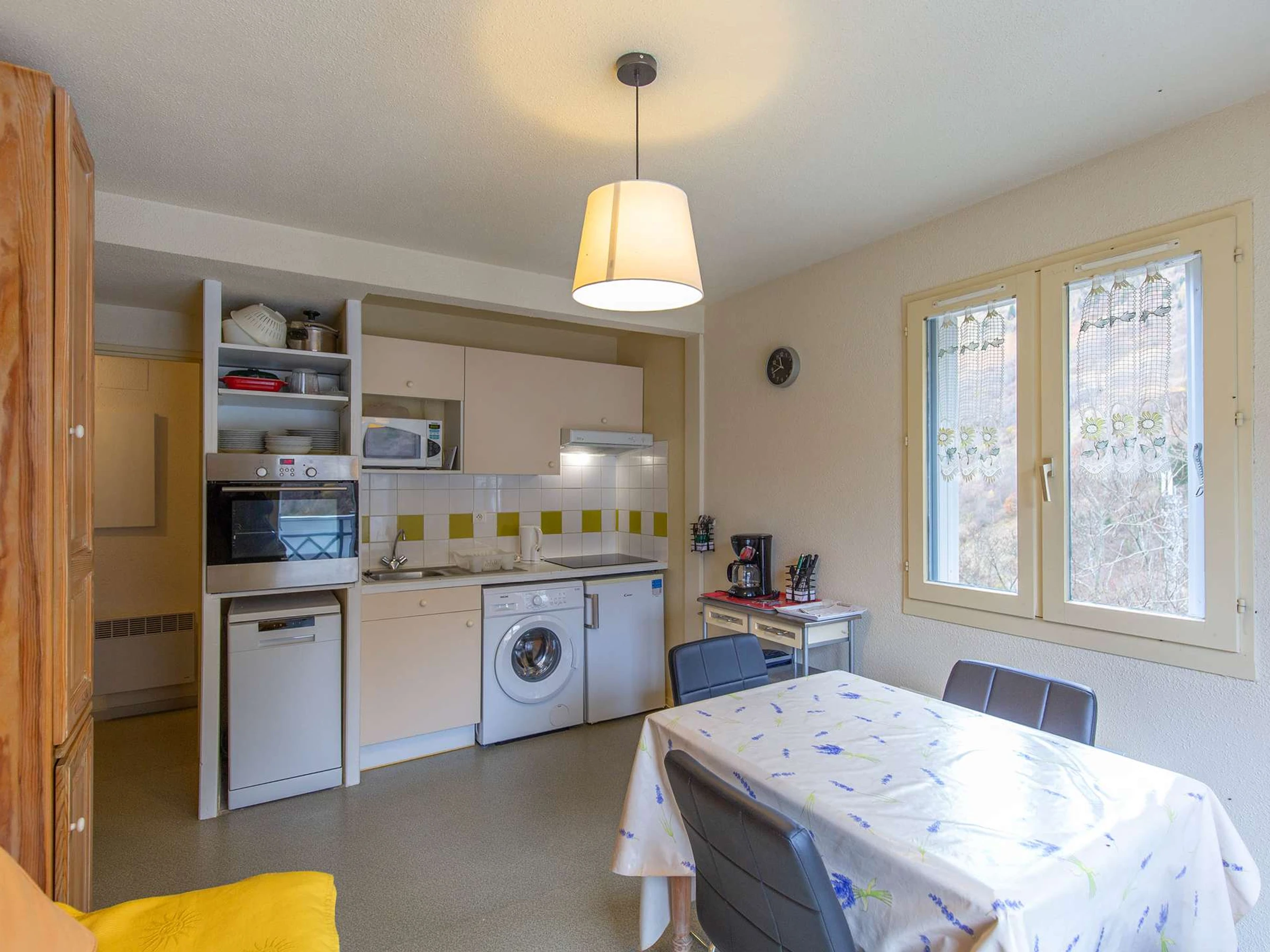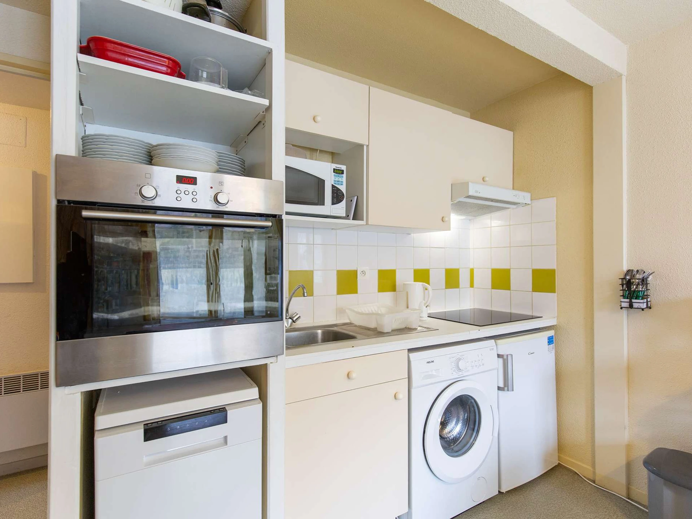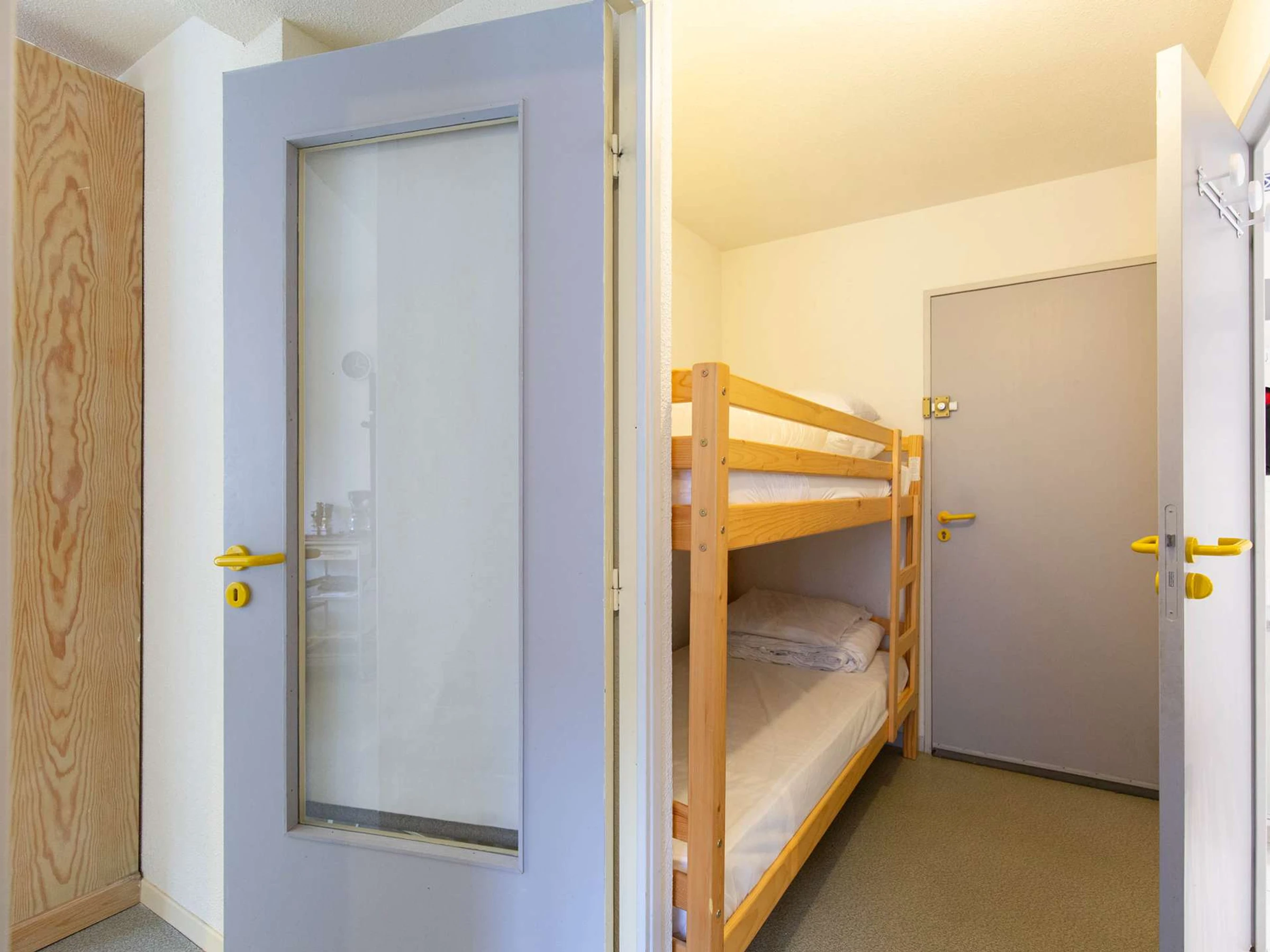 Das Apartment verfügt über ein Wohnzimmer mit voll ausgestatteter Küche (Mikrowelle, Backofen, Geschirrspüler, 4-Platten-Kochfeld, Waschmaschine etc.), ein Schlafzimmer mit einem Doppelbett (140 x 190 cm) und ein Etagenbett (2 x 90 x 190 cm) im Eingangsbereich.