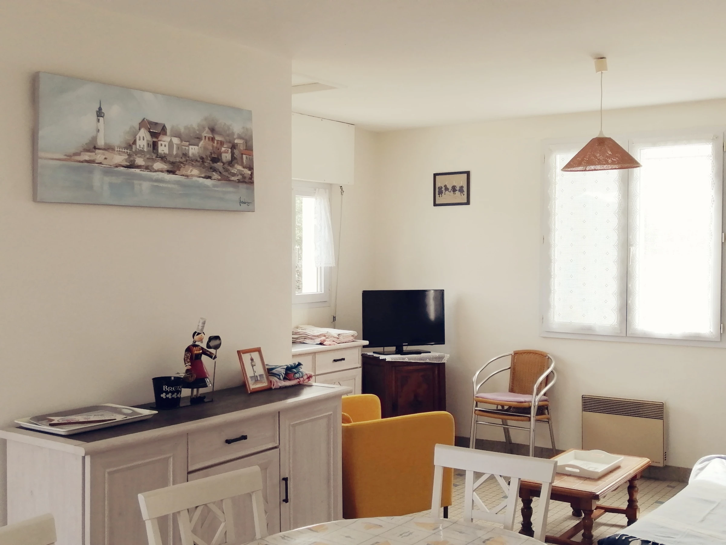 Nur 150 Meter vom Strand entfernt bietet dieses charmante Haus ein Wohn-/Esszimmer mit Schlafcouch, eine voll ausgestattete Küche (Cerankochfeld, Kühl-/Gefrierschrank, Mikrowelle, Geschirrspüler, Elektroherd, Dunstabzugshaube, Schränke, Geschirr und Besteck, Filterkaffeemaschine). Es gibt zwei Schlafzimmer, eines mit zwei Doppelbetten (140 cm) und das andere mit einem Doppelbett (140 cm). Ein Flur mit Waschmaschine, ein Duschbad mit Waschbecken und ein separates WC vervollständigen die Unterkunft.