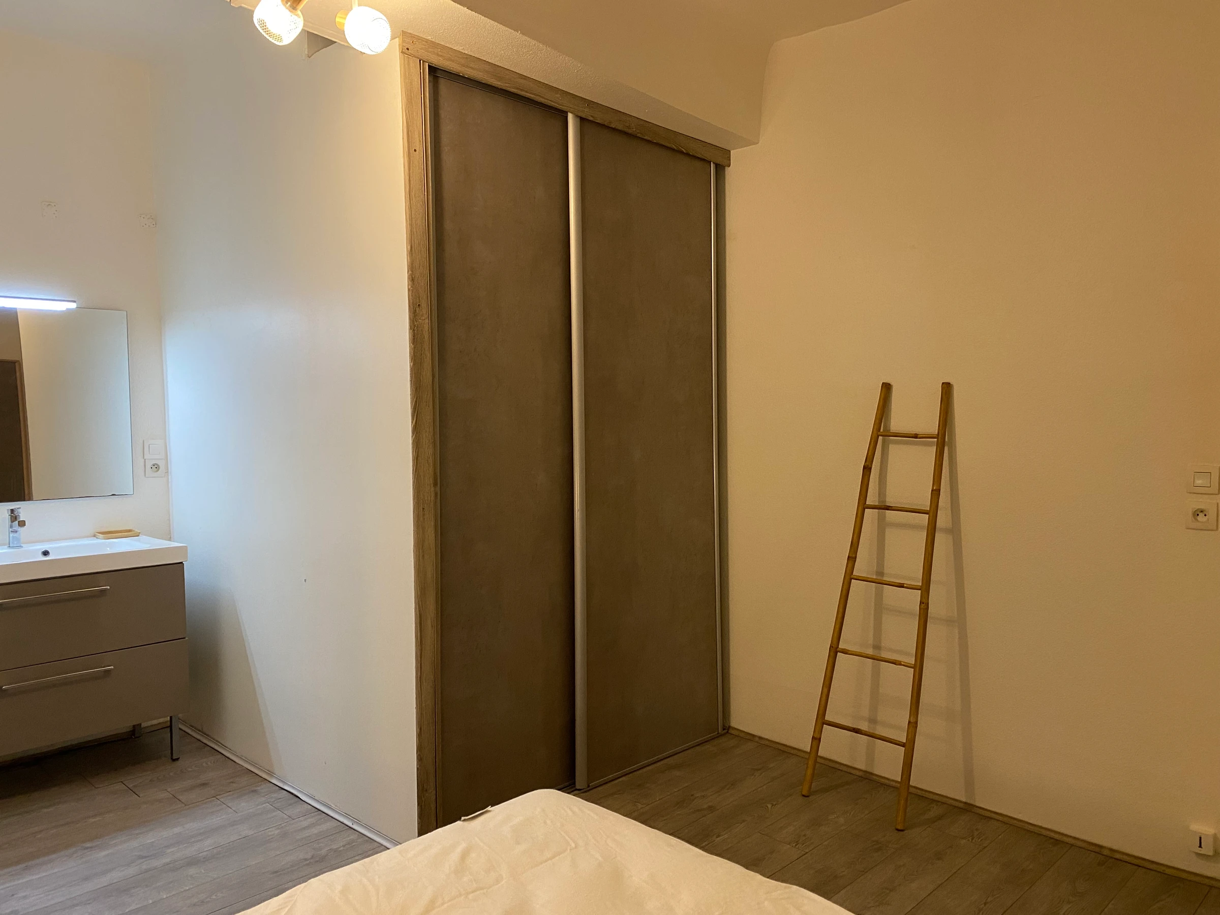 Ein Schlafzimmer mit Doppelbett, ein großer Einbauschrank und ein Badezimmer runden das Apartment ab.