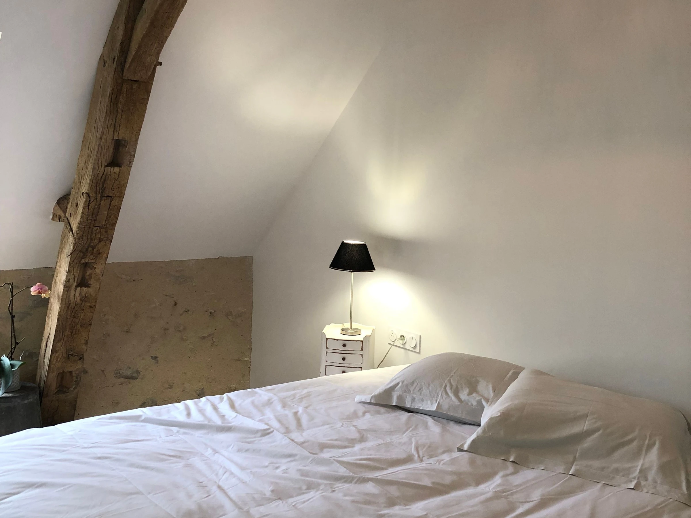 Zimmer „La Chapelle“ für 4 Personen: Im Erdgeschoss, 1 Doppelbett, und im Zwischengeschoss, mit Wendeltreppe, 2 Einzelbetten, Badezimmer mit großer ebenerdiger Dusche, Waschbecken und WC. Das Zimmer ist für Personen mit eingeschränkter Mobilität geeignet.