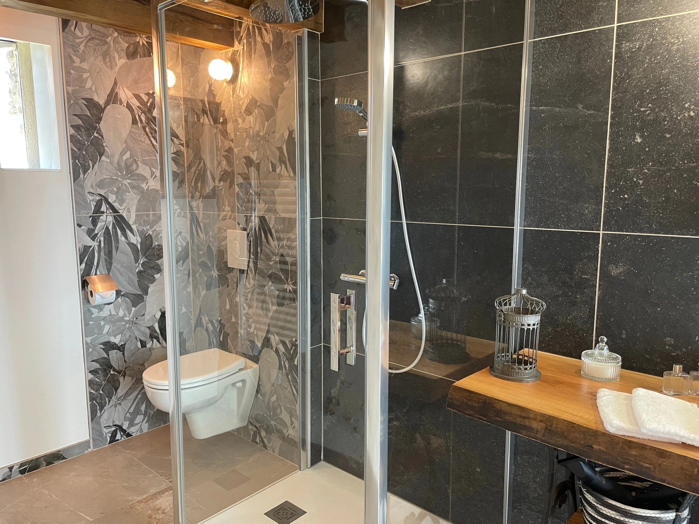 Das eigene Badezimmer ist mit einer ebenerdigen Dusche und einem WC ausgestattet. Handtücher werden gestellt.