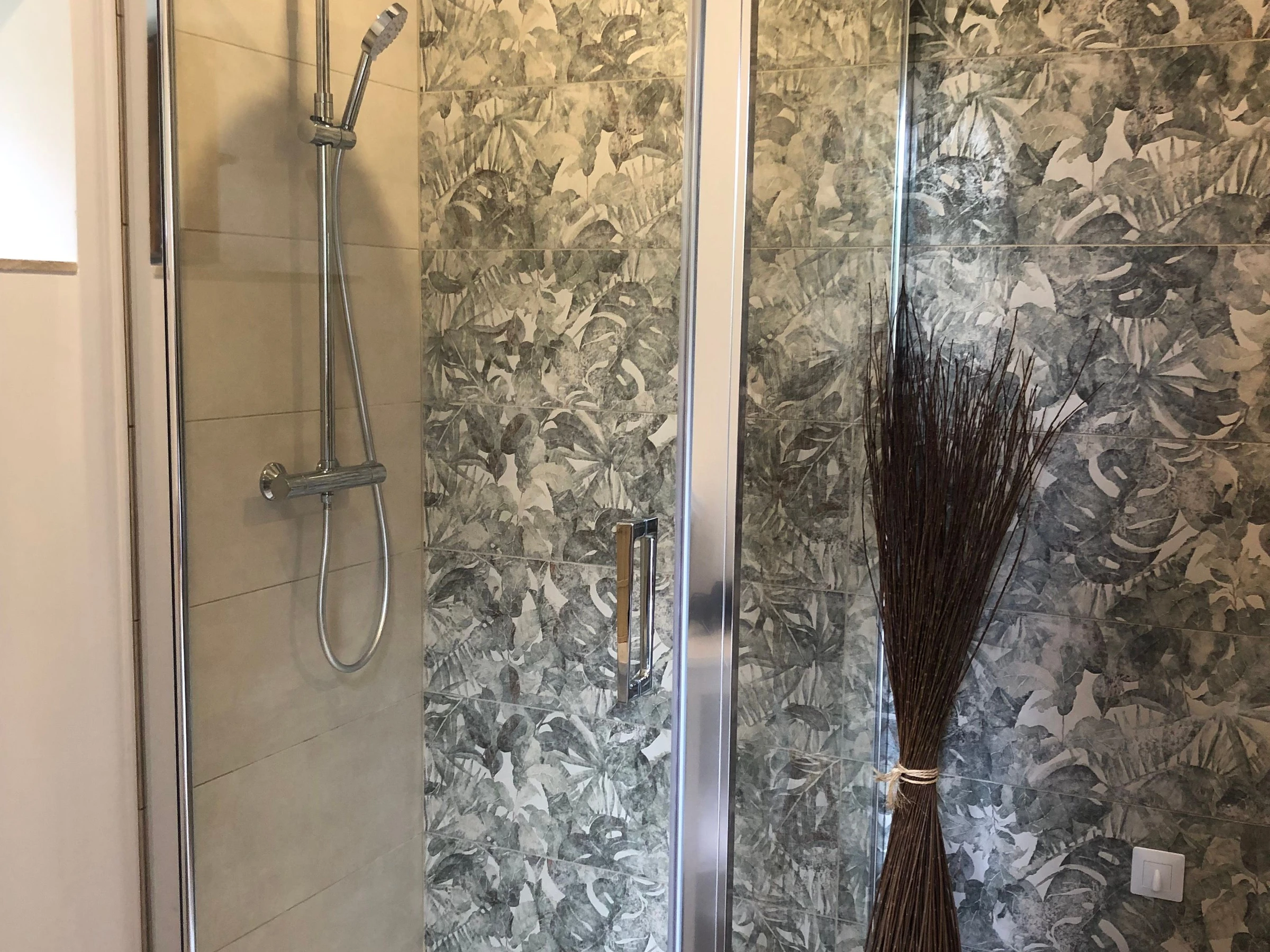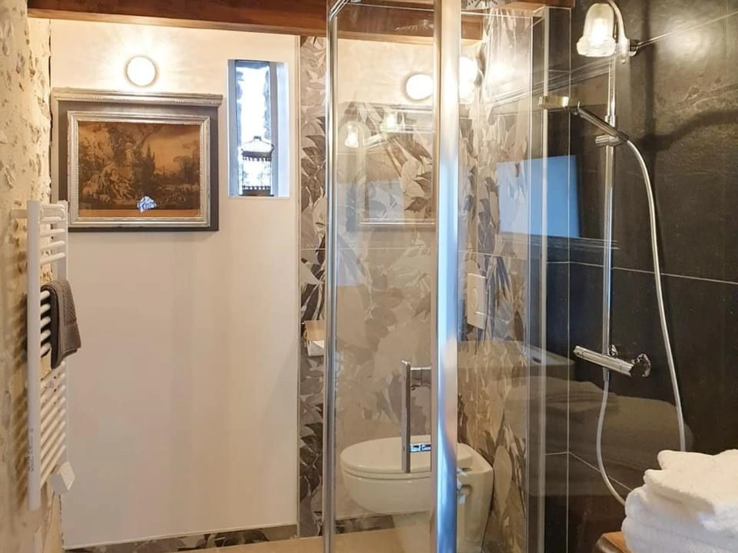 Das Kapellenzimmer ist für Personen mit eingeschränkter Mobilität geeignet, sowohl dank der Zugangsrampe von der Terrasse als auch der angepassten Handläufe und des Waschbeckens im Badezimmer.