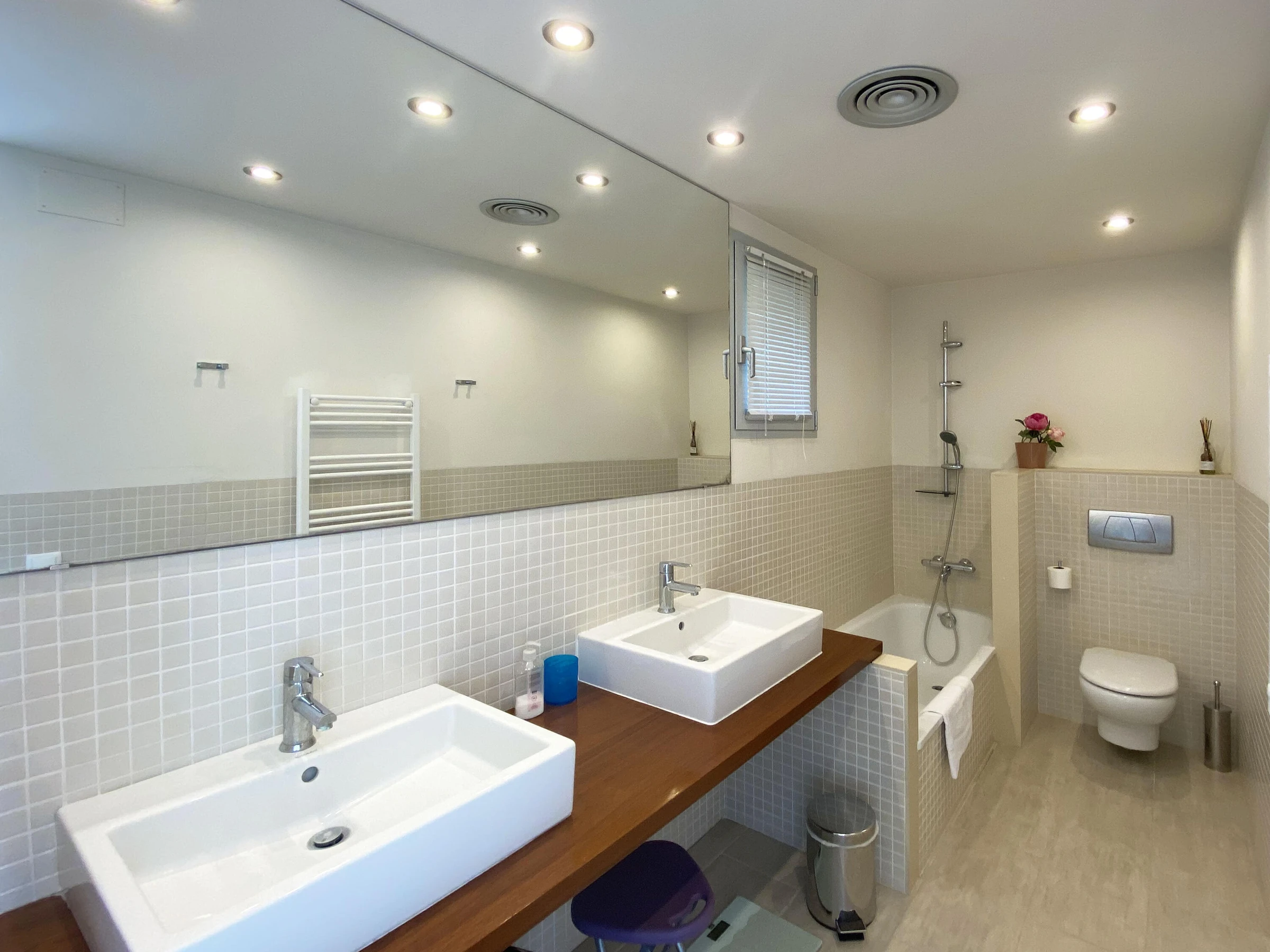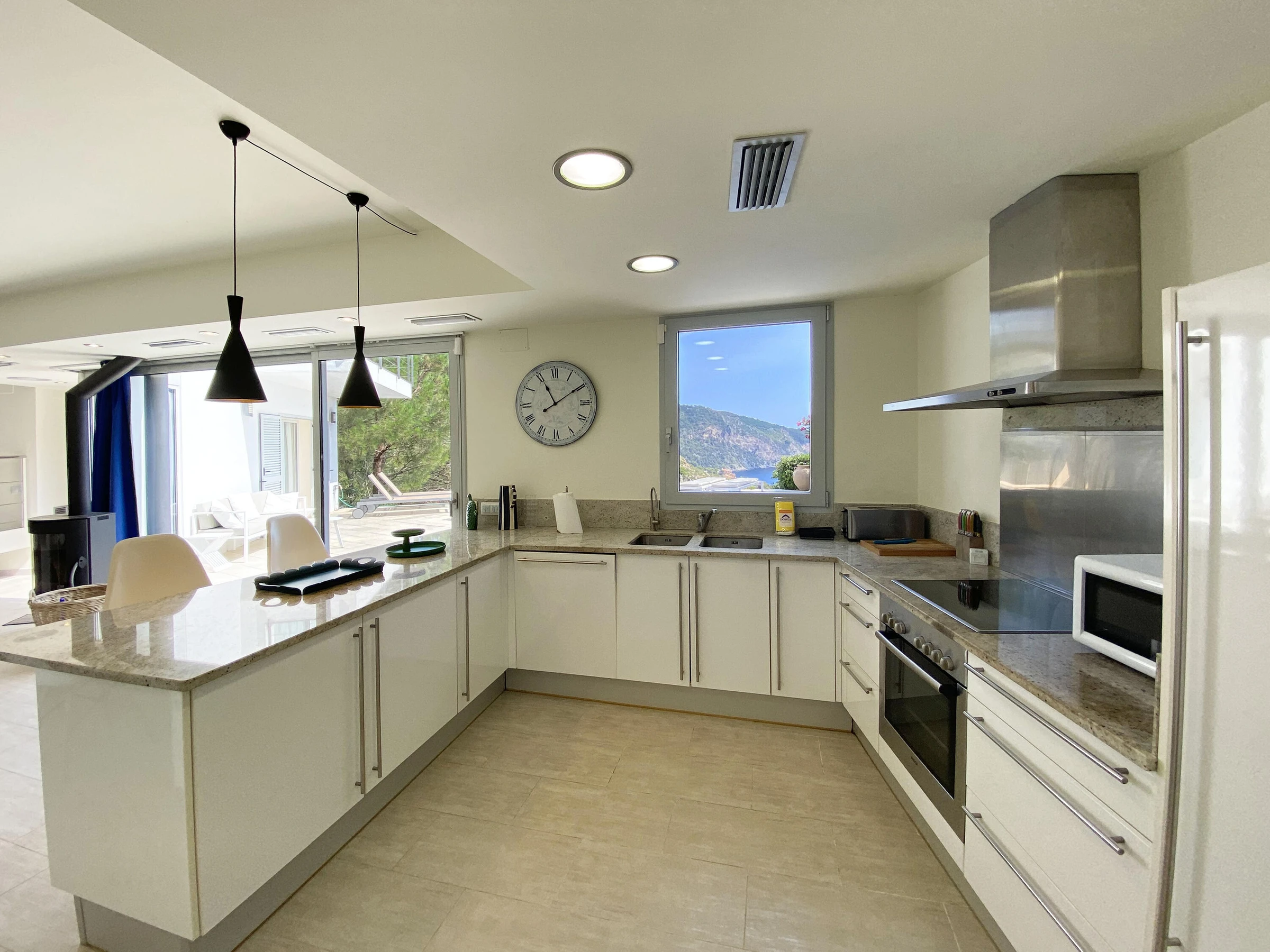 Fantastisches Anwesen im modernen Design mit Meerblick, gelegen in einer ruhigen Wohngegend, nur 600 Meter vom Strand von Aiguablava entfernt. Auf zwei Ebenen verteilt finden wir im Erdgeschoss ein großes Wohn-Esszimmer mit offener Küche und Zugang zum Garten, eine Toilette, einen Abstellraum und ein Schlafzimmer im Suite-Stil mit eigenem Bad. Im Obergeschoss befinden sich ein großer Flur, zwei Doppelschlafzimmer, ein komplettes Badezimmer und eine Suite mit Badezimmer und Ankleidezimmer. Im Außenbereich gibt es Terrassen und ein großes Solarium mit Swimmingpool. Von allen Räumen des Hauses genießen Sie einen wunderschönen Meerblick. Es verfügt über einen Außenparkplatz für zwei Fahrzeuge.