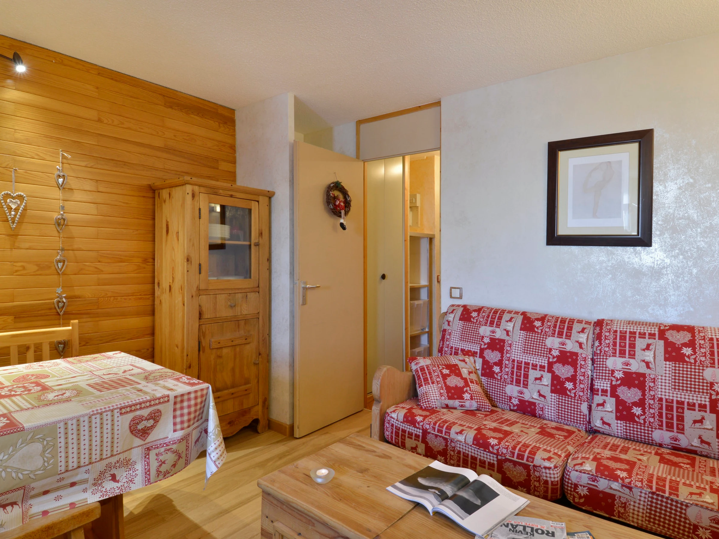 Zweizimmerwohnung für 4 Personen, 28 m², im Ortszentrum. Die Wohnung befindet sich im fünften Stock, ist nach Westen ausgerichtet und verfügt über einen Balkon mit Blick auf die Piste.