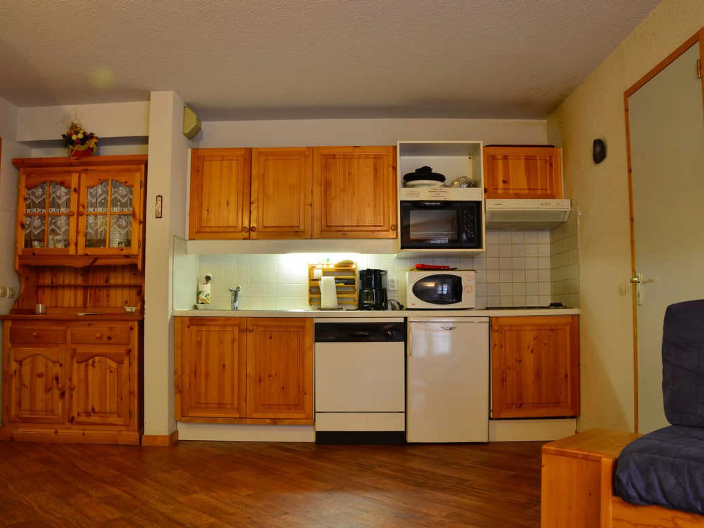 Küche offen zum Wohnzimmer: 4 Elektrokochplatten, Geschirrspüler, Kühlschrank, Elektrobackofen, Mikrowelle, Dunstabzugshaube, Wasserkocher, Raclette-Grill, Fondue-Set, Toaster, Kaffeemaschine.