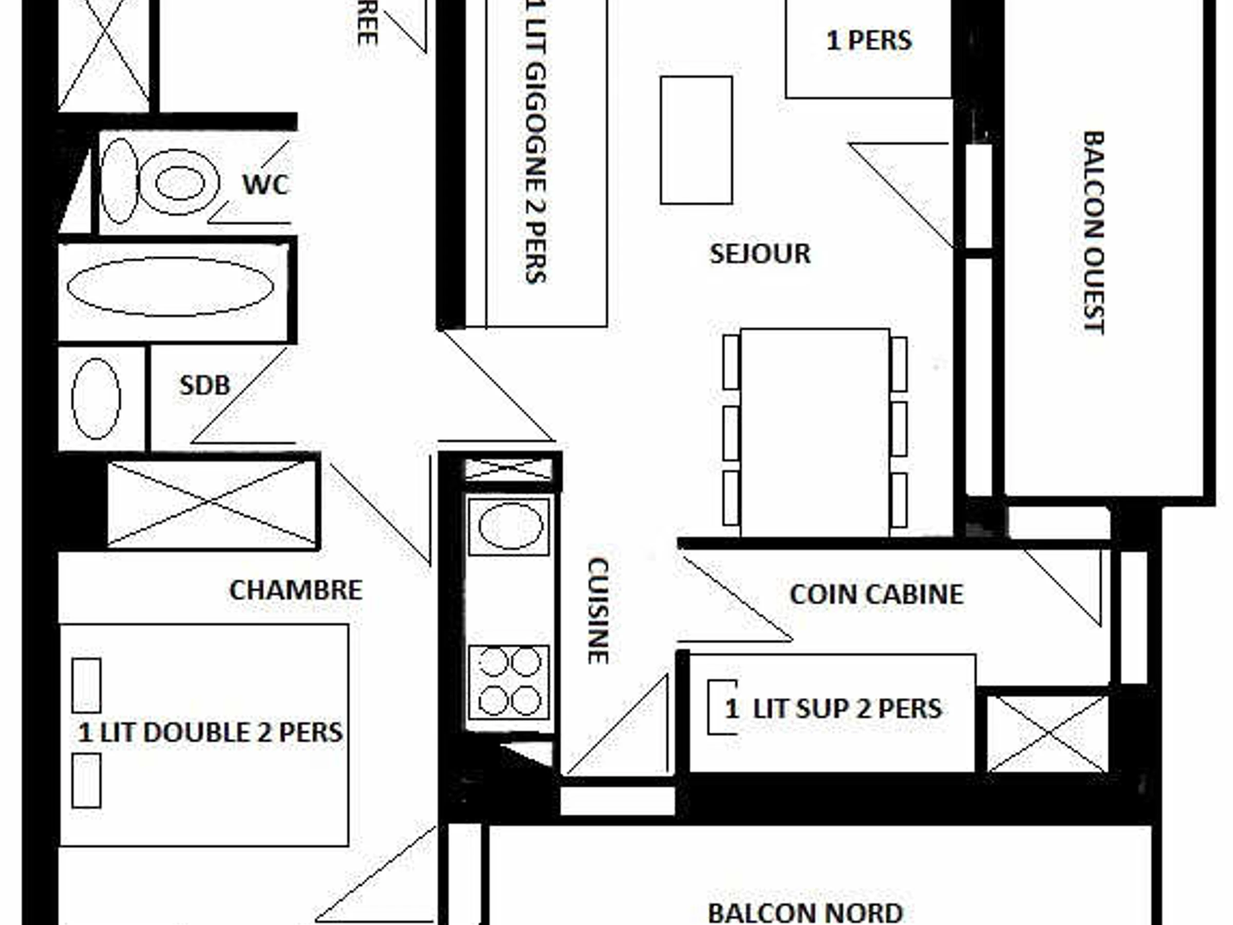 2-Zimmer-Wohnung + Hütte für 6 Personen, ca. 36 m², mit Nord- und Westausrichtung und 2 Balkonen, mit Blick auf den Ort und das Tal, im 3. Stock, unverbauter Aussicht, kürzlich renoviert und mit 2 Sternen der Präfektur und 4 „Paradiski-Kristallen“ ausgezeichnet.