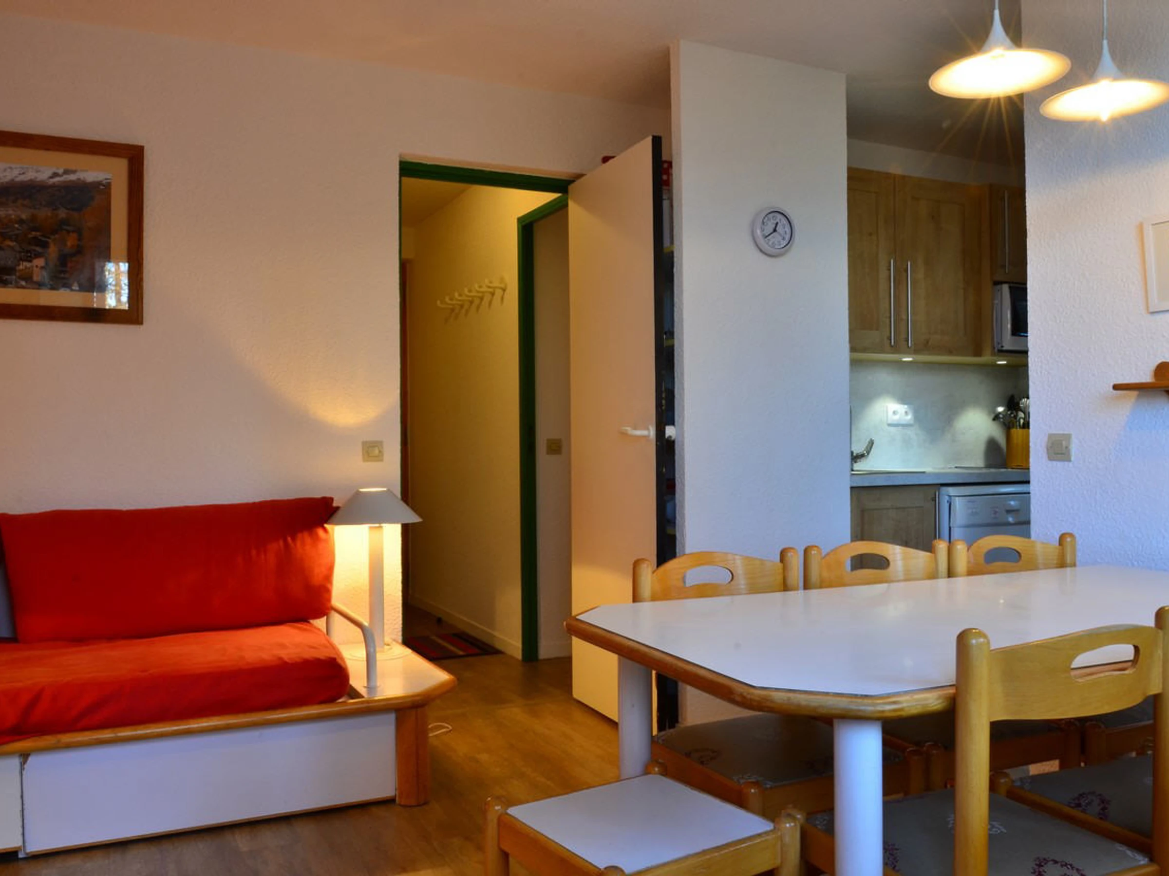 Kürzlich renovierte 2-Zimmer-Wohnung mit Kabine für 6 Personen, ca. 34 m², mit Süd- und Westausrichtung und 2 Balkonen, jeweils zur Pisten- und Resortseite, im 6. Stock.