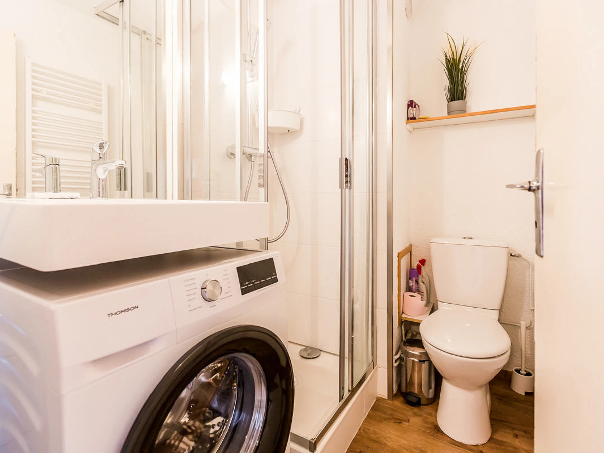 Badezimmer mit Dusche, WC und Waschmaschine.