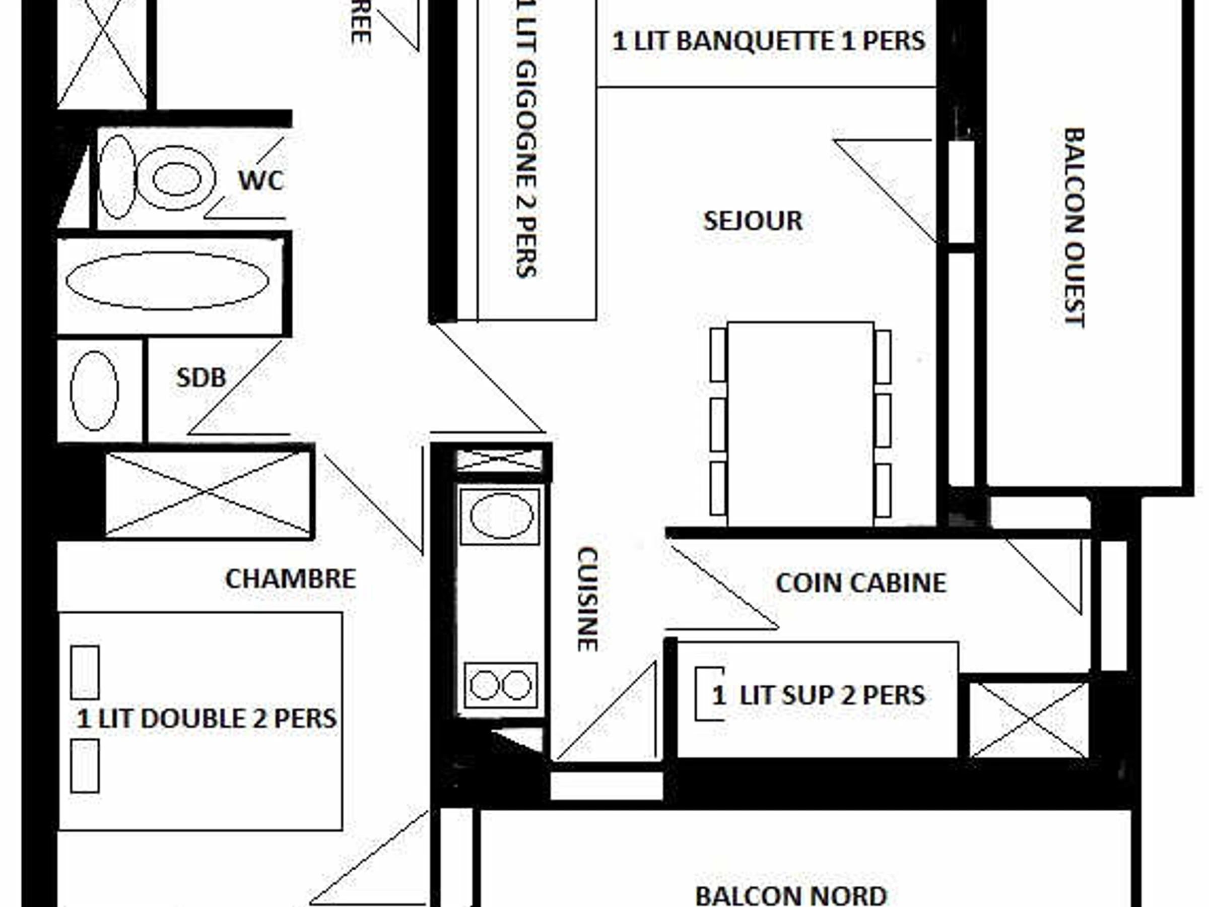 2-Zimmer-Wohnung + Hütte für 6 Personen, ca. 36 m², mit Nord- und Westausrichtung und 2 Balkonen. Mit Blick auf das Resort und das Tal im 2. Stock und freiem Blick.