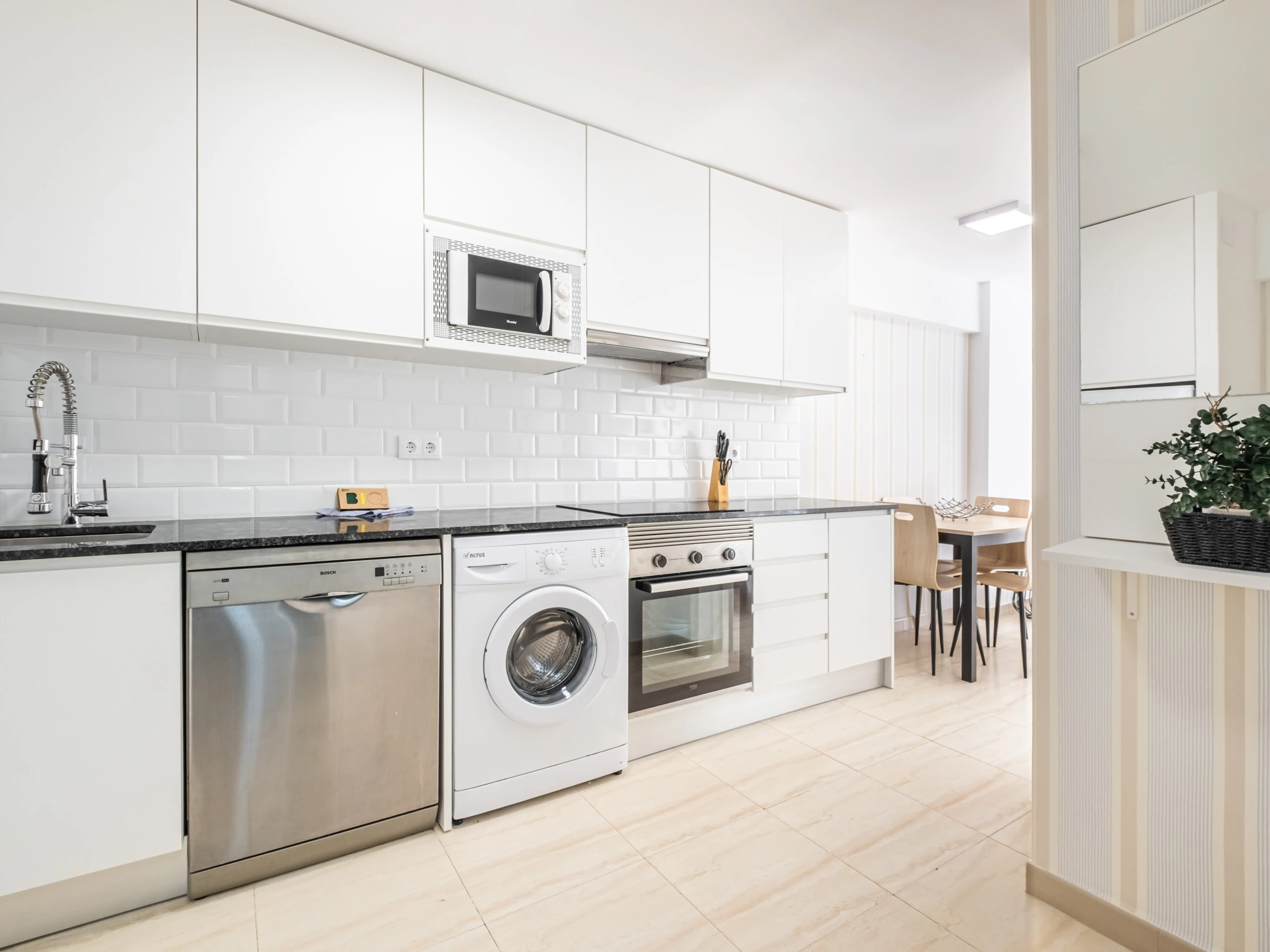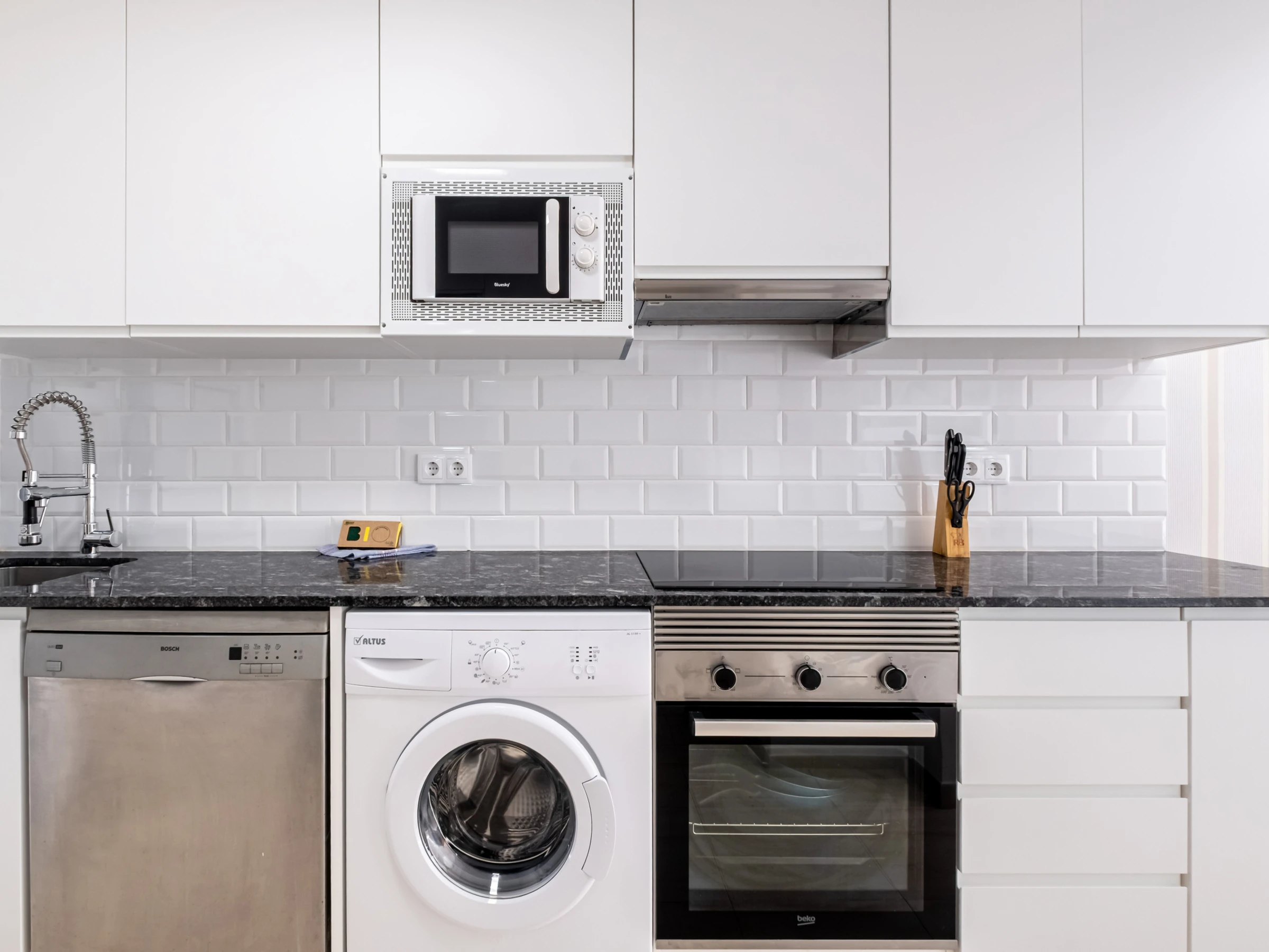 Dieses offene küche, mit ceranfeld, ist ausgestattet in kühlschrank, mikrowelle, backofen, gefrierschrank, spülmaschine, geschirr/besteck, kochutensilien, kaffeemaschine, toaster, wasserkocher und saftpresse.