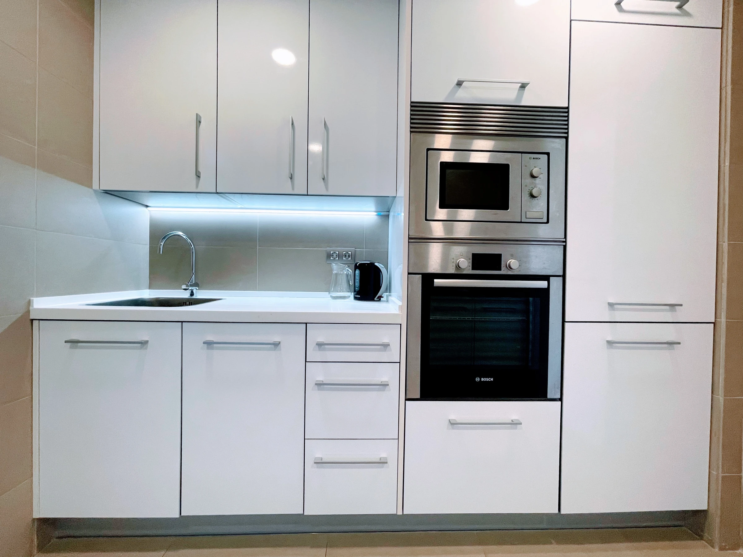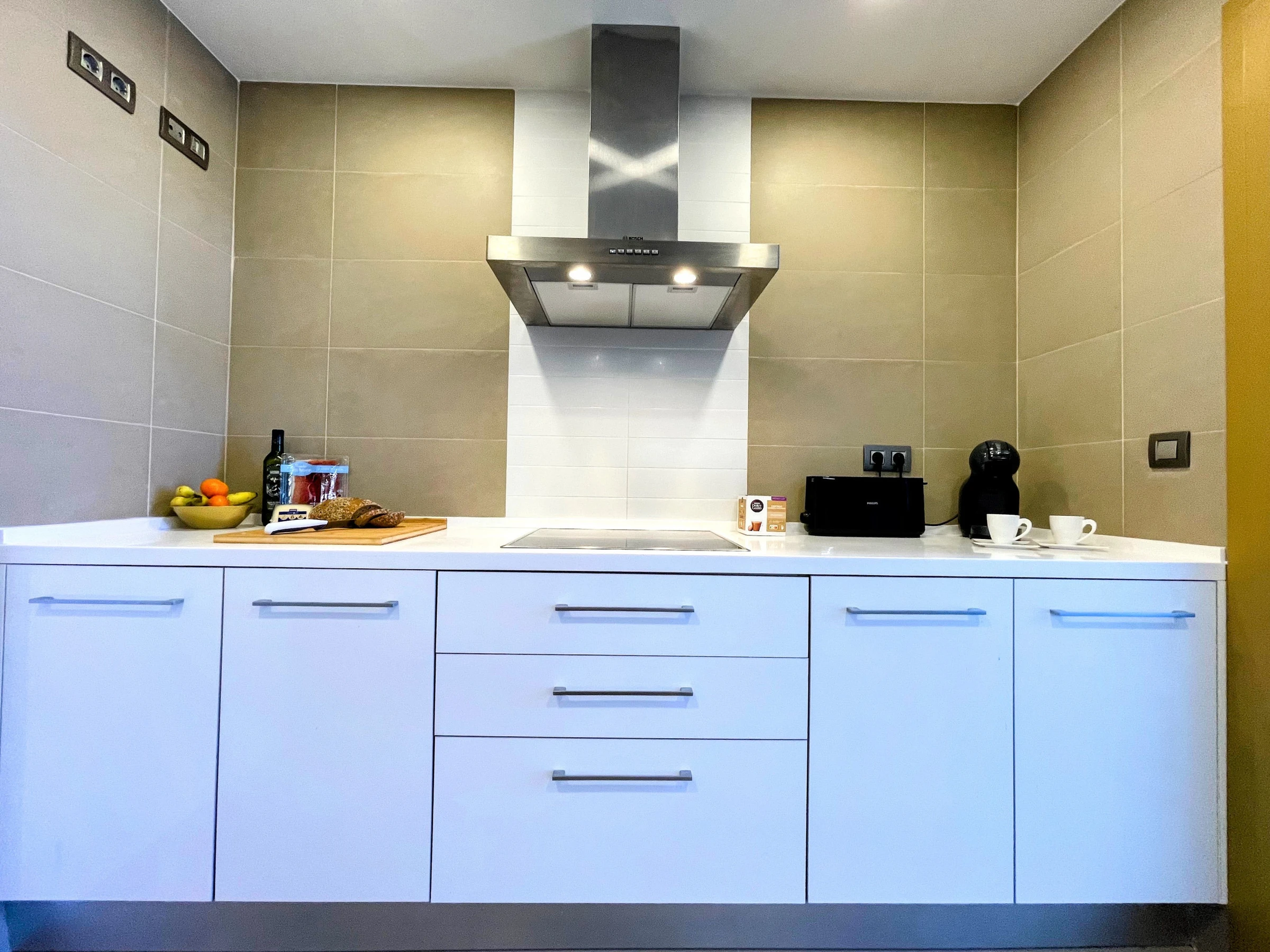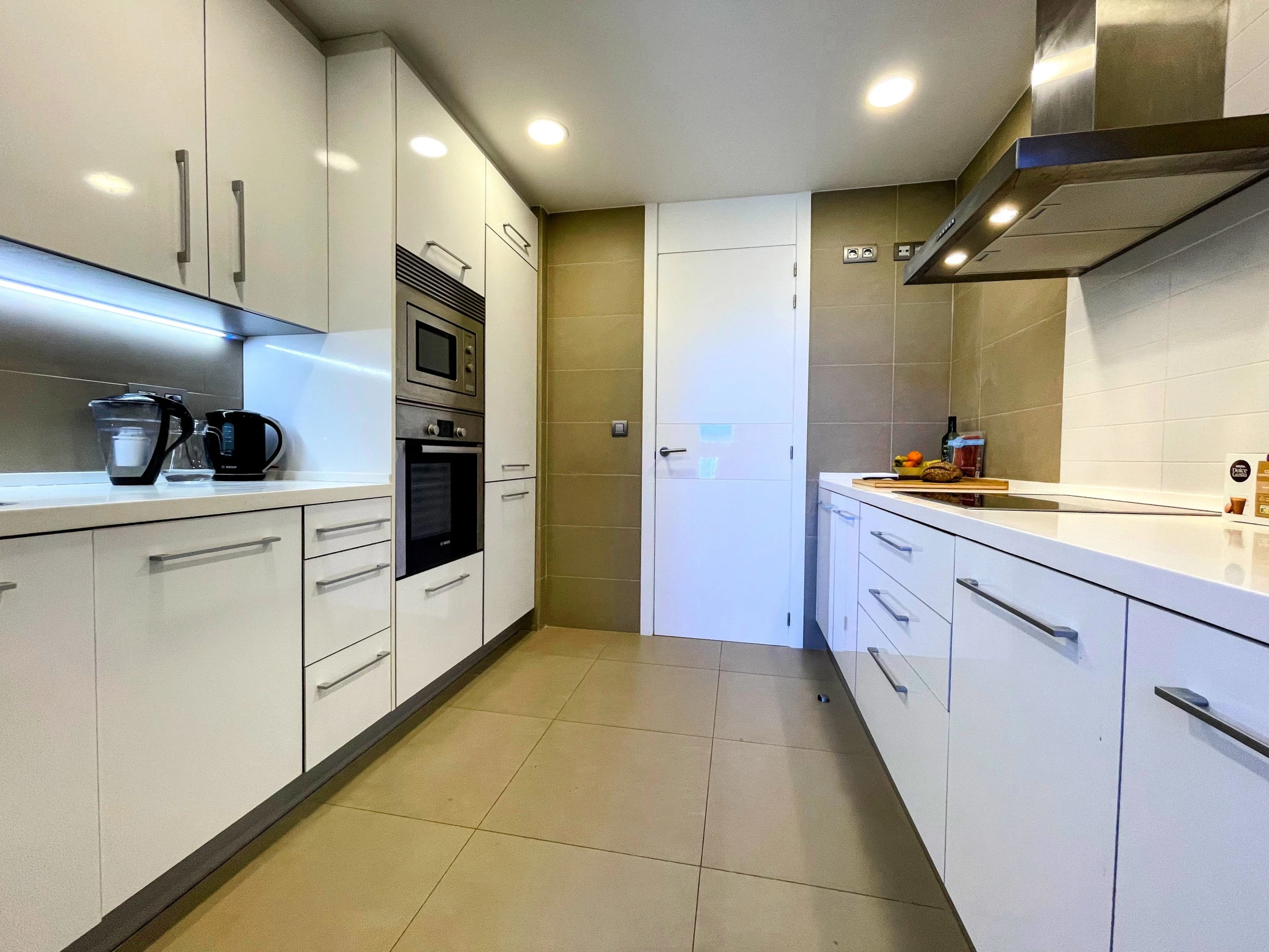 Die Einrichtungen der Wohnung sind hervorragend. Sie verfügt über zwei Badezimmer, eines mit Dusche und eines mit Badewanne, was den Komfort der Gäste erleichtert. Die separate Küche ist vollständig ausgestattet mit Haushaltsgeräten von renommierten Marken wie Waschmaschine, Geschirrspüler, Backofen, Mikrowelle und Kaffeemaschine, was es ermöglicht, während des Aufenthalts Mahlzeiten zuzubereiten.