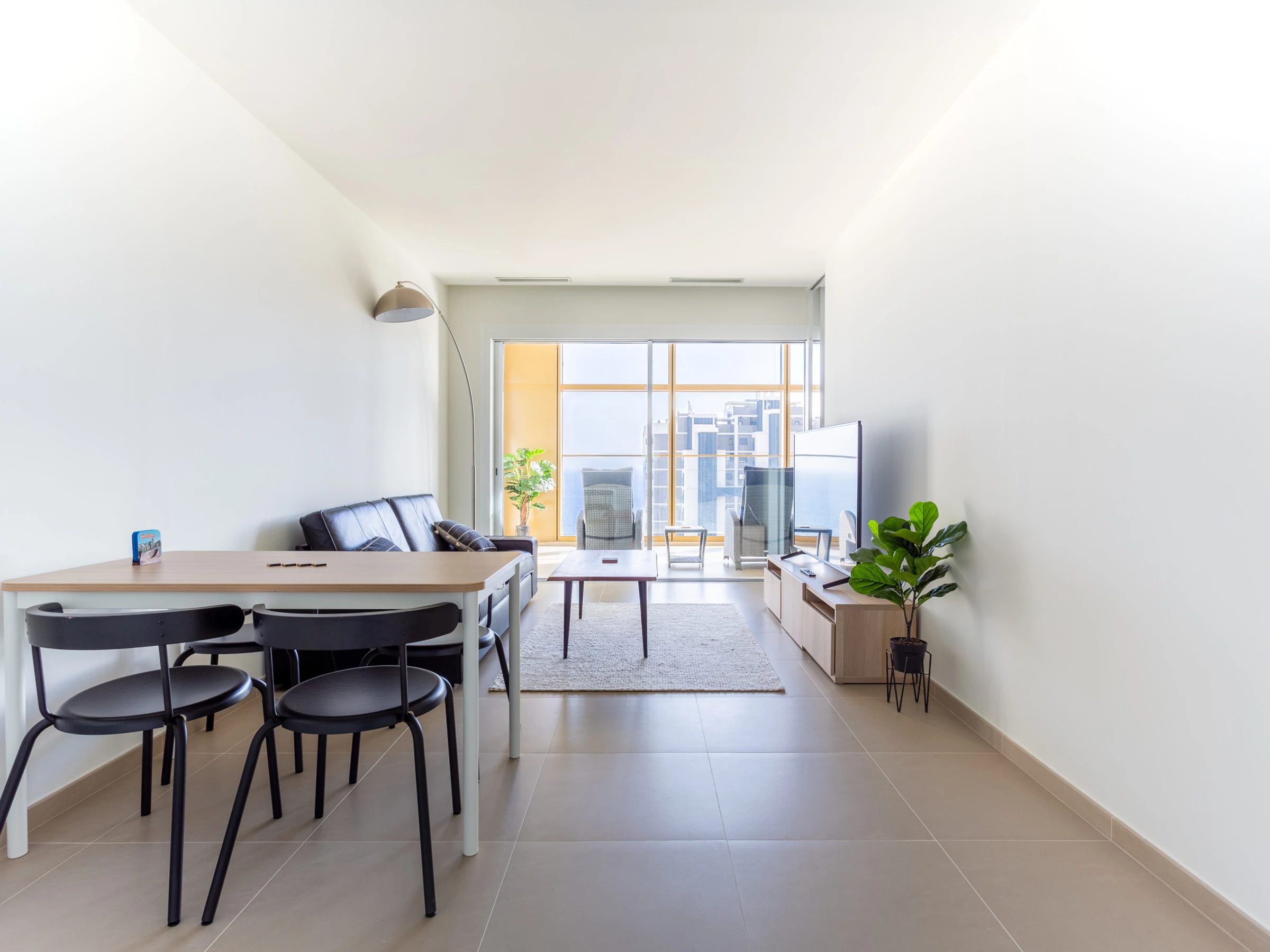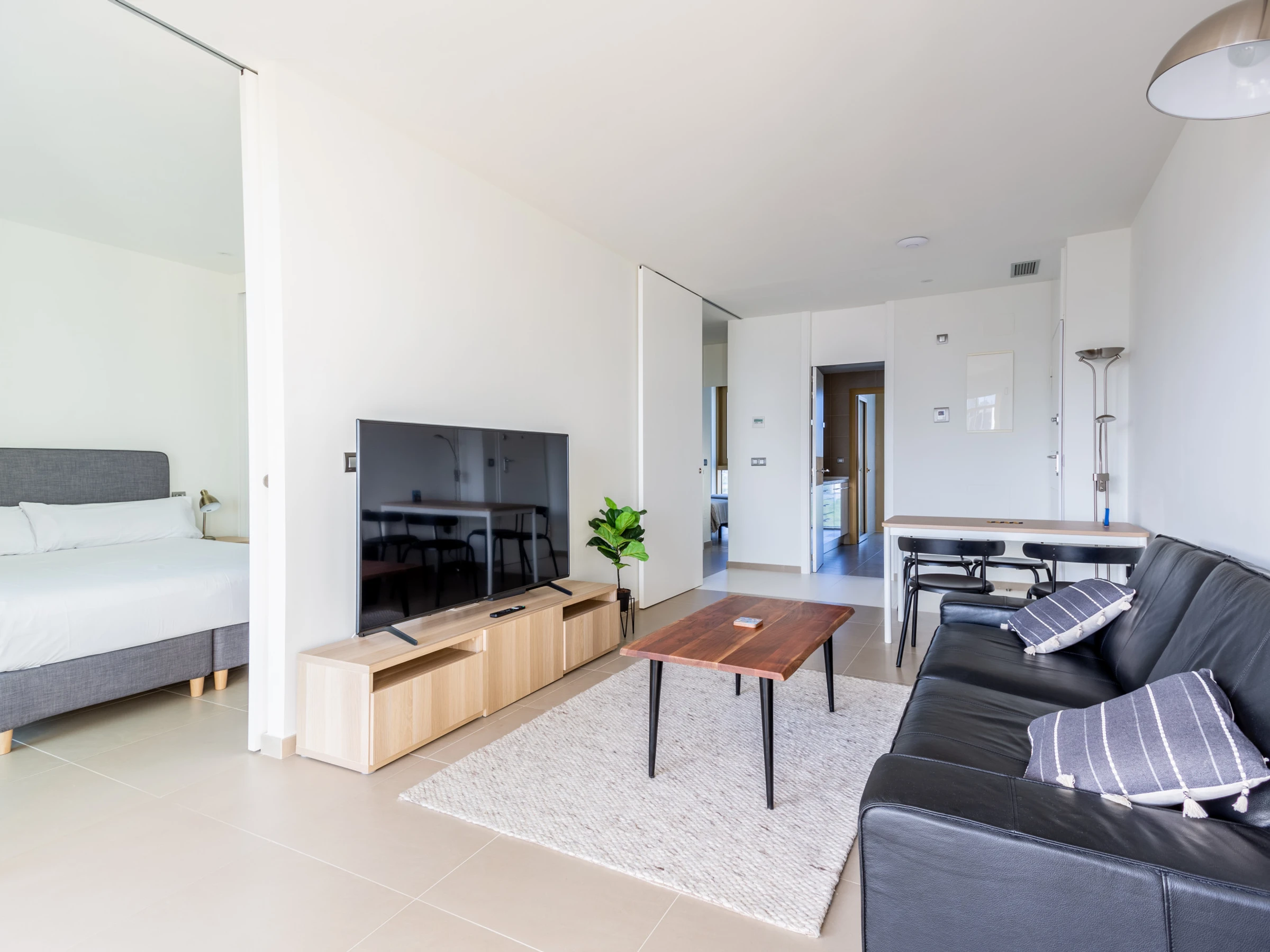 Diese helle 95 Quadratmeter große Wohnung bietet eine vollständig ausgestattete Unterkunft mit 2 Schlafzimmern, die bis zu 5 Personen bequem beherbergen kann. Sie verfügt über eine intelligente Aufteilung, die ein Doppelbett und zwei Einzelbetten umfasst und einen erholsamen Schlaf für alle Gäste gewährleistet.