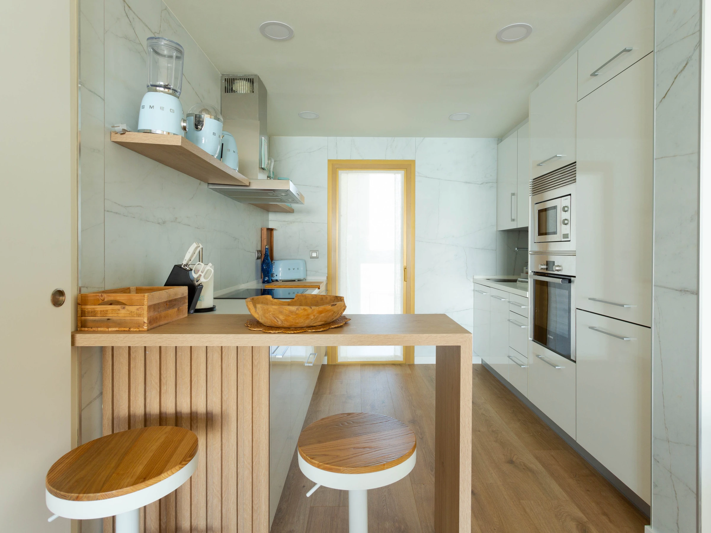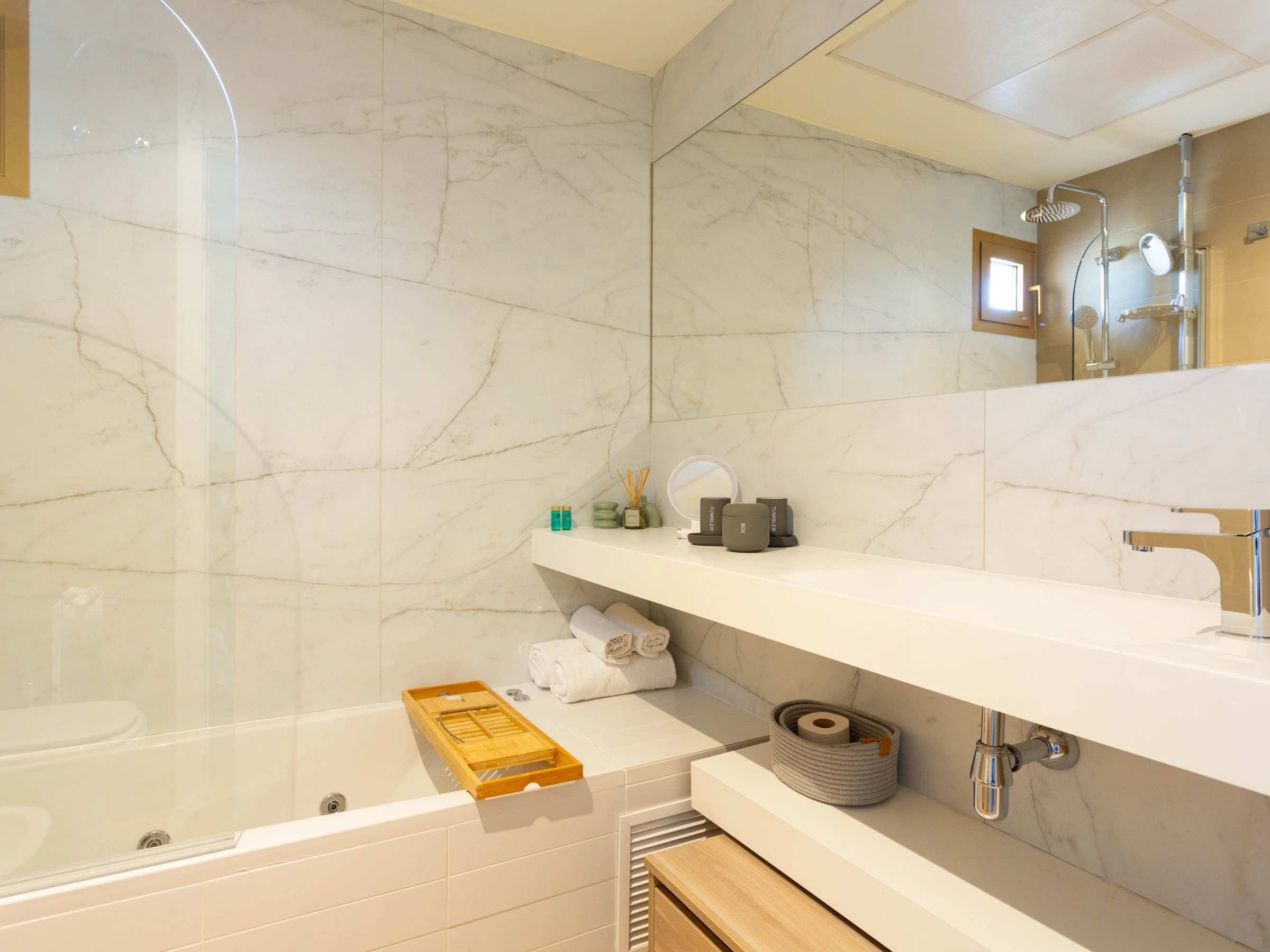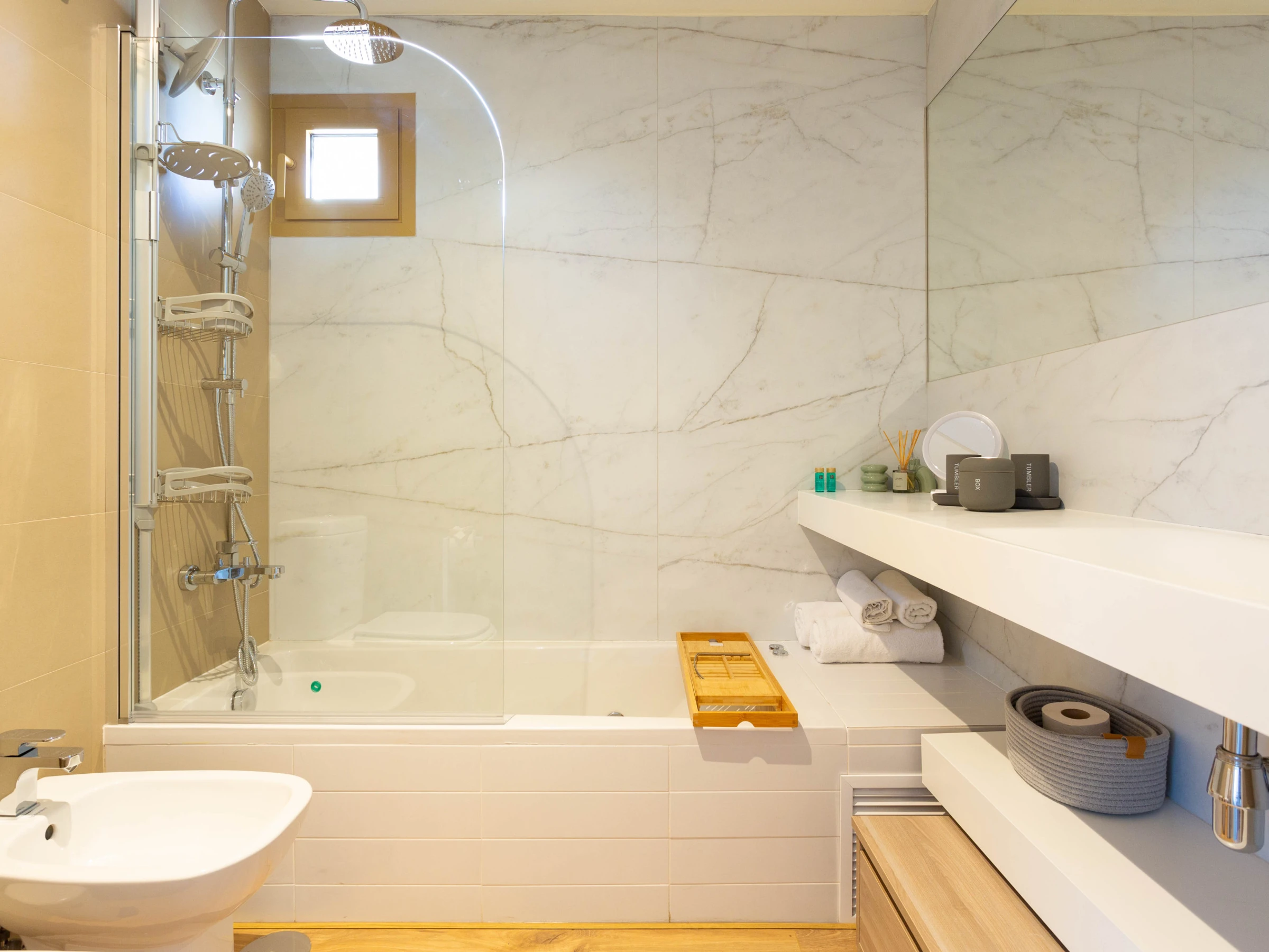 Die Einrichtungen der Wohnung sind hervorragend. Sie verfügt über zwei Badezimmer, eines mit Dusche und eines mit Badewanne, was den Komfort der Gäste erleichtert. Die separate Küche ist vollständig ausgestattet mit Haushaltsgeräten von renommierten Marken wie Waschmaschine, Geschirrspüler, Backofen, Mikrowelle und Kaffeemaschine, was es ermöglicht, während des Aufenthalts Mahlzeiten zuzubereiten.