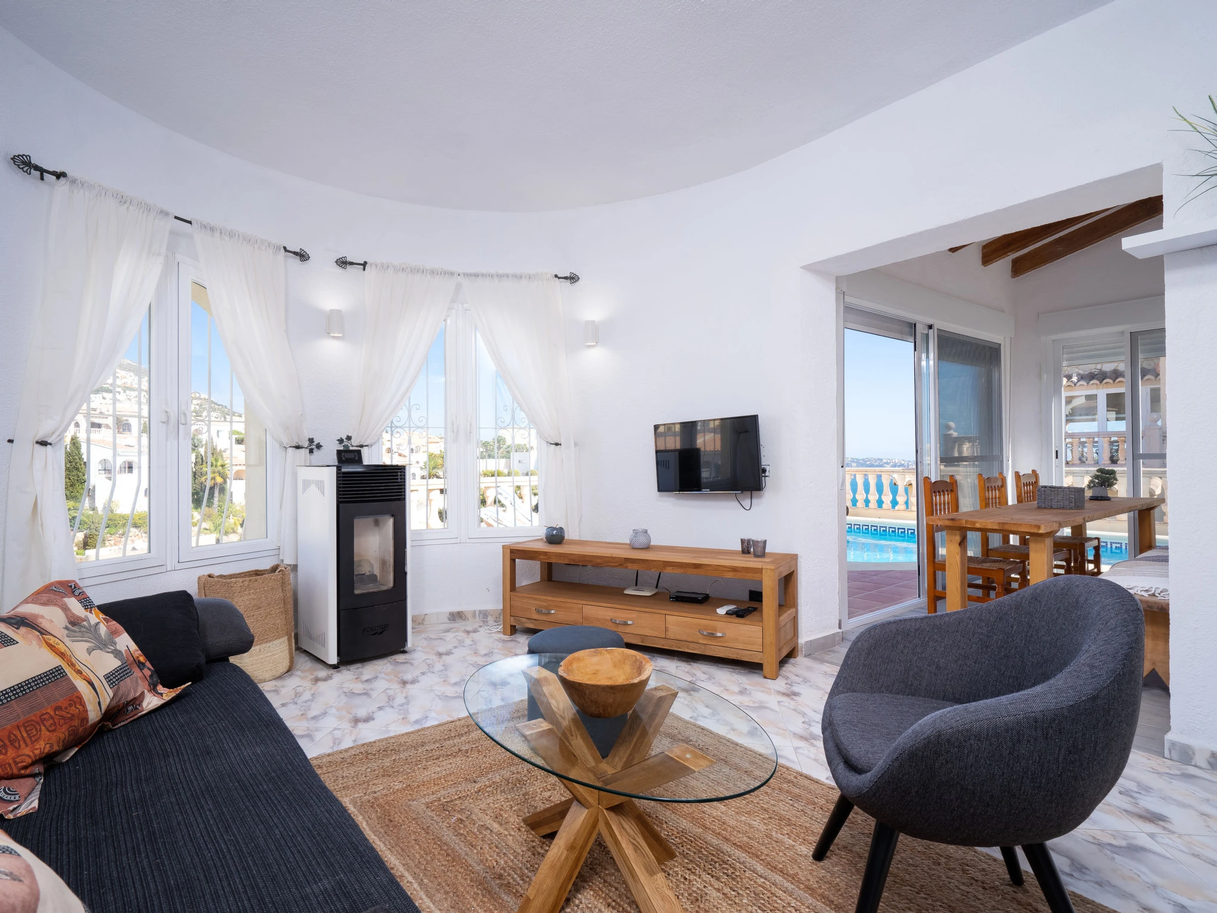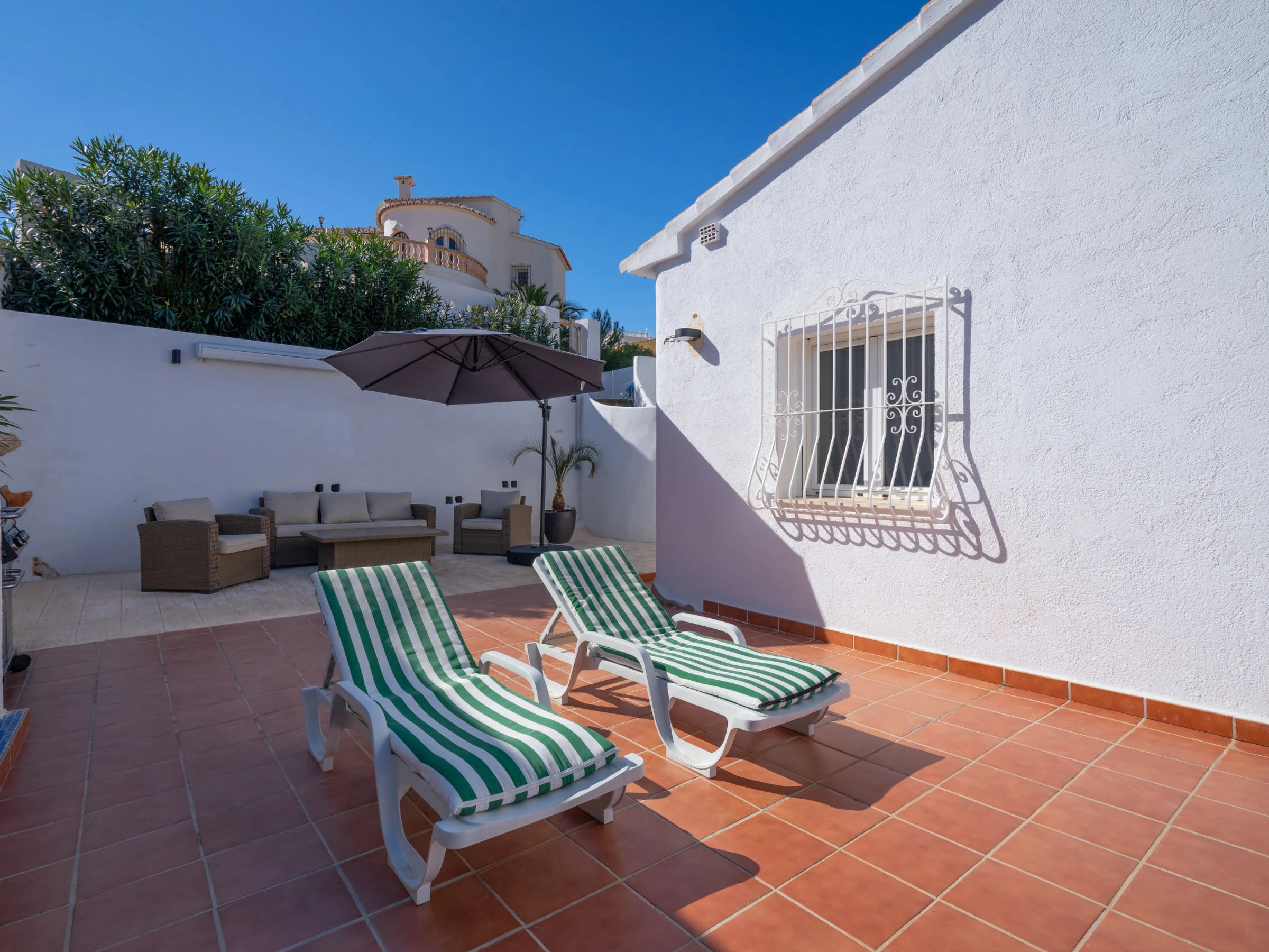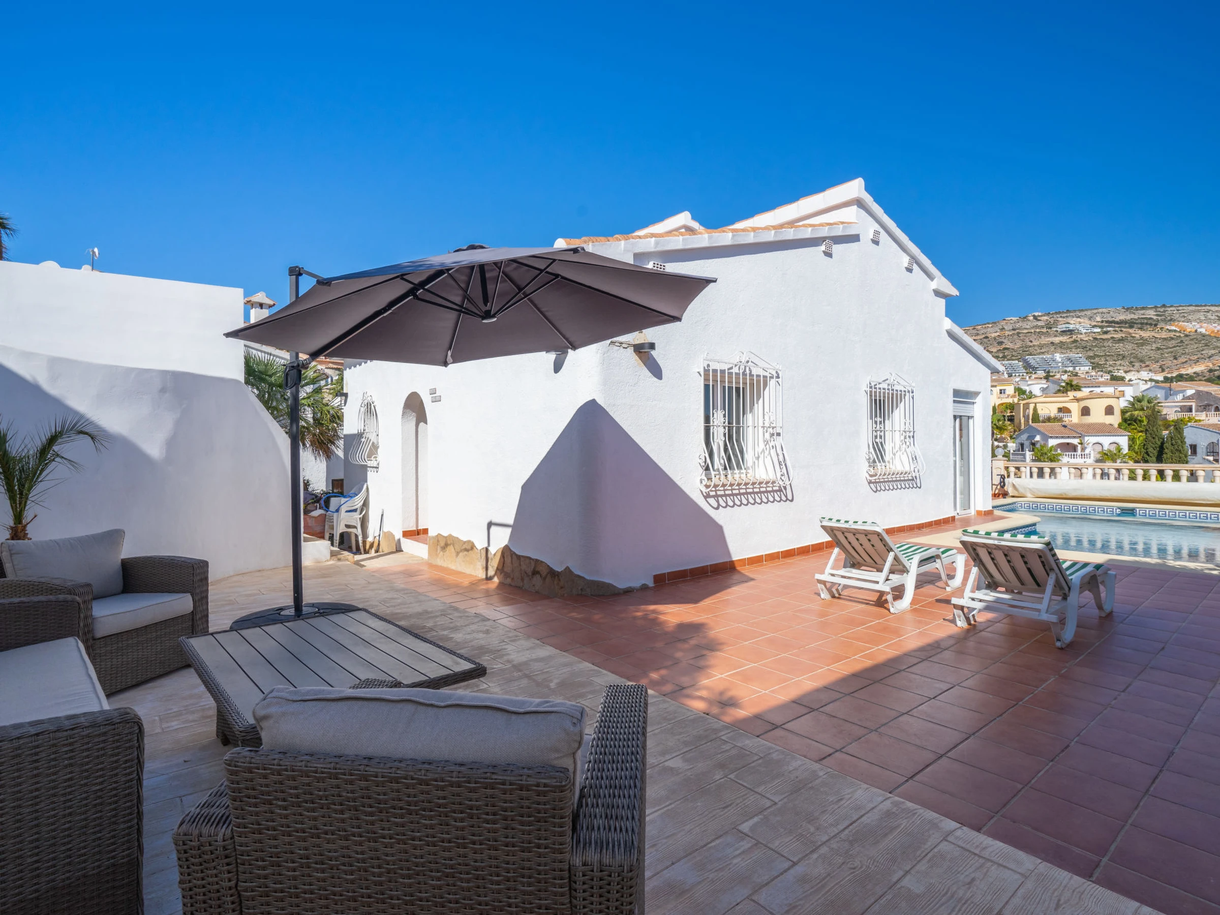 Benitachell: Haus "Lunella", Baujahr 2003. Im Ortsteil Cumbre del Sol, ruhige, sonnige Lage am Hang, 2 km vom Meer. Zur Alleinbenutzung: Grundstück 450 m2, Schwimmbad (4 x 8 m, saisonale Verfügbarkeit: [hidden] - [hidden] mit Innentreppe. Aussendusche. Treppenweg (14 Stufen) bis zum Haus. Öffentliche Parkplätze auf der Strasse. Einkaufszentrum, Restaurant 500 m, Bushaltestelle 6 km, Sandstrand "Arenal" 14 km, Badebucht 2 km. Golfplatz (18 Loch) 7.6 km. Der Besitzer akzeptiert keine Jugendgruppen.