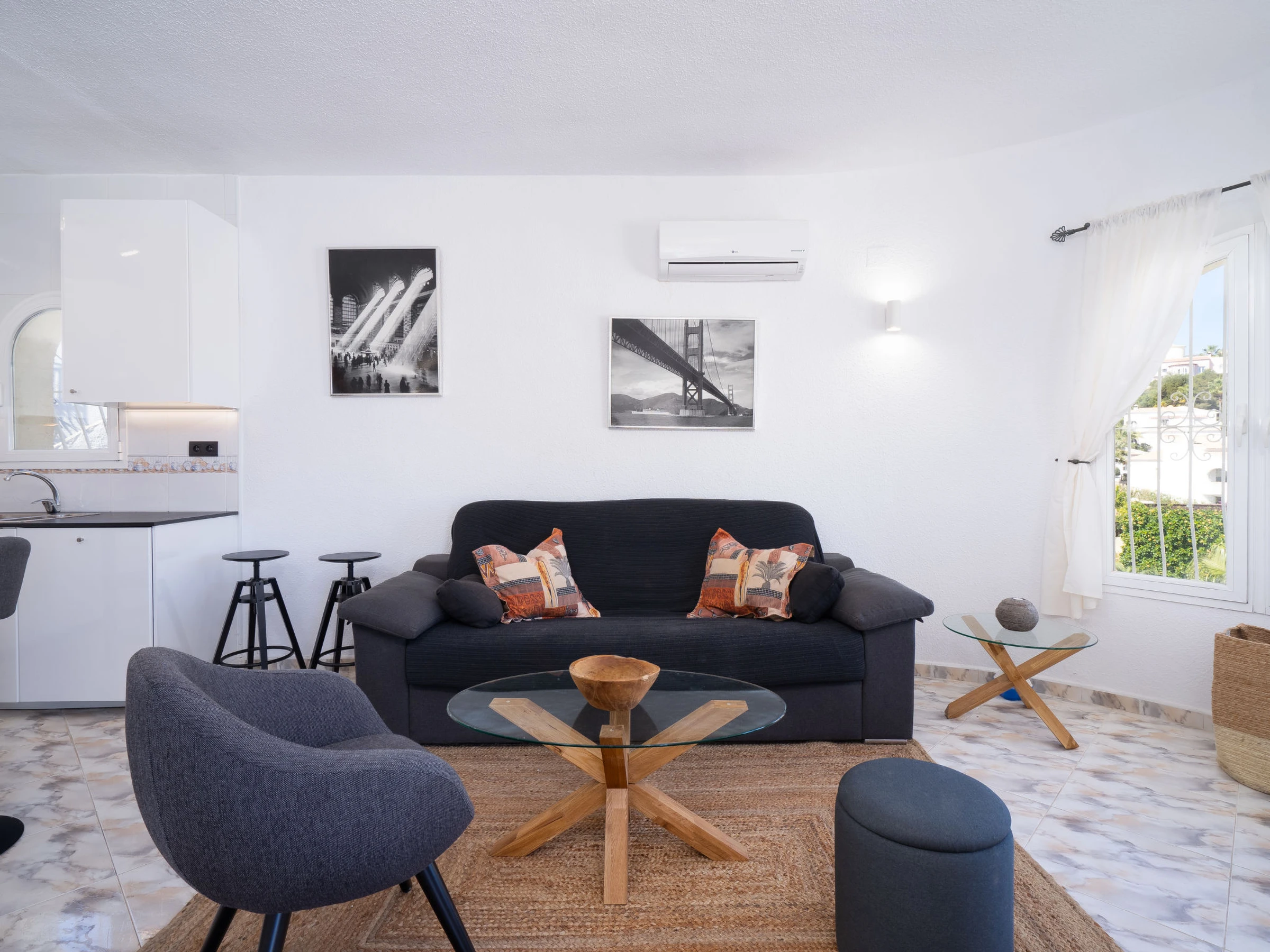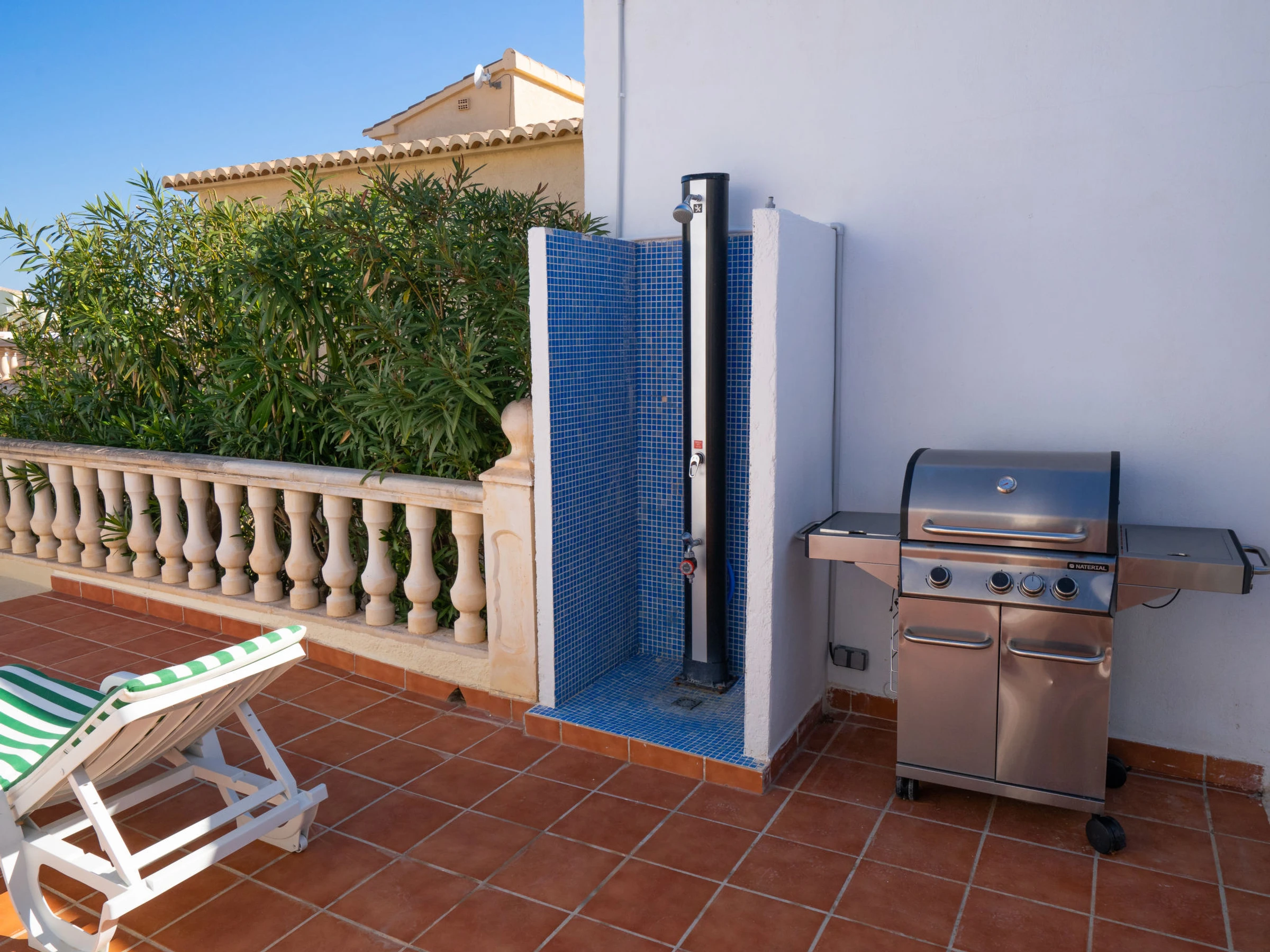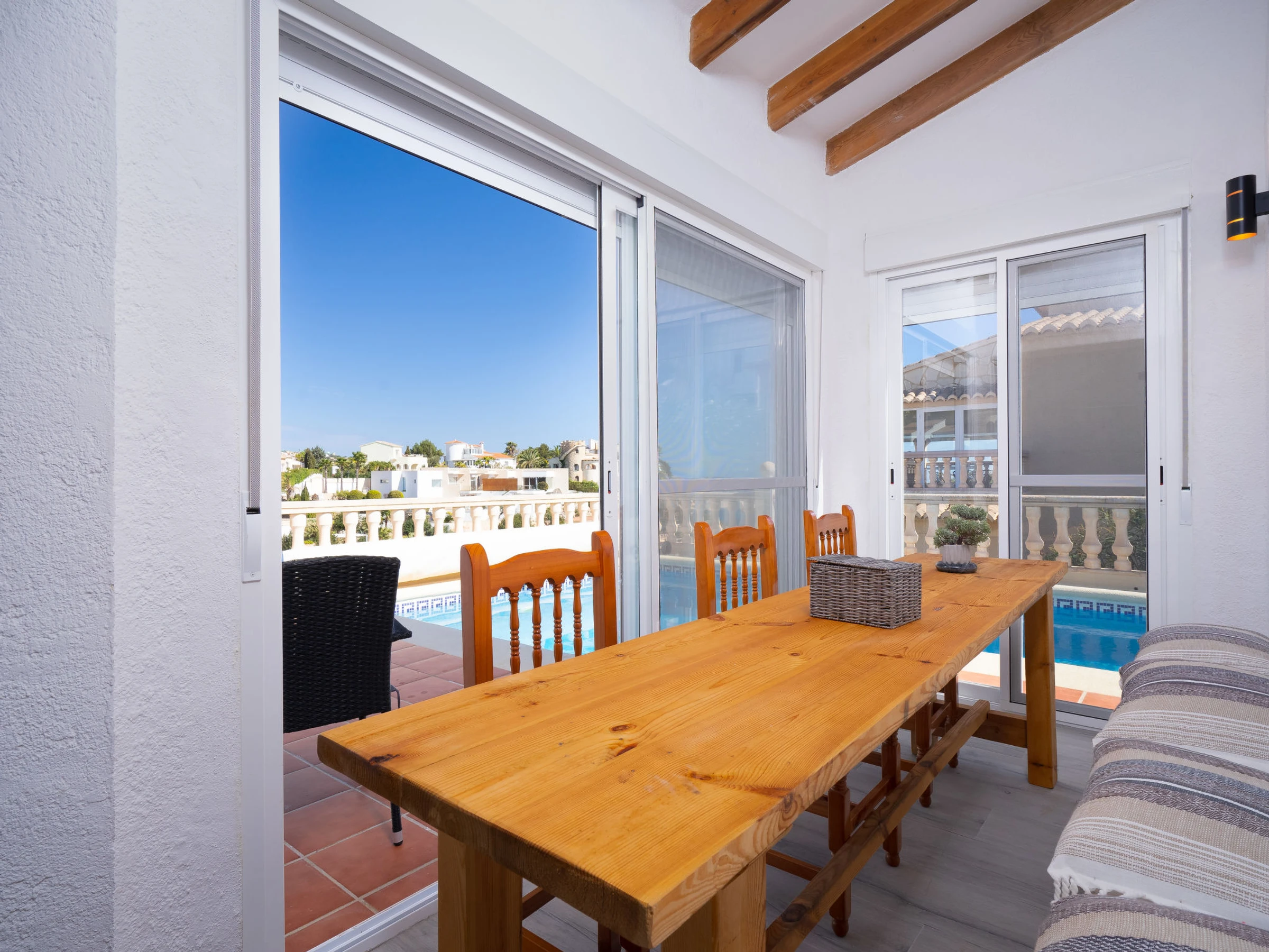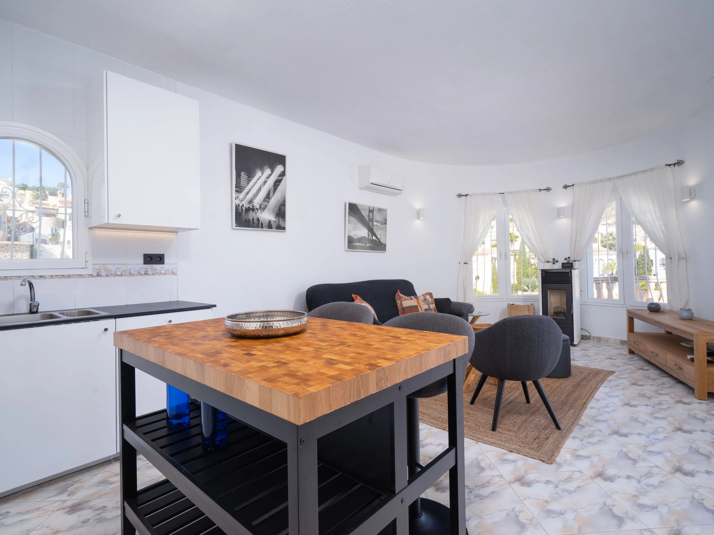 Benitachell: Haus "Lunella", Baujahr 2003. Im Ortsteil Cumbre del Sol, ruhige, sonnige Lage am Hang, 2 km vom Meer. Zur Alleinbenutzung: Grundstück 450 m2, Schwimmbad (4 x 8 m, saisonale Verfügbarkeit: [hidden] - [hidden] mit Innentreppe. Aussendusche. Treppenweg (14 Stufen) bis zum Haus. Öffentliche Parkplätze auf der Strasse. Einkaufszentrum, Restaurant 500 m, Bushaltestelle 6 km, Sandstrand "Arenal" 14 km, Badebucht 2 km. Golfplatz (18 Loch) 7.6 km. Der Besitzer akzeptiert keine Jugendgruppen.