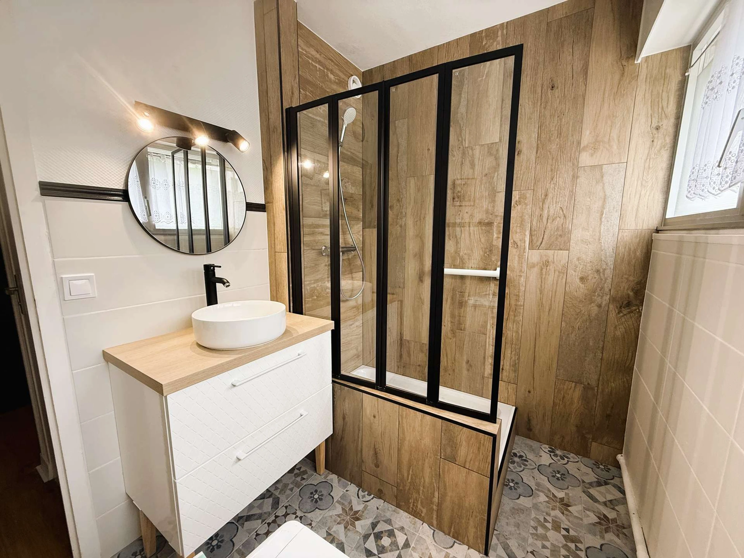 - ein Badezimmer mit großer Dusche und Waschmaschine.