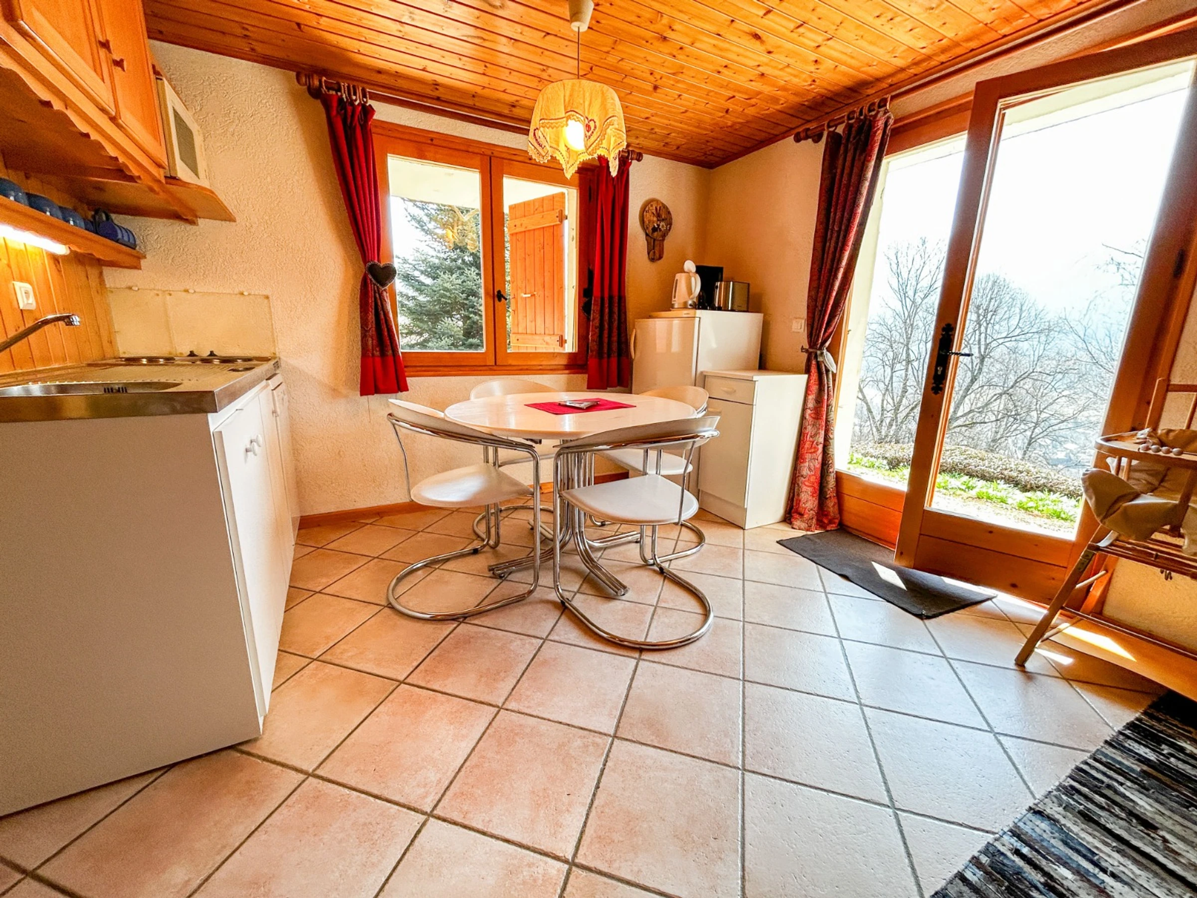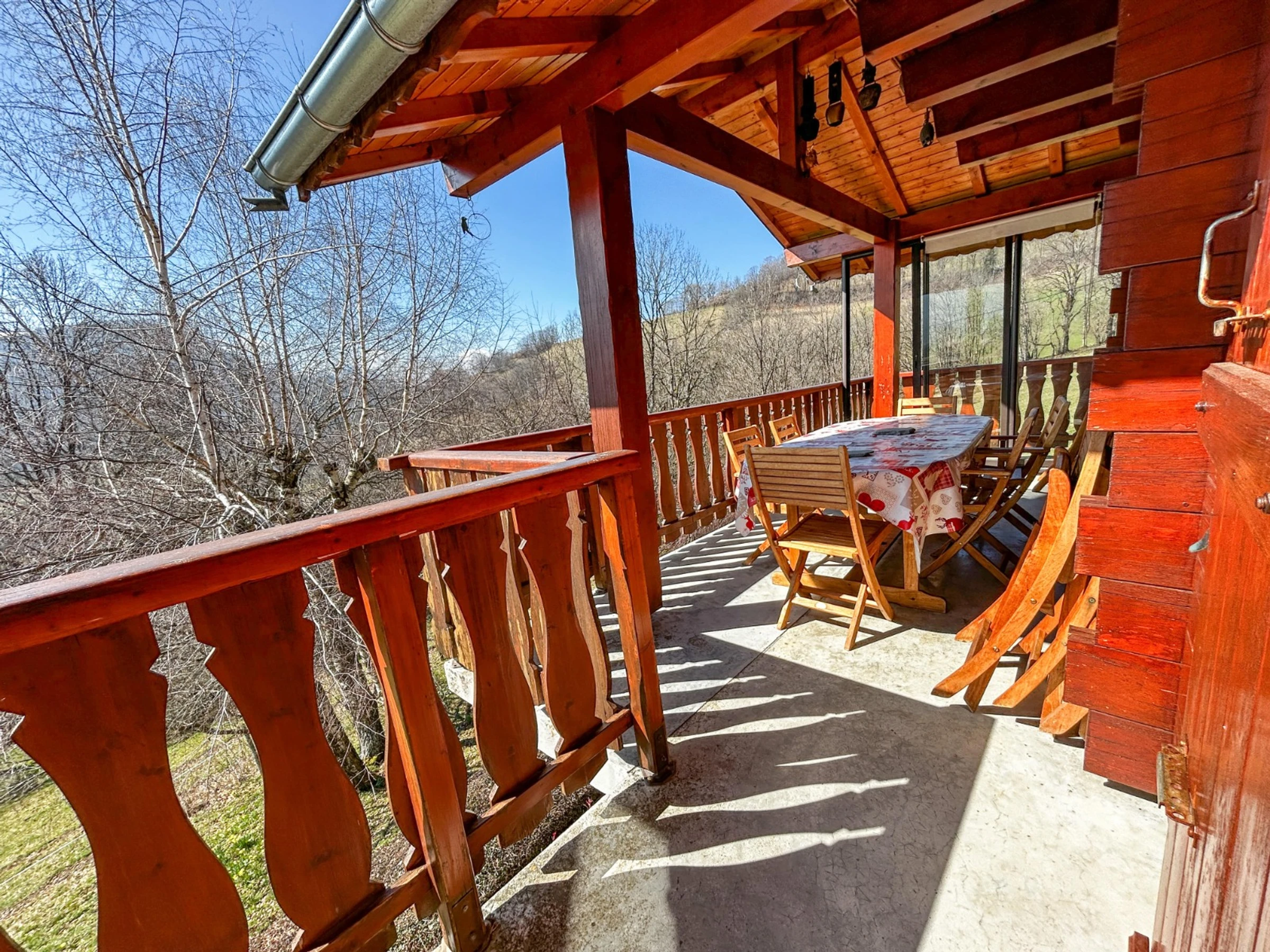 Das Erdgeschoss bietet ein Wohnzimmer mit einem Doppelschlafsofa, einem Fernseher, einem Holzofen, einem offenen Esszimmer mit einer voll ausgestatteten Küche (Gasherd mit Backofen, Mikrowelle, Geschirrspüler usw.) und zwei großen Balkonen mit herrlichem Blick auf die Berge. Außerdem gibt es ein Badezimmer (Dusche, WC) und ein Schlafzimmer mit Doppelbett.