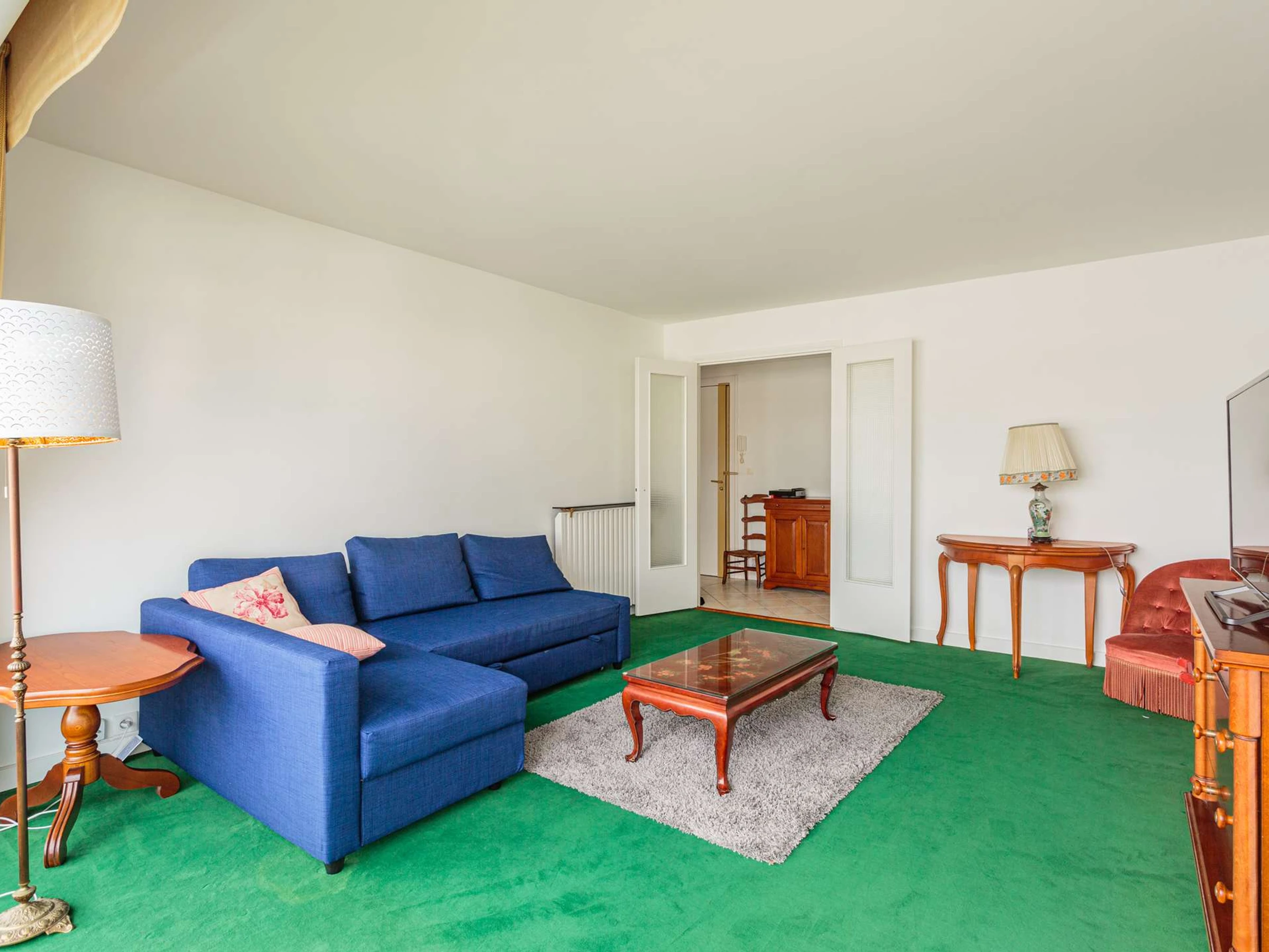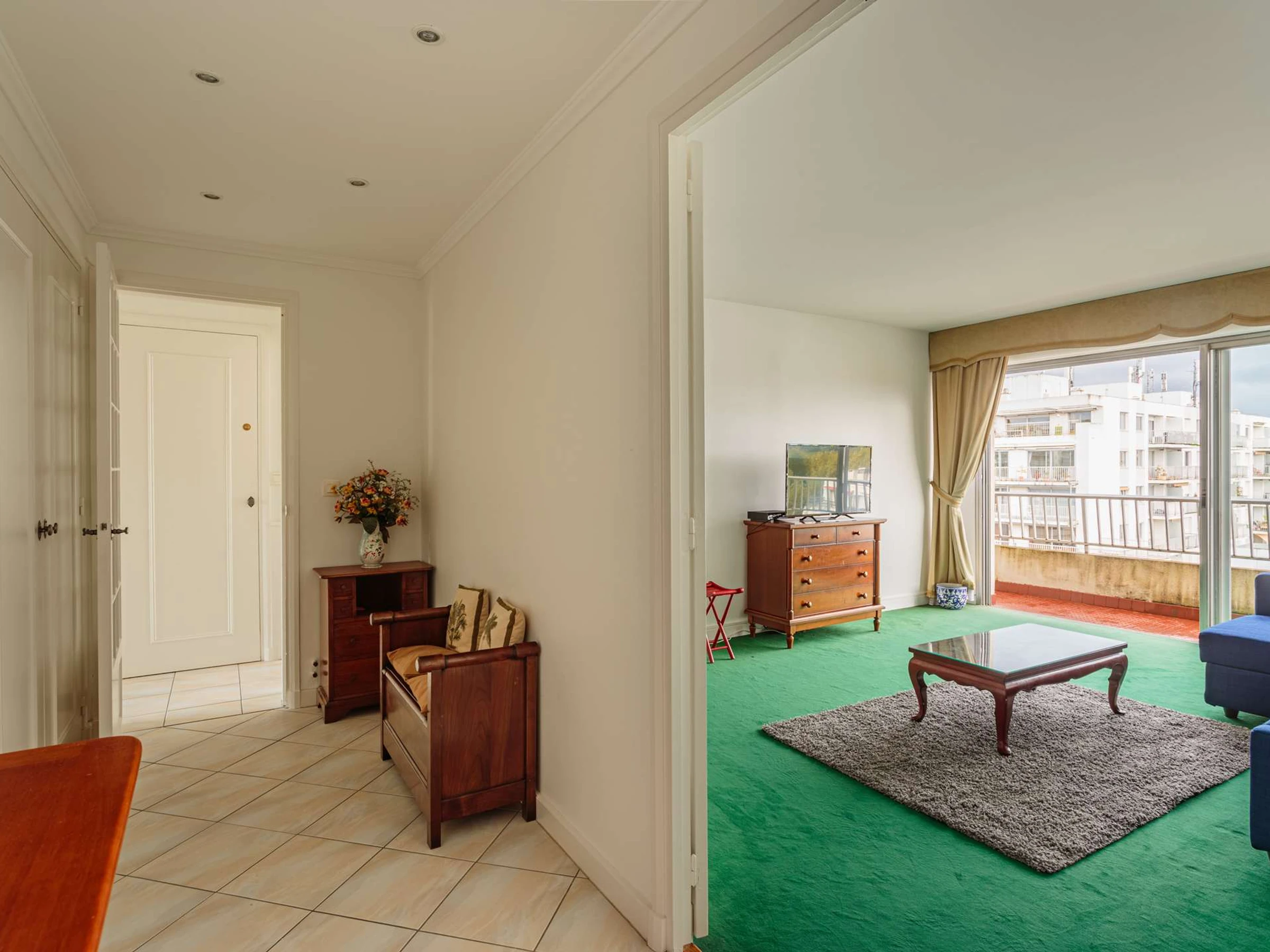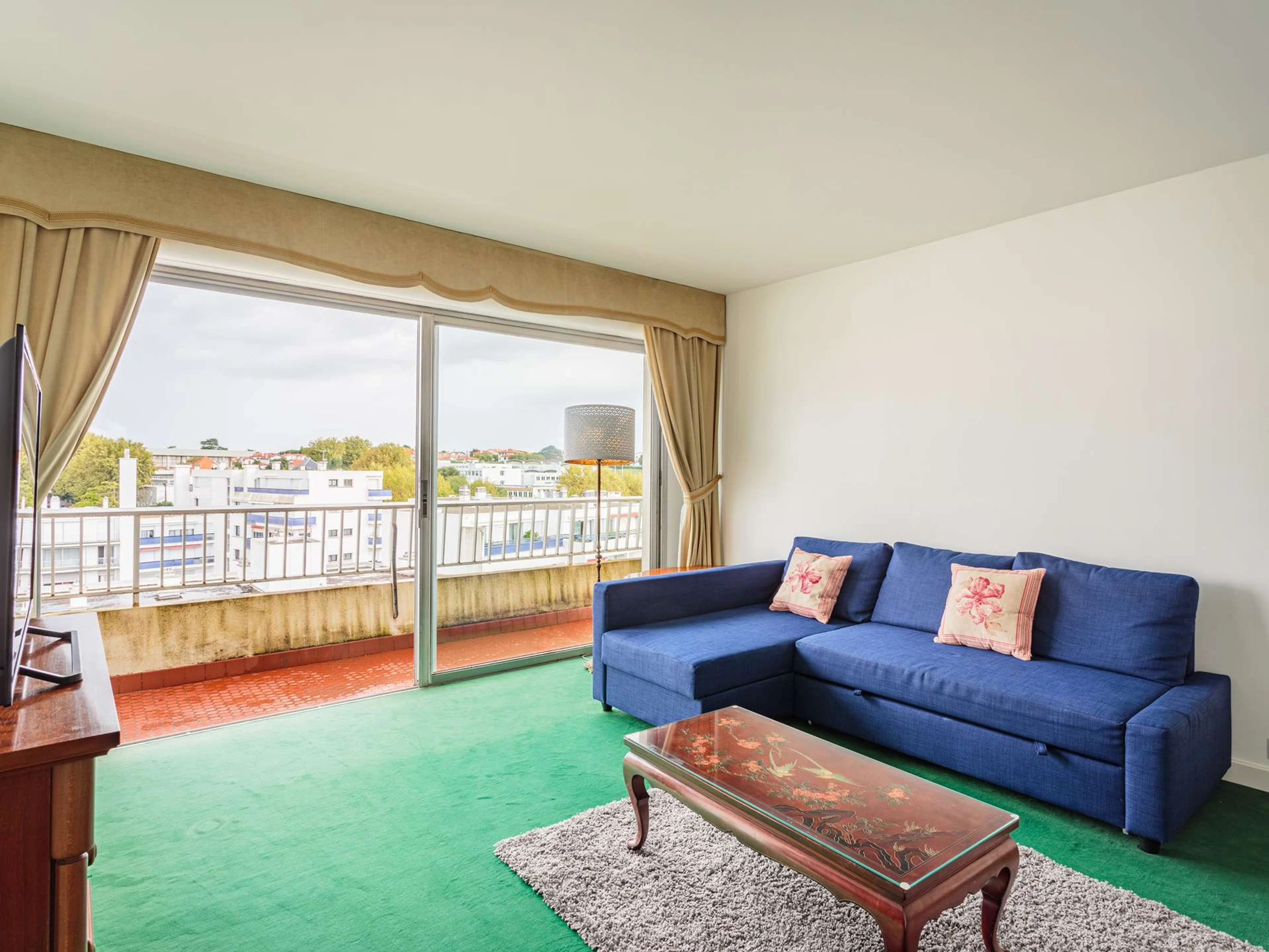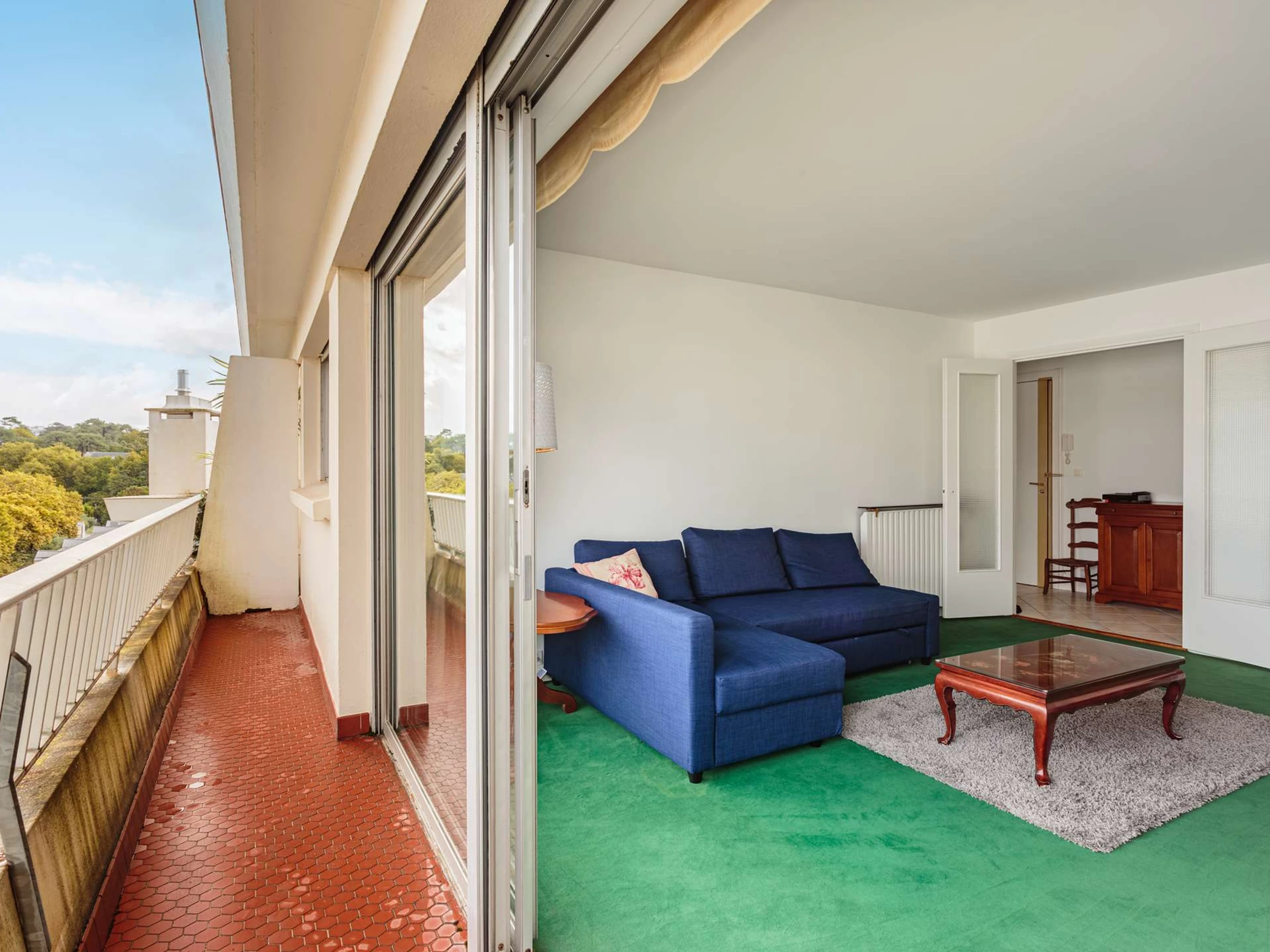 Das Apartment verfügt über ein großes Wohnzimmer mit Zugang zu einem durchgehenden Balkon und eine separate, voll ausgestattete Küche.