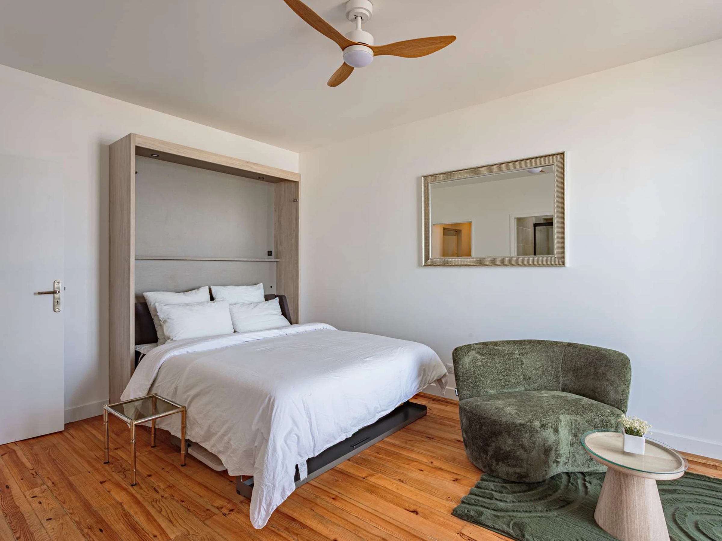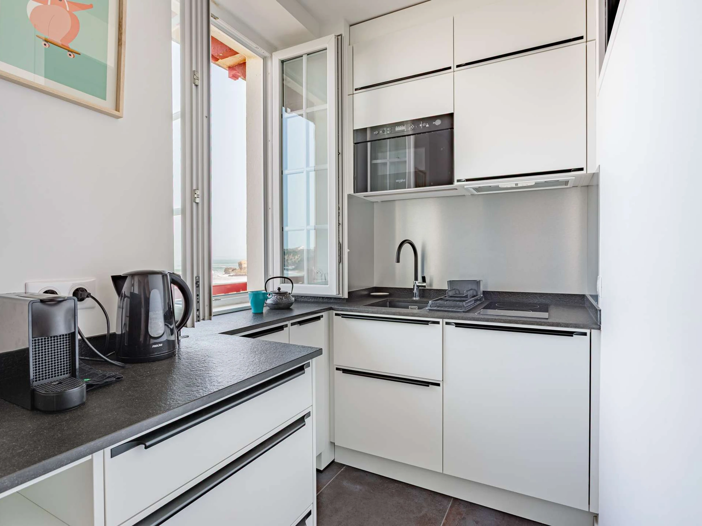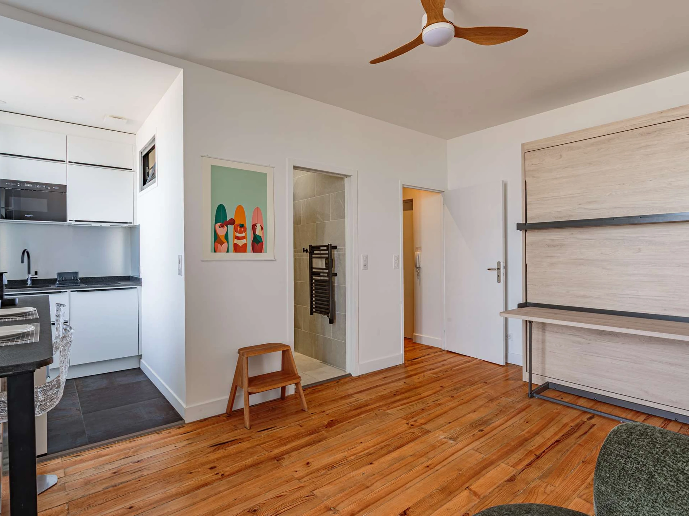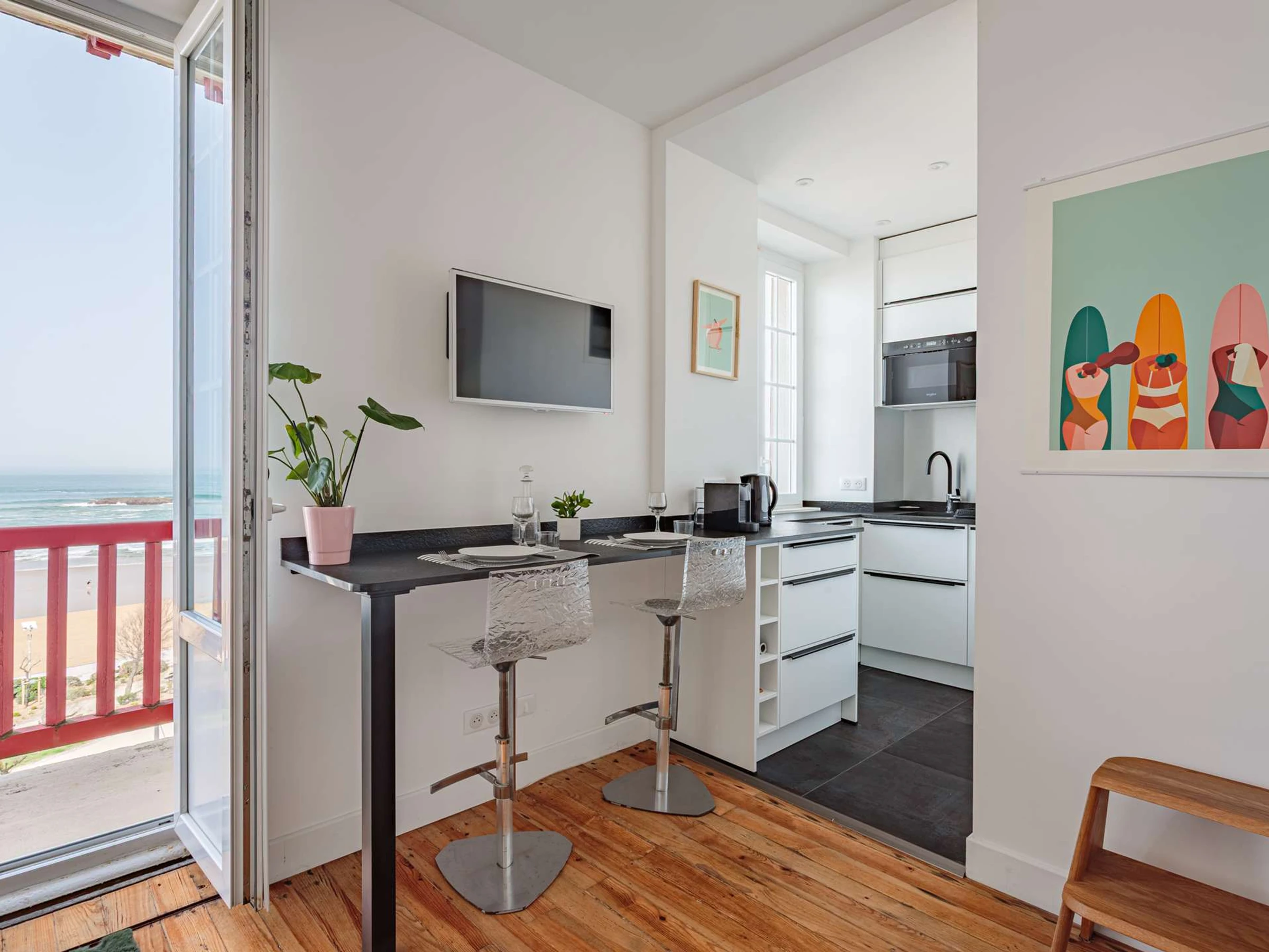 Es umfasst eine offene Küche mit Essbereich und direktem Blick auf die Grande Plage, einen funktionalen Wohnbereich mit einem neuen 160 cm breiten Klappbett, ein Badezimmer mit WC und einen Ankleidebereich.