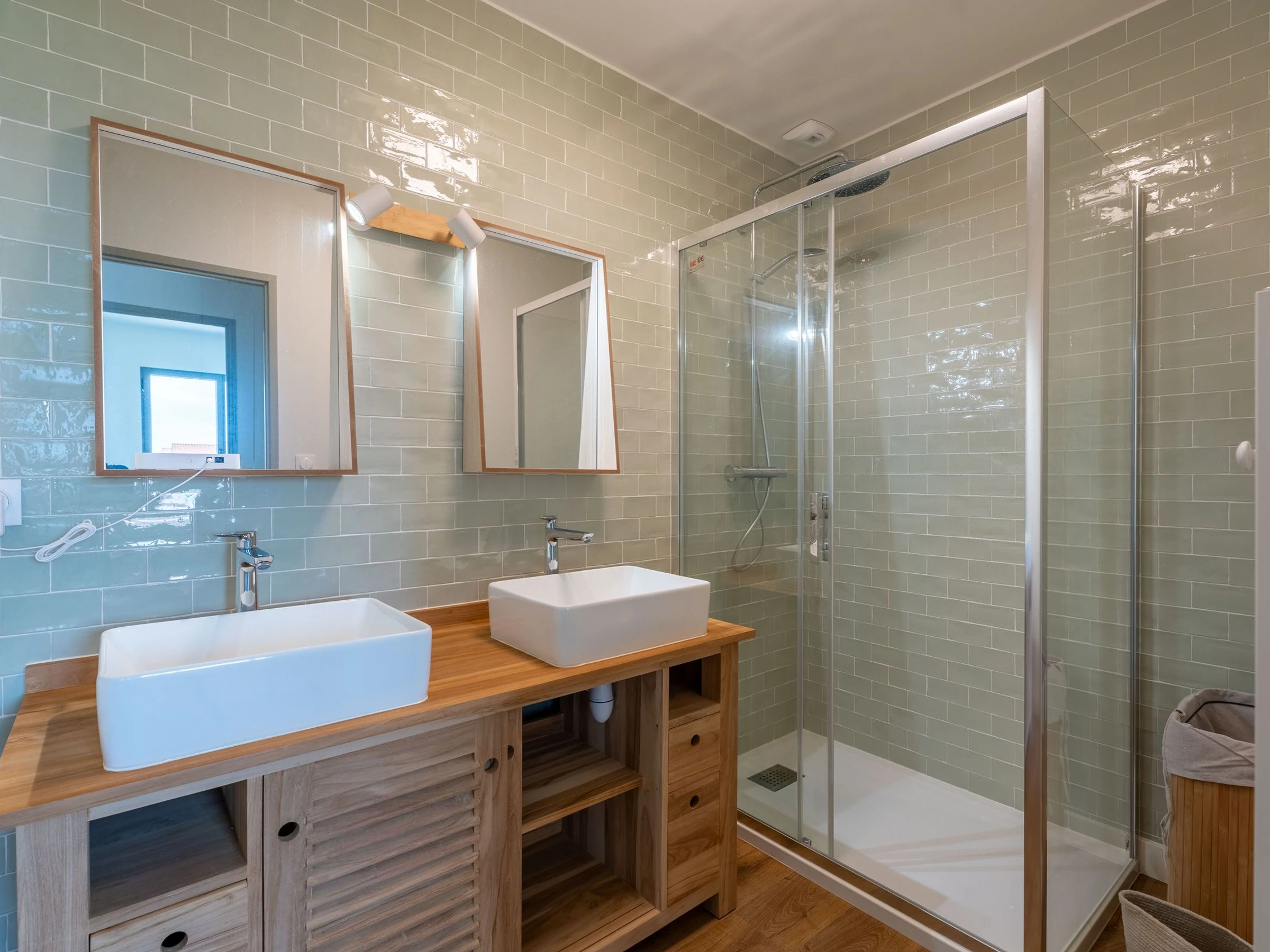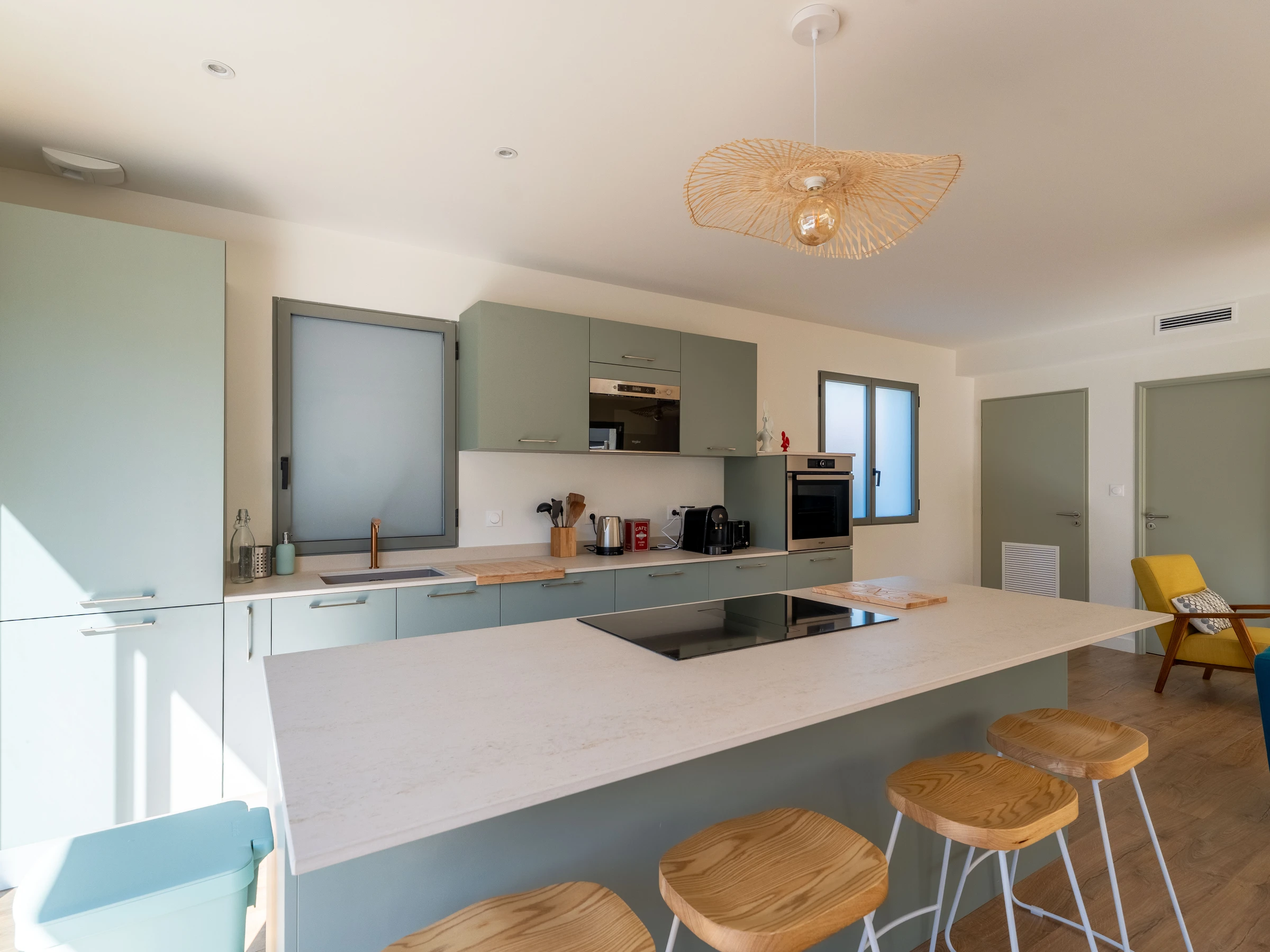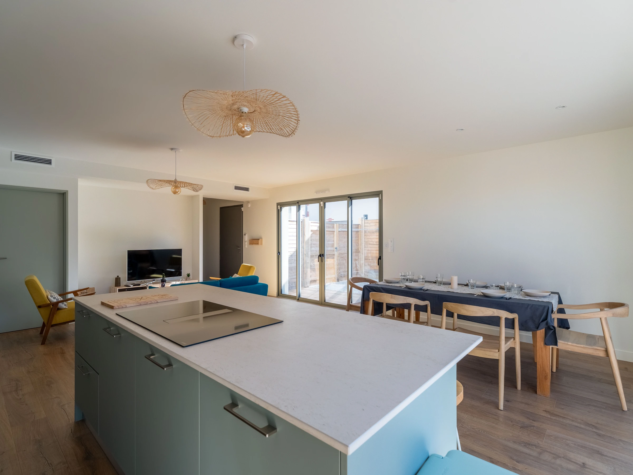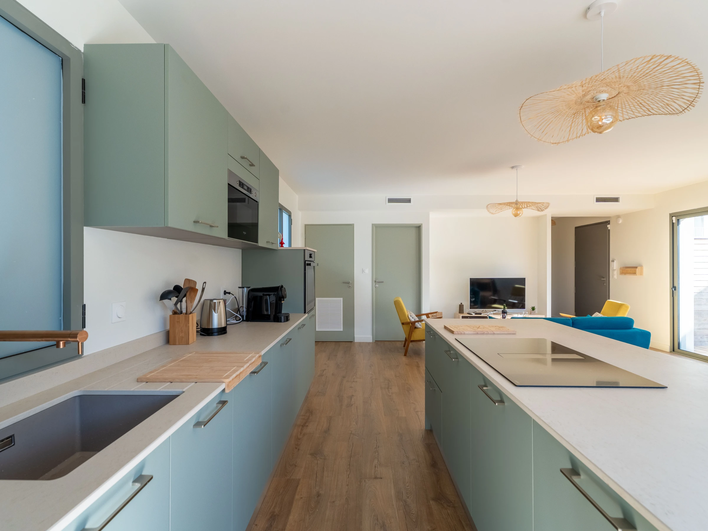 - Großes, helles Wohnzimmer mit voll ausgestatteter offener Küche, WLAN und TV – perfekt für gesellige Stunden.
