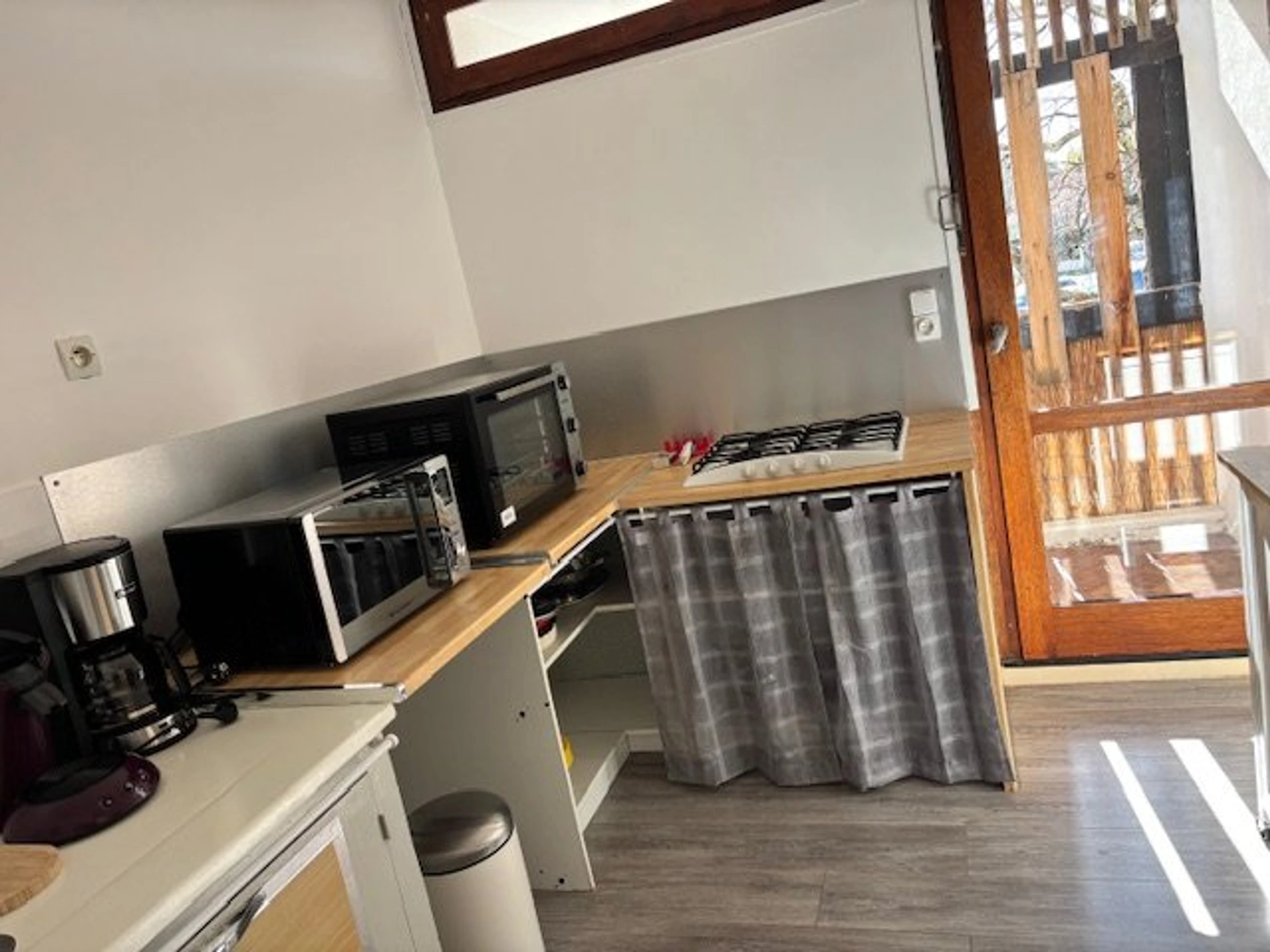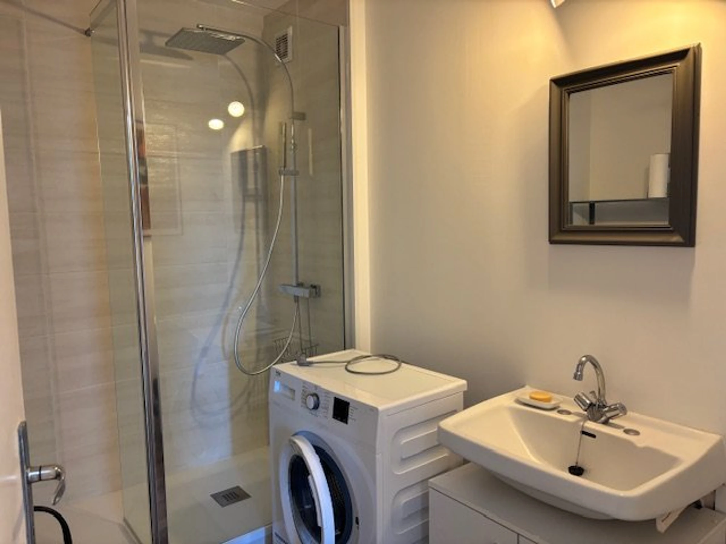 Die Wohnung bietet ein Duschbad, ein separates WC und eine voll ausgestattete Küche: ein Gasherd mit vier Kochstellen, eine Senseo-Kaffeemaschine, eine Filterkaffeemaschine, einen Kühlschrank mit Gefrierfach, eine Mikrowelle und einen Backofen mit Grillfunktion. Eine Waschmaschine ist ebenfalls vorhanden.