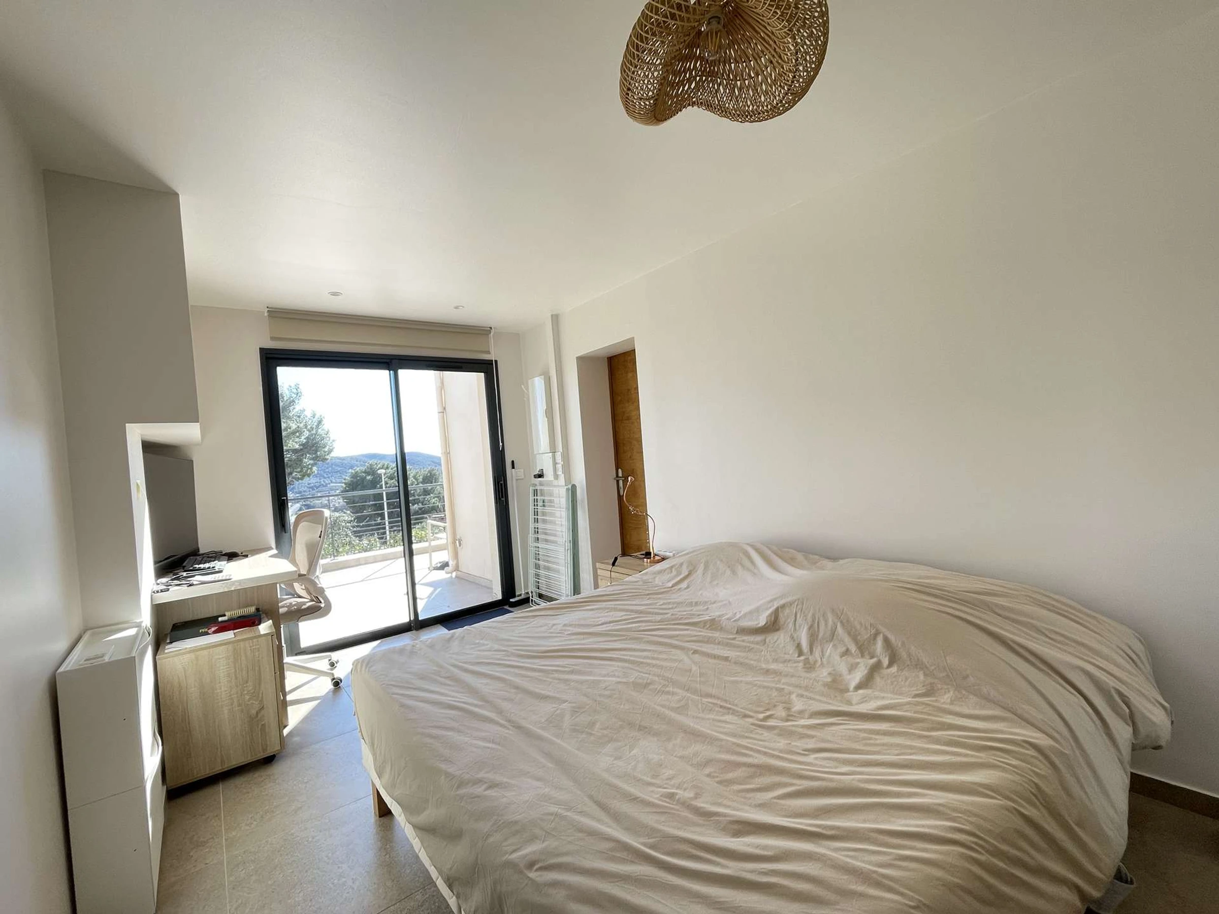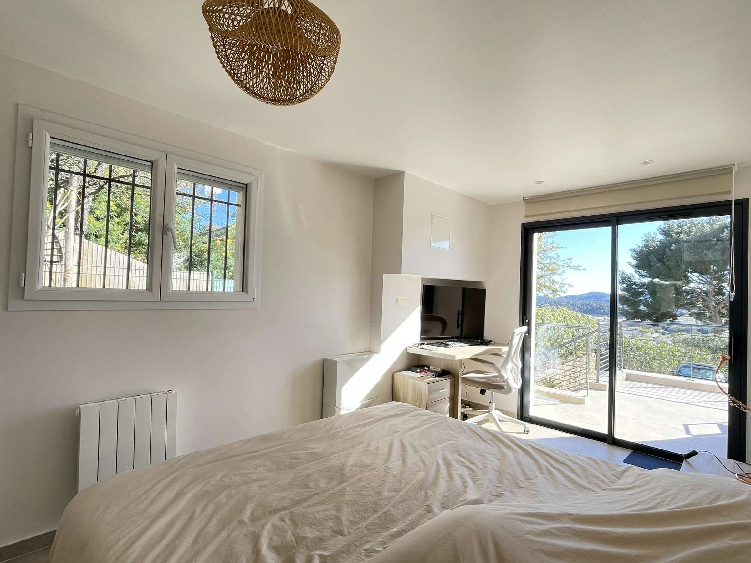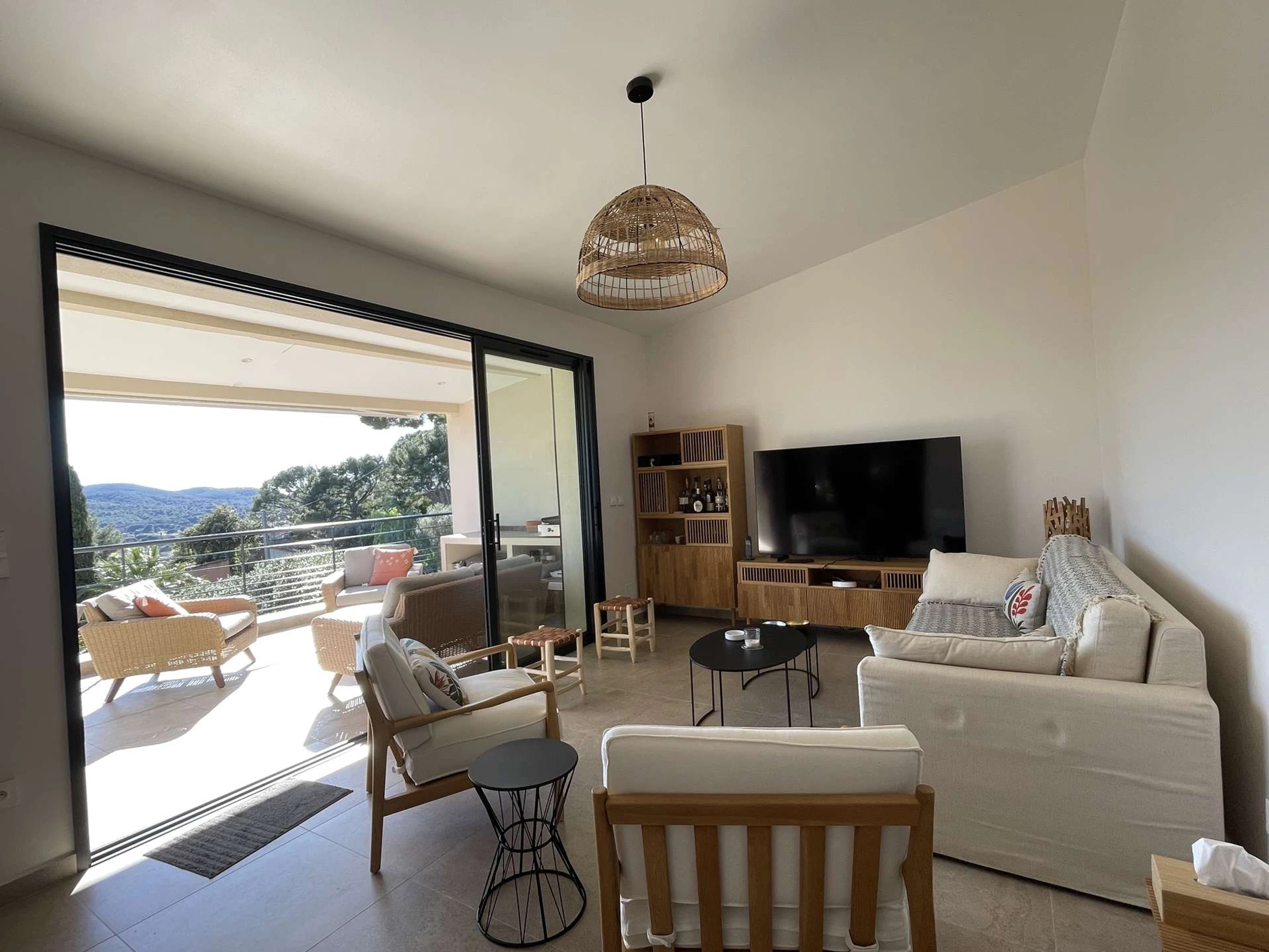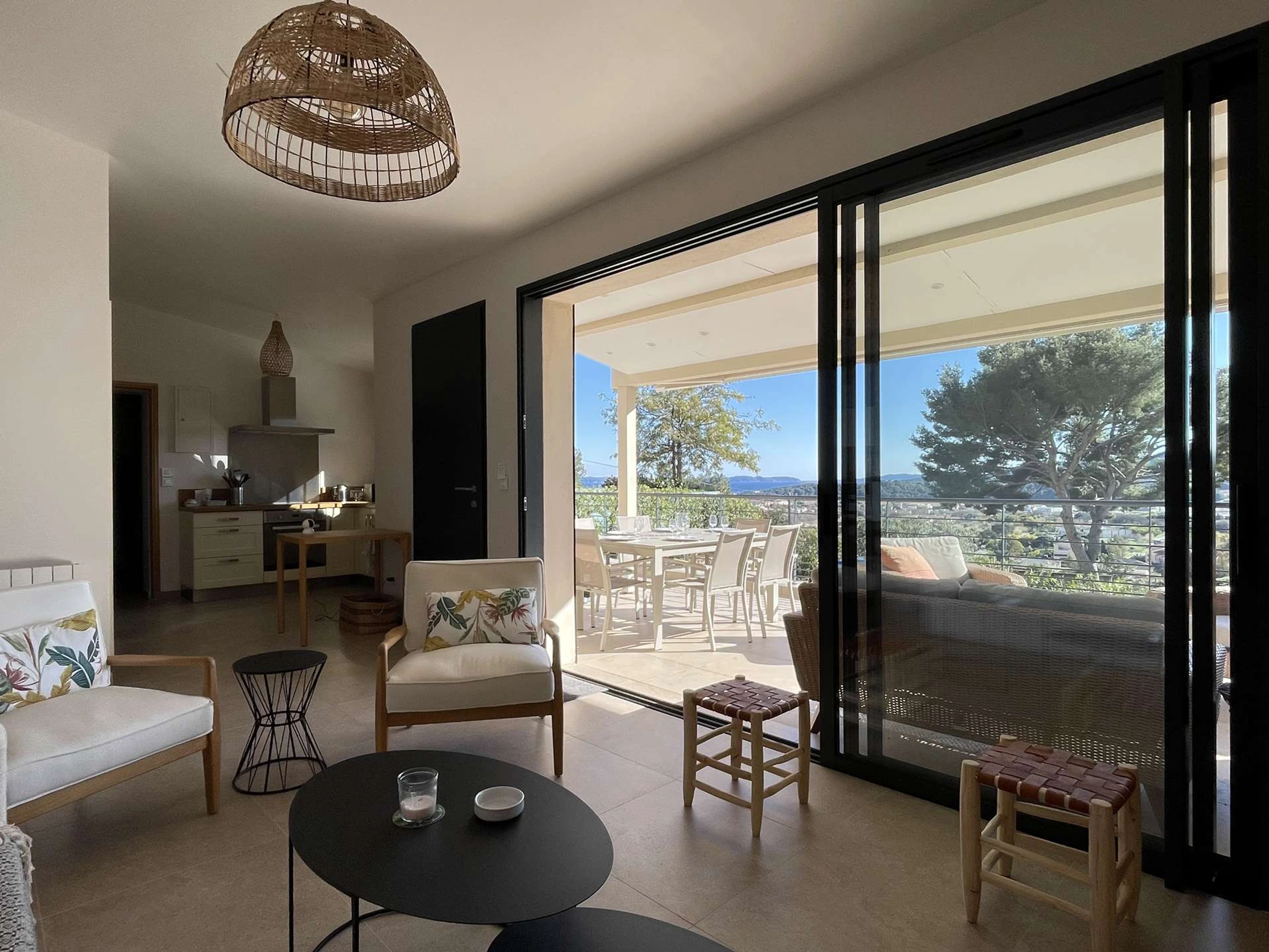 Es bietet einen herrlichen Blick auf die Domaine de l'Anglade und einen Blick auf das Meer und bietet Platz für bis zu 6 Personen. Das helle Wohnzimmer heißt Sie herzlich willkommen und öffnet sich zu einer wunderschönen Terrasse mit Blick auf das Meer, perfekt für Ihre Mahlzeiten im Freien oder Momente der Entspannung.