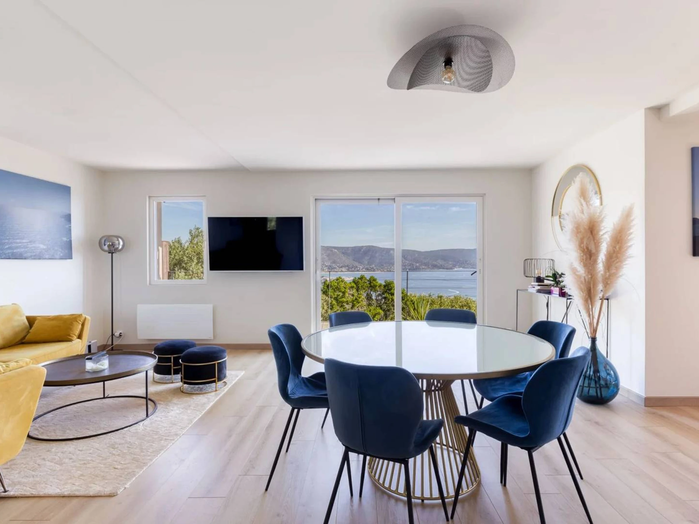 Dieses herrliche Anwesen auf dem exklusiven Anwesen Cap Bénat bietet einen Panoramablick, der von Bormes-les-Mimosas über den Hafen von Le Lavandou bis zum Cap Nègre reicht und schließlich vor der Küste von Cap Lardier in Richtung Sonnenuntergang und den Goldenen Inseln verschwindet.