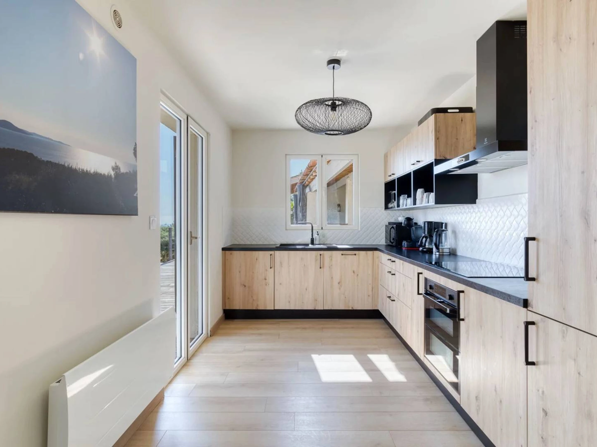 Eine möblierte Terrasse (Bar und großer Holztisch) verbindet die beiden Bereiche und bietet einen atemberaubenden Blick auf das Meer und die Küste.