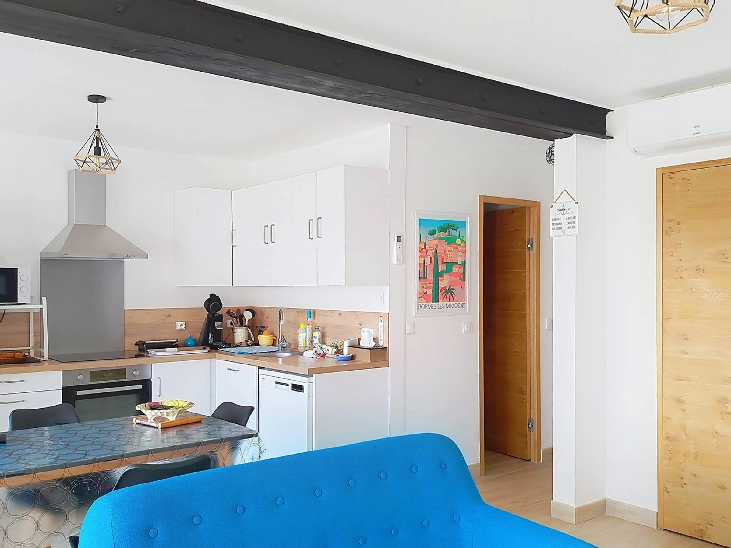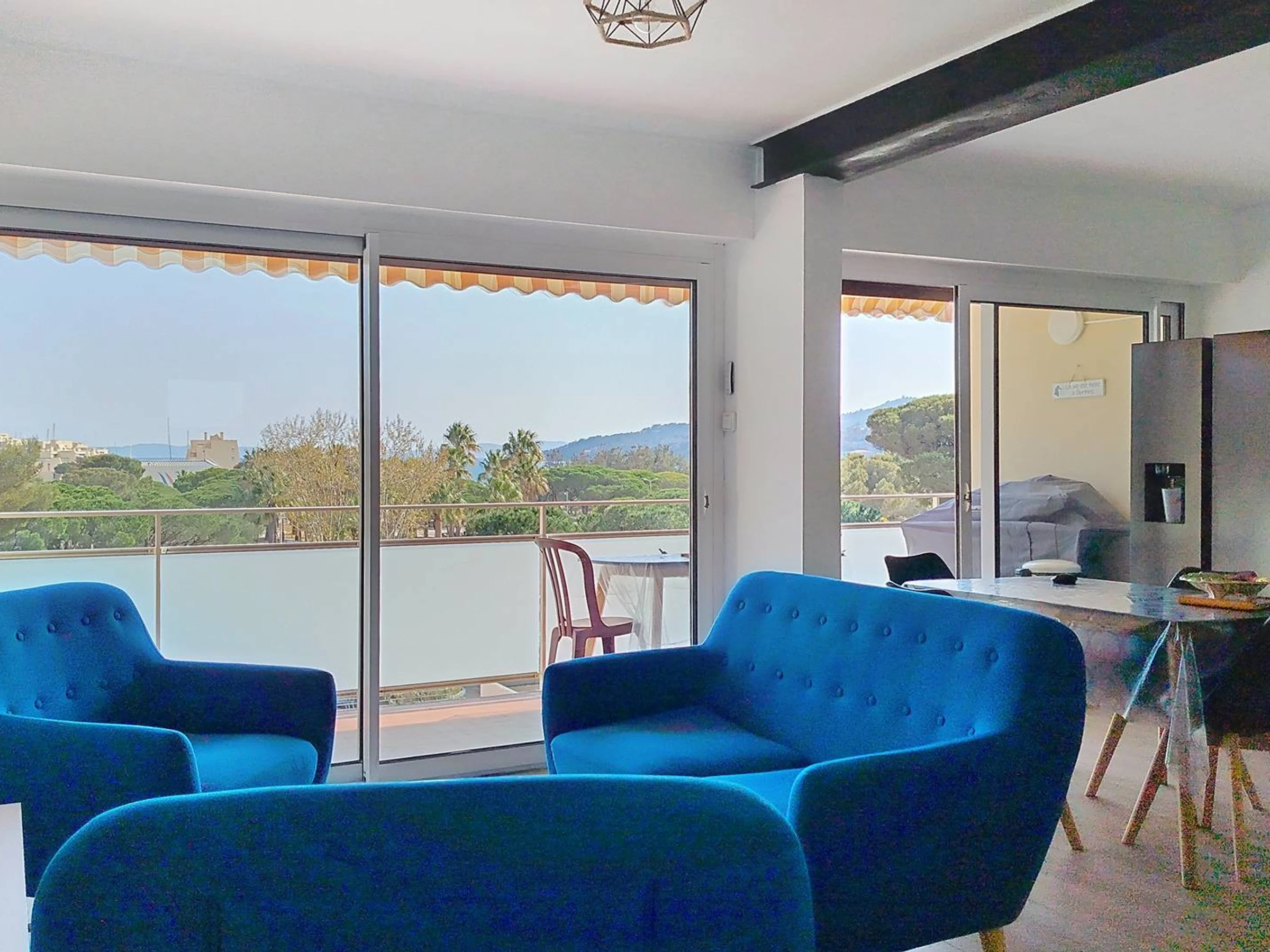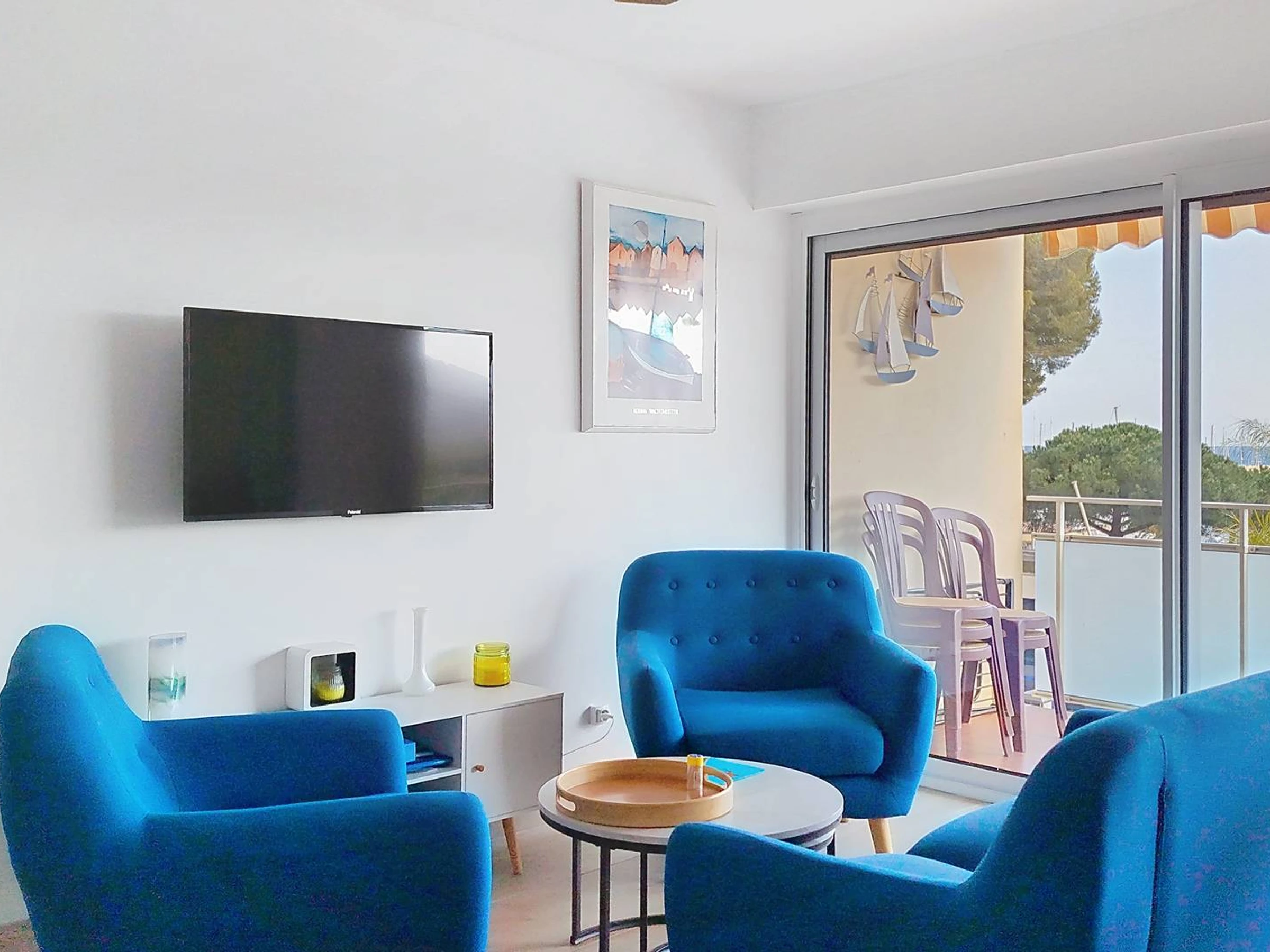 Dieses charmante, klimatisierte Apartment mit zwei Schlafzimmern (55 m²) im Herzen des Viertels La Favière befindet sich im 2. Stock und bietet Platz für bis zu 5 Personen. Es verfügt über ein Schlafzimmer (mit Queensize-Bett), ein kleines Schlafzimmer (mit Etagenbett und Schlafcouch), einen Wohnbereich mit Sitzecke (mit Sofa, Sesseln und Wandfernseher), eine offene Wohnküche (mit amerikanischem Kühlschrank, Geschirrspüler, Mikrowelle, Backofen und Induktionskochfeld), ein separates WC, ein Badezimmer (mit Dusche und Waschmaschine) sowie eine möblierte Südterrasse mit teilweisem Meer- und Hügelblick auf den Brunnenplatz von La Favière. Bettwäsche kann gegen Aufpreis gemietet werden und muss mindestens eine Woche vor Anreise bestellt werden. Die Endreinigung ist im Preis inbegriffen (außer bei Kurzzeitmieten). Es gibt keinen privaten Parkplatz (Garagenstellplatz GAR016 kann in der Residenz für 90 €/Woche angemietet werden).