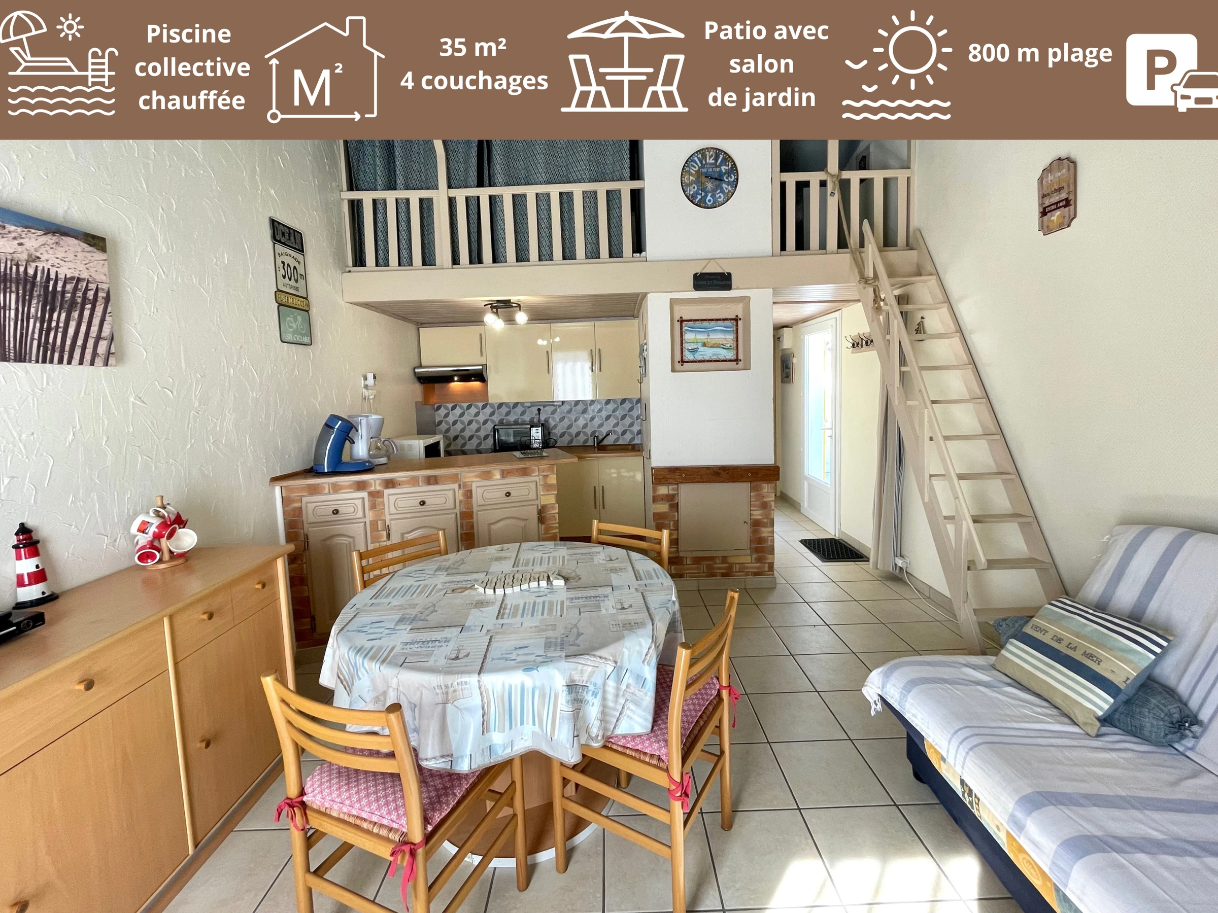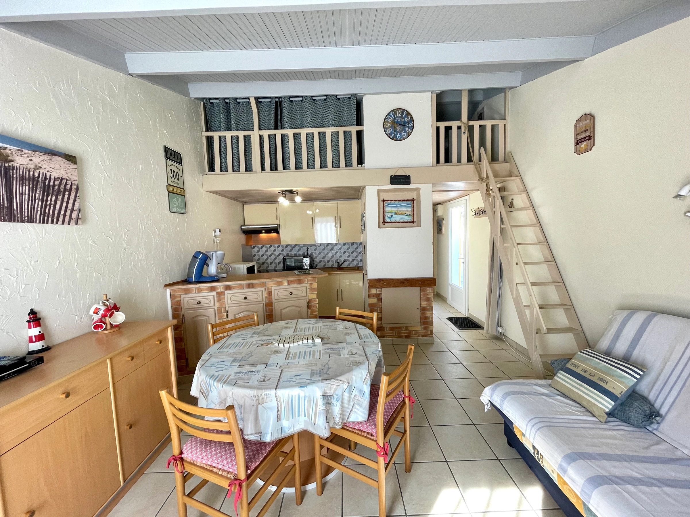 In einer Ferienanlage mit beheiztem Gemeinschaftspool (geöffnet von Mitte Juni bis Mitte September), Tennisplätzen, Spielplatz, Bouleplatz und gemeinschaftlich genutzten Grünflächen bietet dieses ebenerdige Ferienhaus mit einem Schlafzimmer einen Wohnbereich mit einer voll ausgestatteten Küche (kleiner Kühlschrank, kleiner Gefrierschrank, Geschirrspüler, Induktionskochfeld, Minibackofen, Mikrowelle) und einem Ess-/Wohnbereich (Tisch, Stühle, Sideboard, Flachbildfernseher und Schlafcouch für zwei Personen).