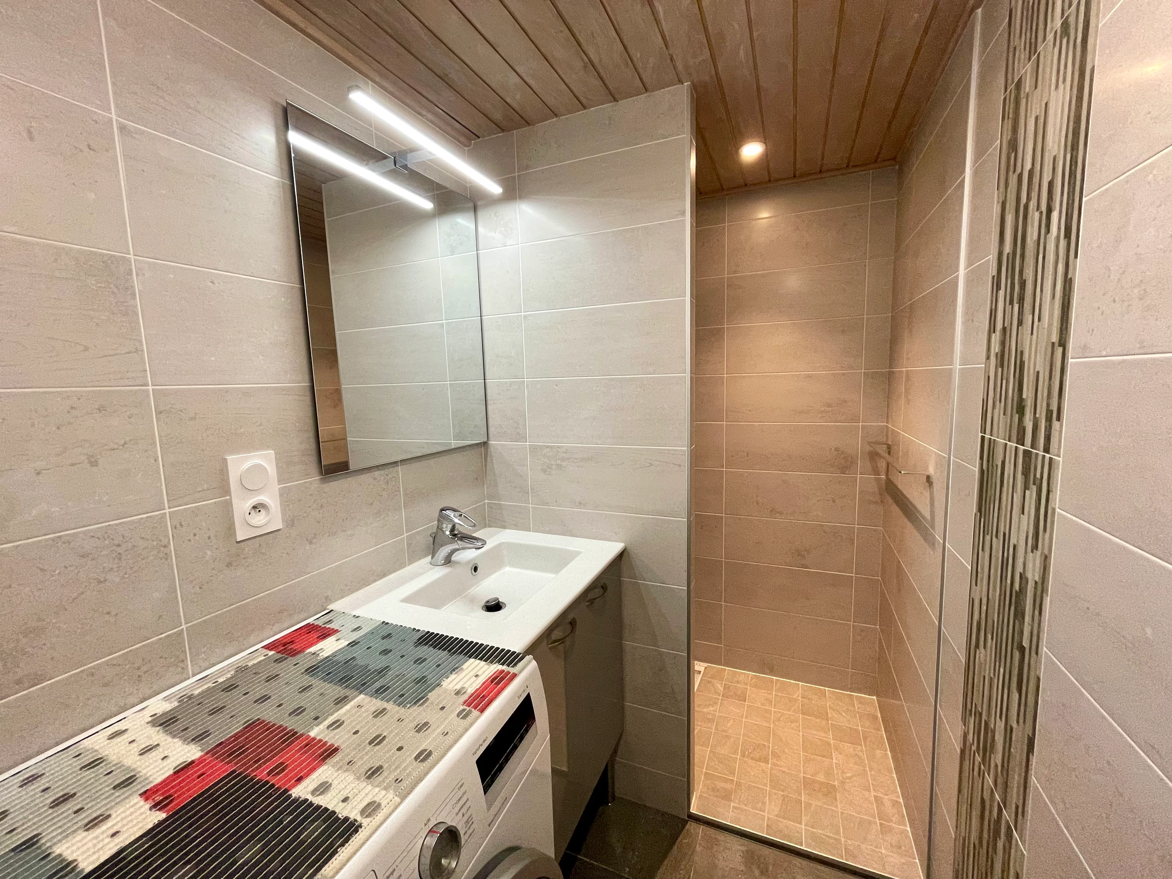 Ein Flur führt zum WC, zum Duschbad (Dusche, Waschtisch, Waschmaschine) und zum Schlafzimmer mit Doppelbett (140 cm) und Kleiderschränken.