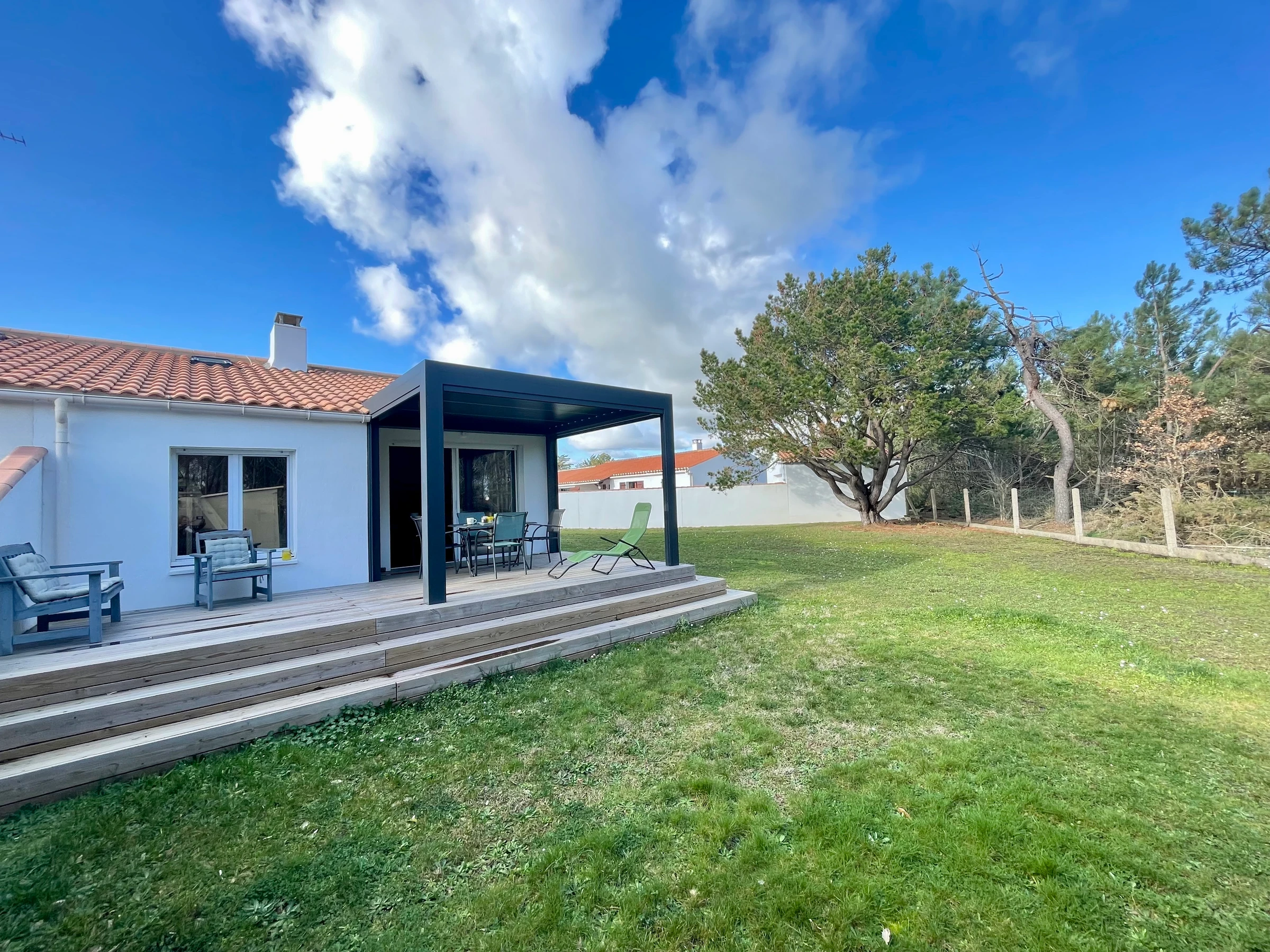 Vom Hauptraum aus haben Sie Zugang zu einer Holzterrasse mit bioklimatischer Pergola (Tisch, Stühle) und zum großen, vollständig umzäunten Garten mit Holzkohlegrill.