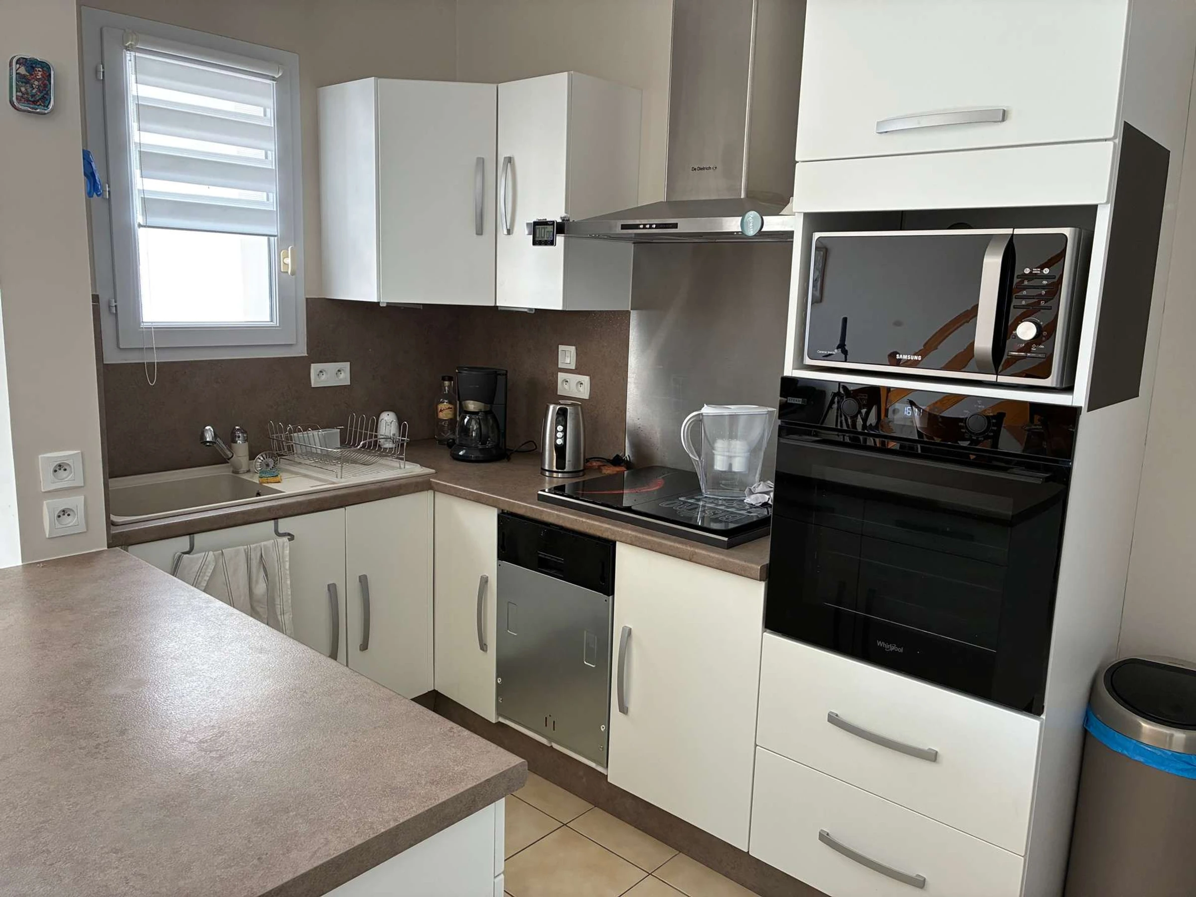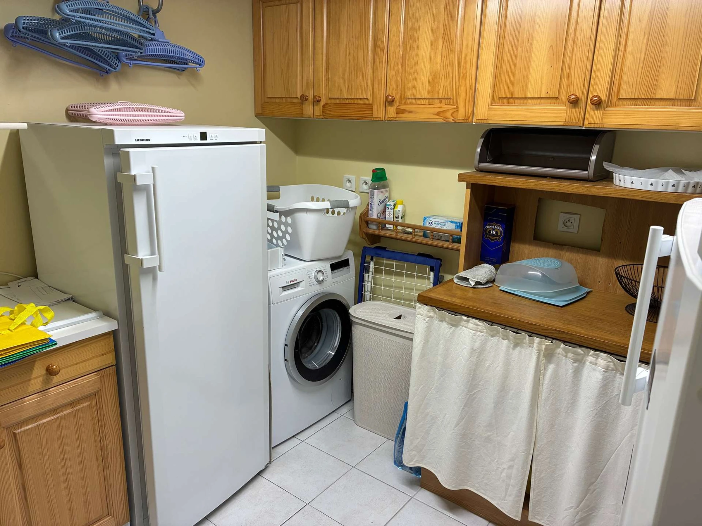 Wohnzimmer mit voll ausgestatteter Küche (Induktionskochfeld, Backofen, Dunstabzugshaube, Mikrowelle, Geschirrspüler und Kleingeräte), Hauswirtschaftsraum (Gefrierschrank, Kühlschrank, Waschmaschine und Abstellraum).
