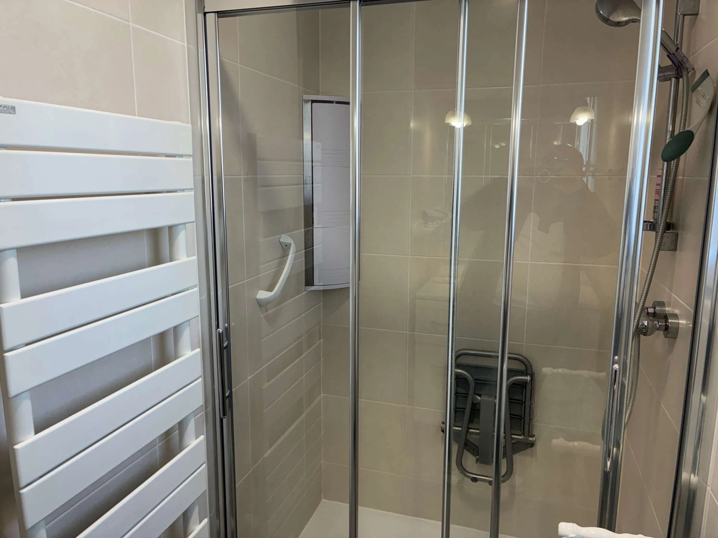 Wohn-/Essbereich mit Sofa, Fernseher und Internetanschluss. Großzügiges Badezimmer mit Waschtisch, ebenerdiger Dusche und beheiztem Handtuchhalter.