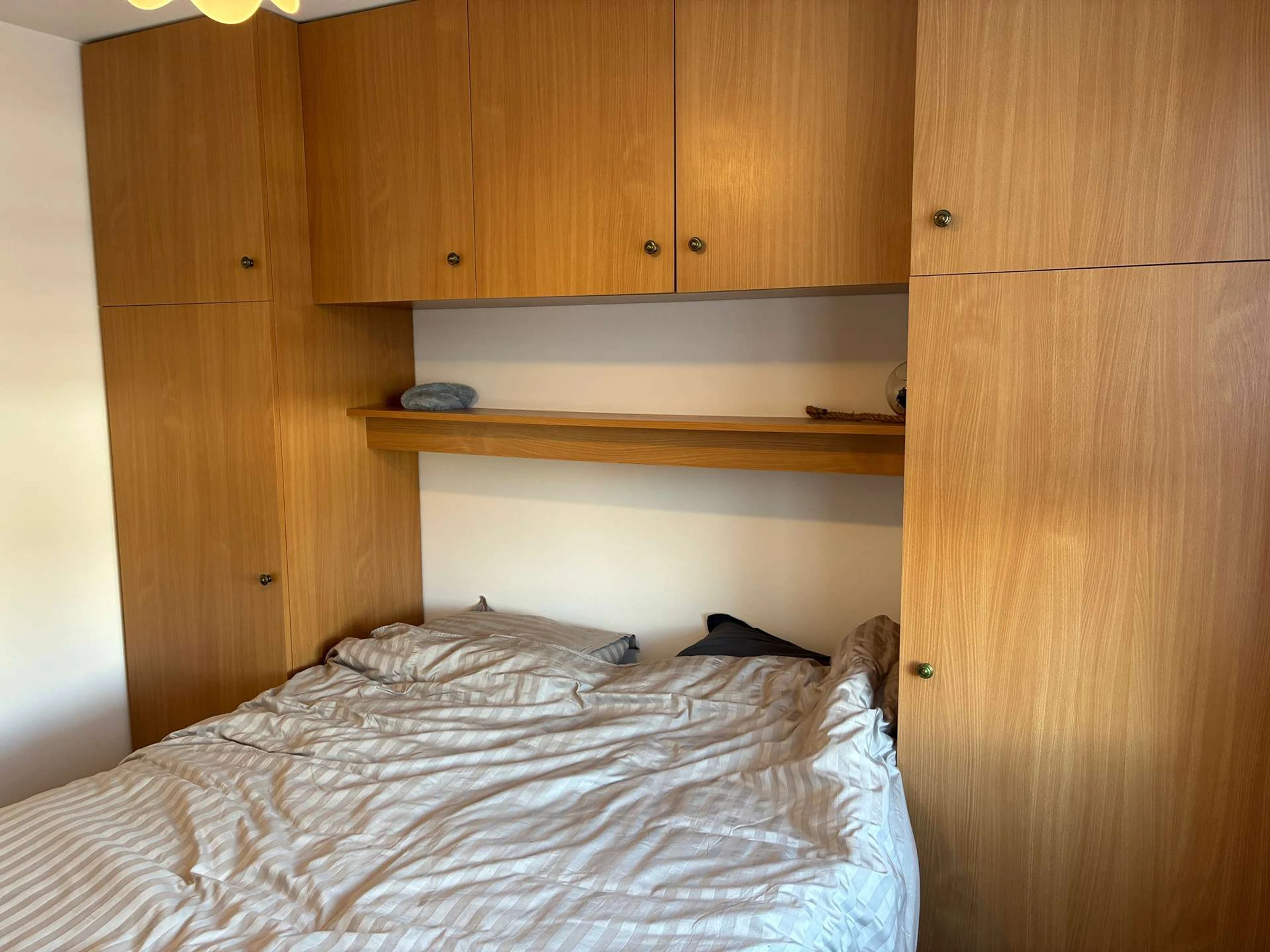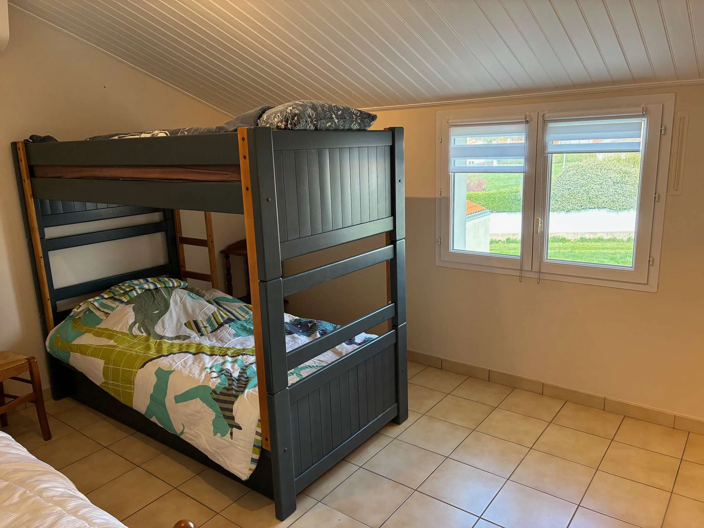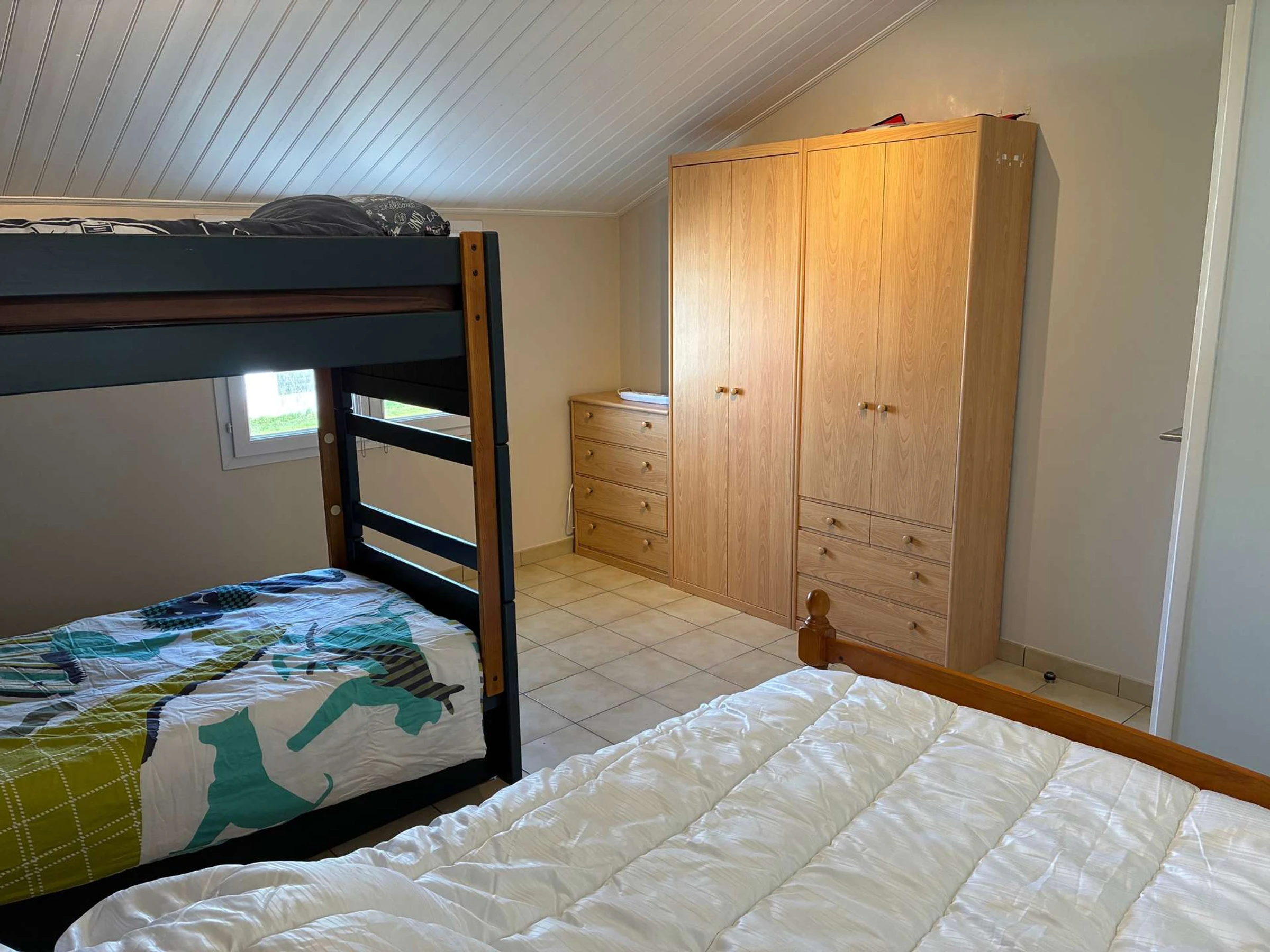 Obergeschoss: Ein großes Schlafzimmer mit Stauraum und Bett. Ein Doppelbett (140 cm) und ein Etagenbett (80 cm).
